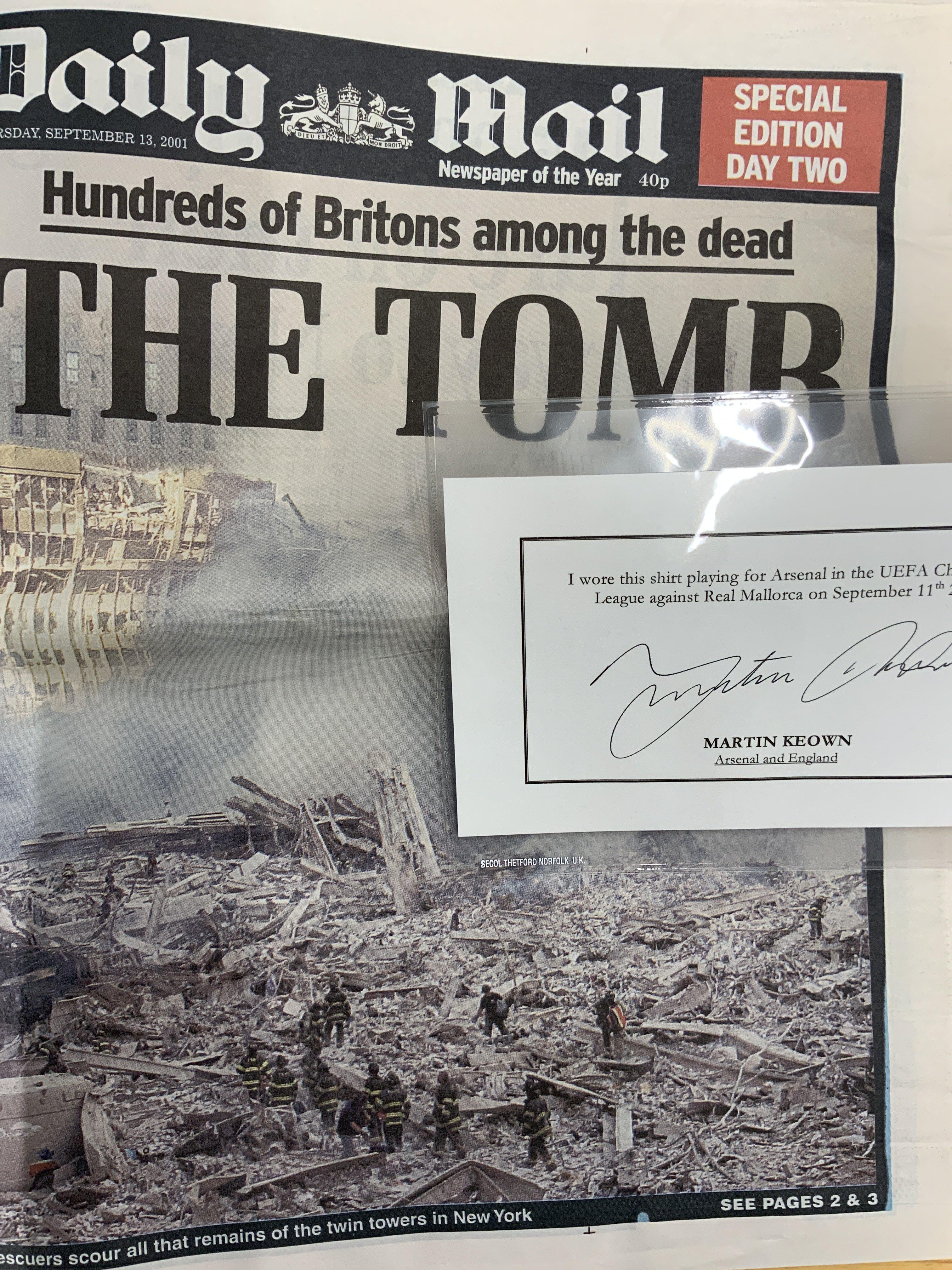 Arsenal 2001 - 2002 Match Worn Football Shirt: Short sleeve blue 3rd kit with Champions League badging to sleeve. Keown number 5 to rear. Dreamcast sponsor. Signed COA stating I wore this shirt v Real Mallorca on September 11th 2001 a historic day in history.