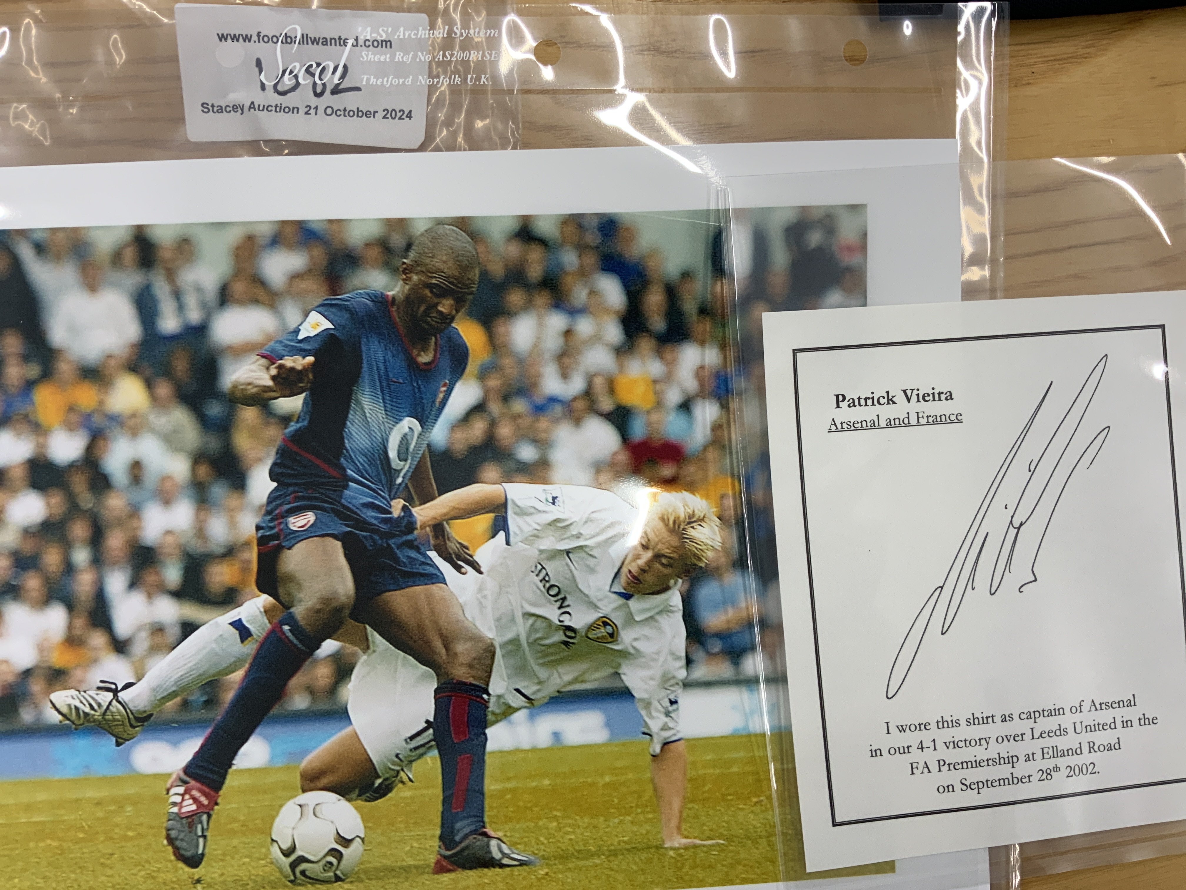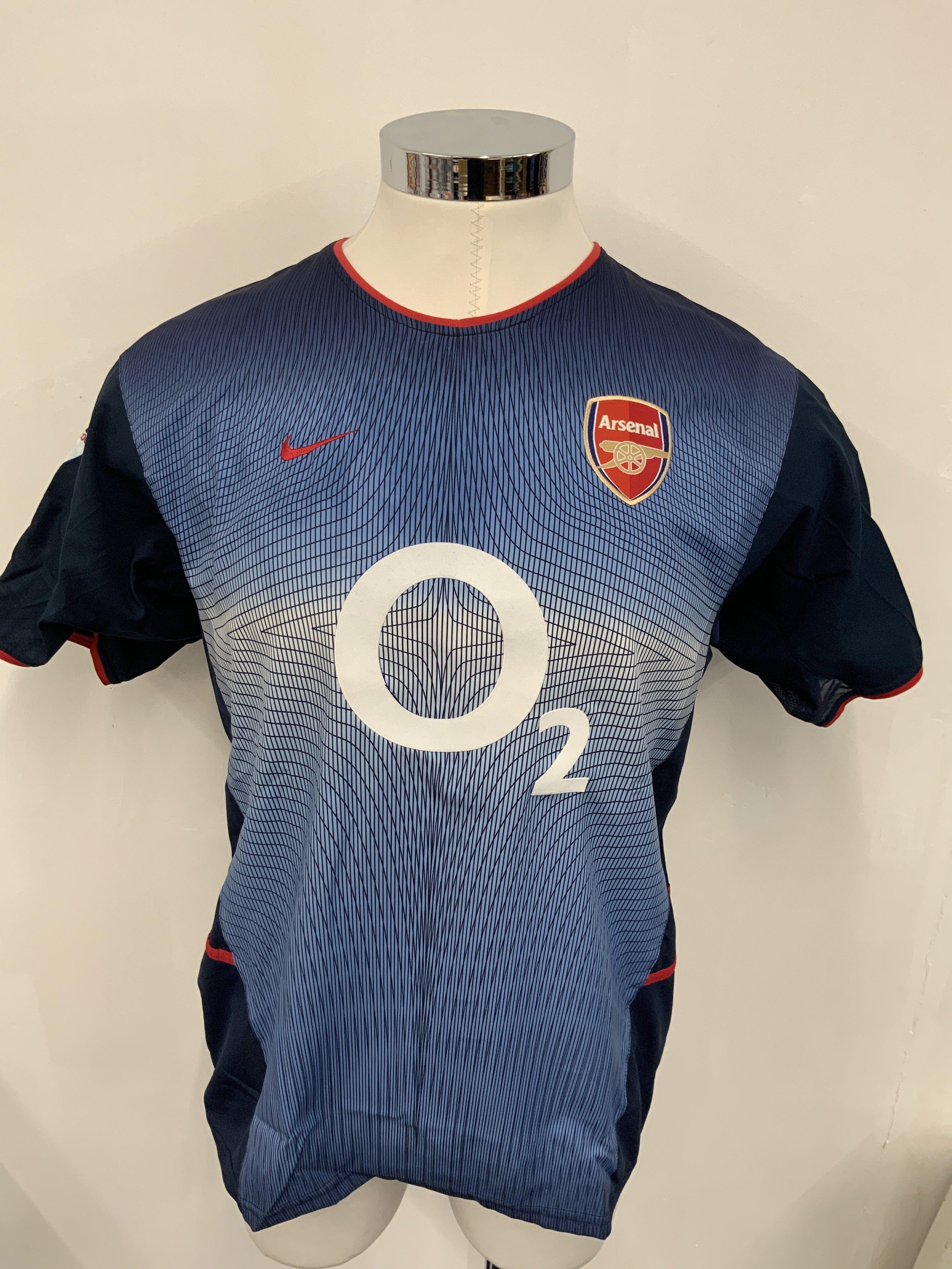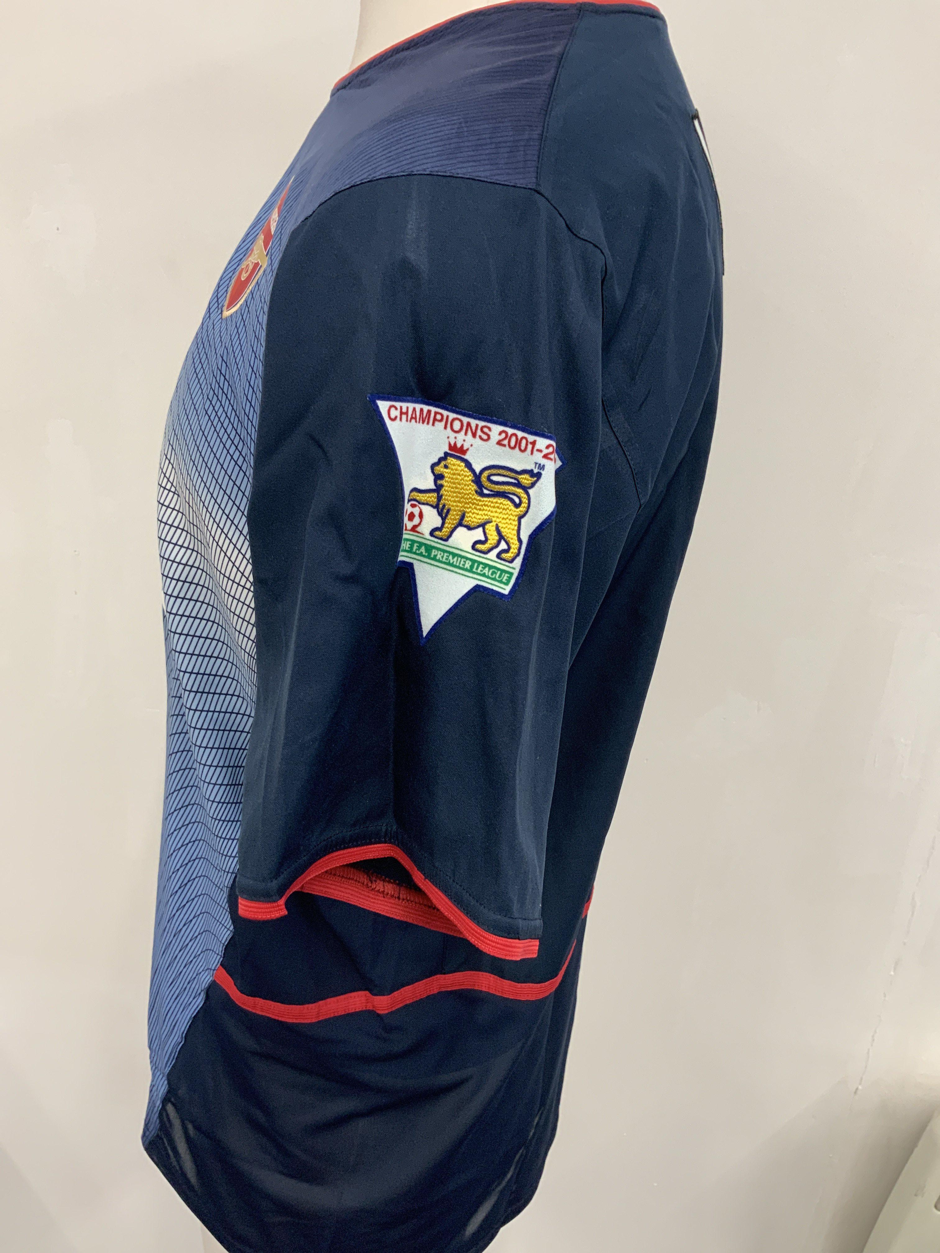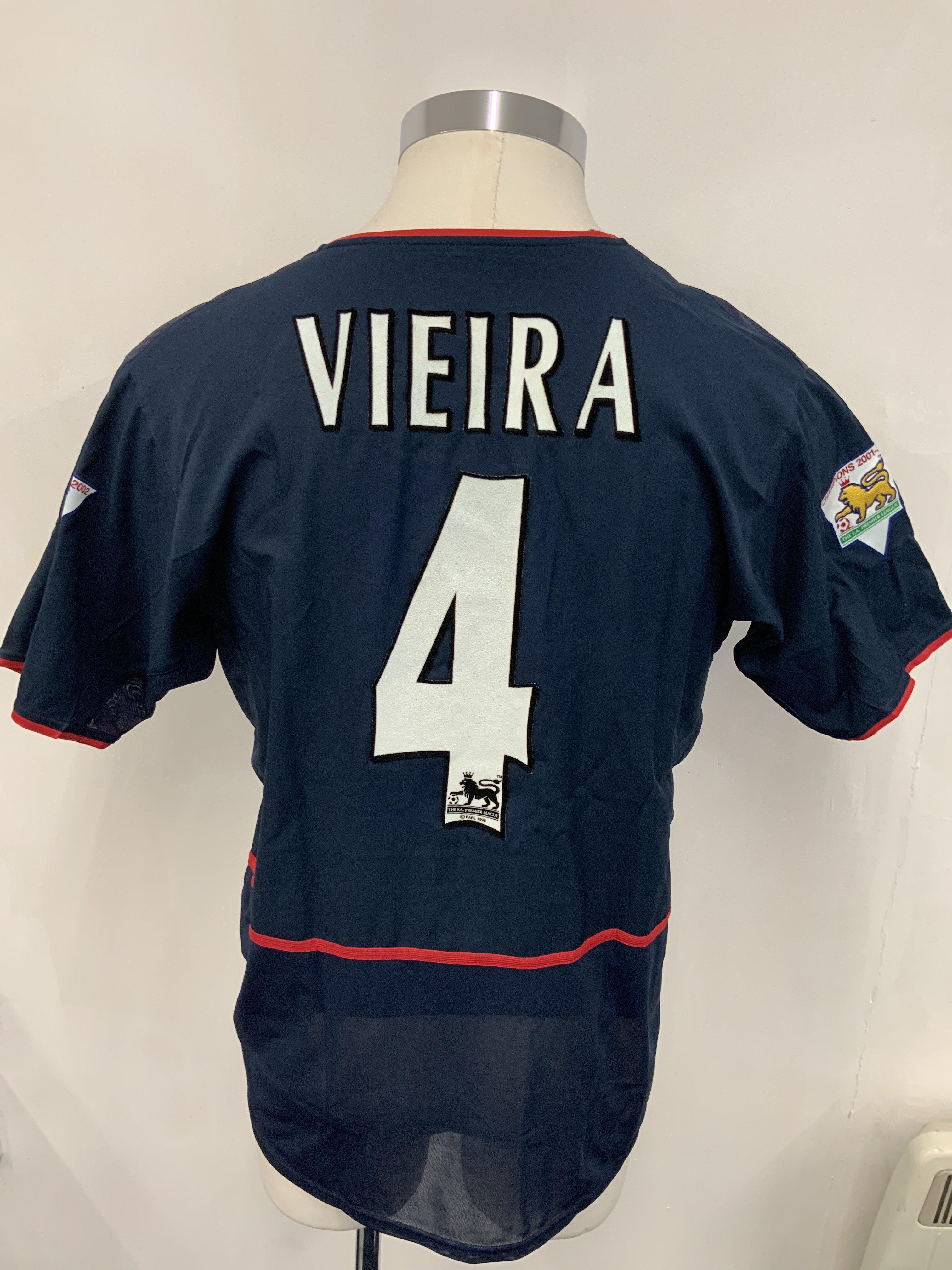Arsenal 2002 - 2003 Match Worn Blue Football Shirt: Short sleeve blue away kit with Premier League badging to sleeve stating Champions 2001 - 2002. Vieira number 4 to rear. 02 sponsor. Signed COA stating I wore this shirt v Leeds on September 28th 2002. Press photo of him wearing this shirt.