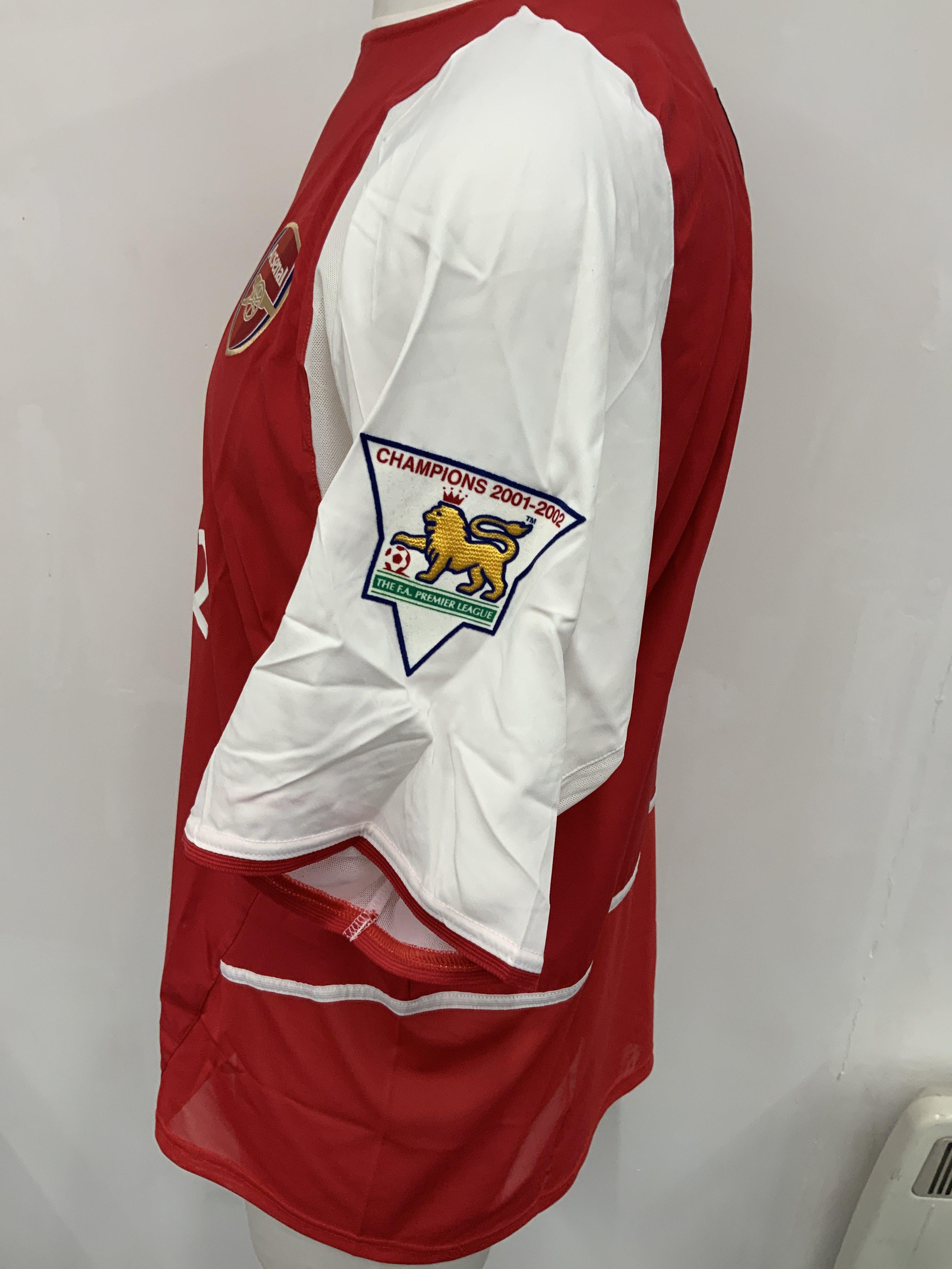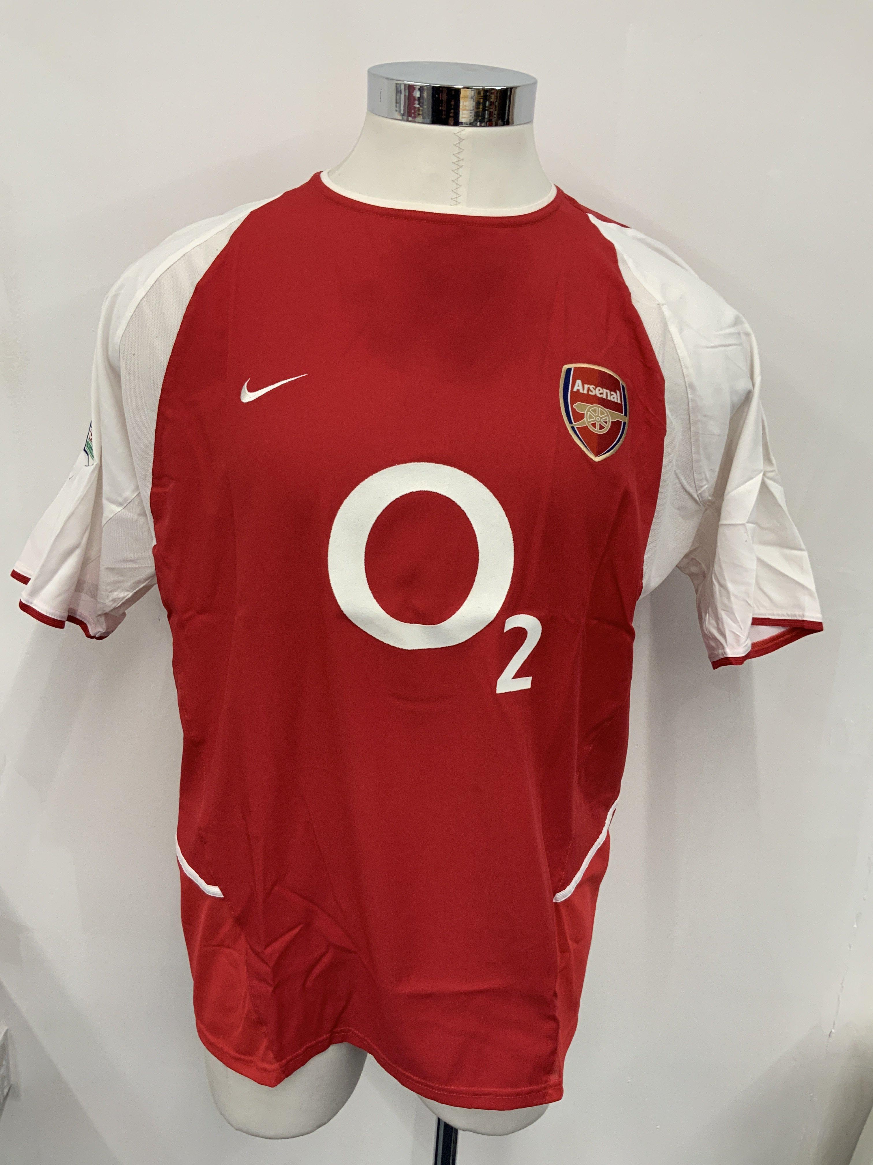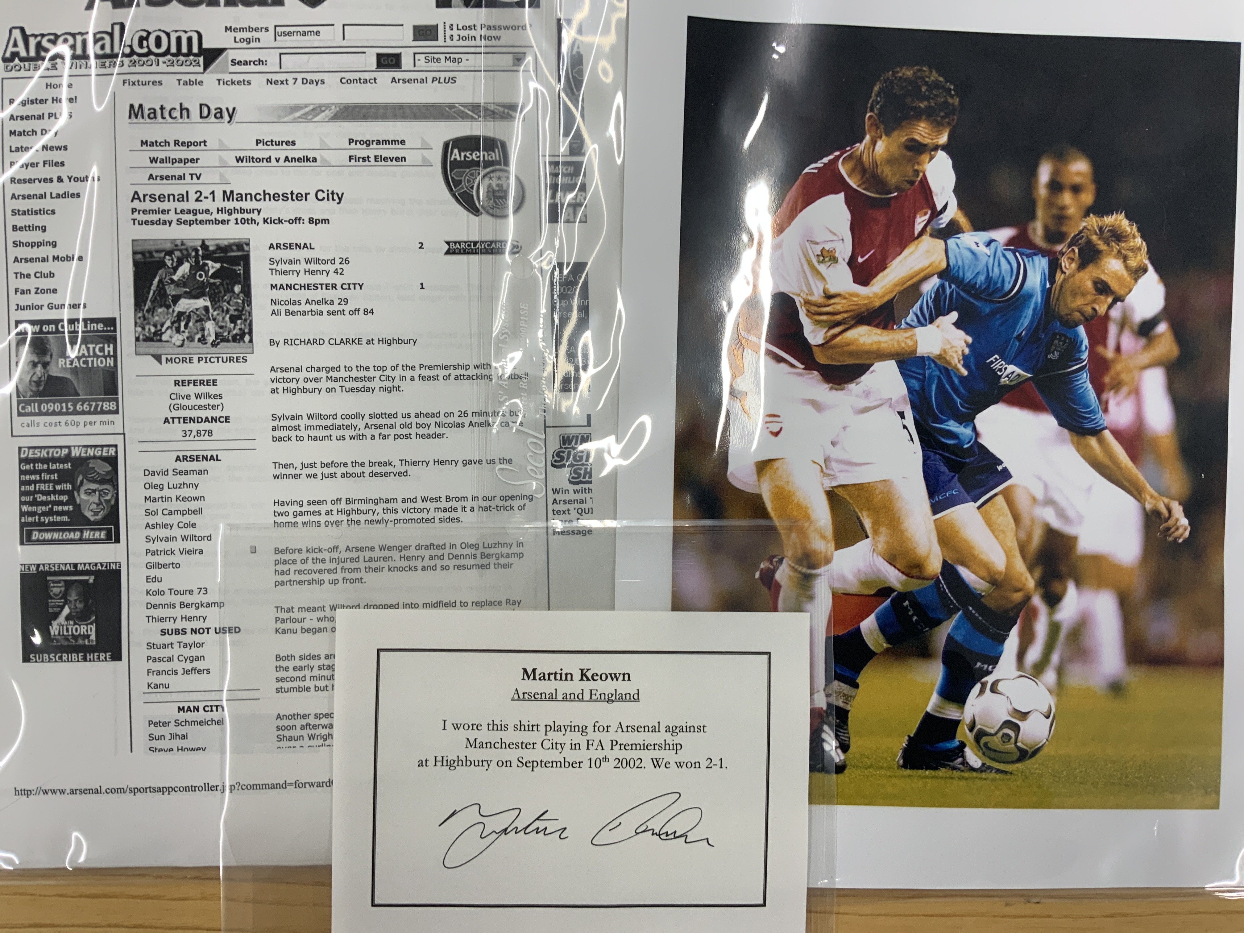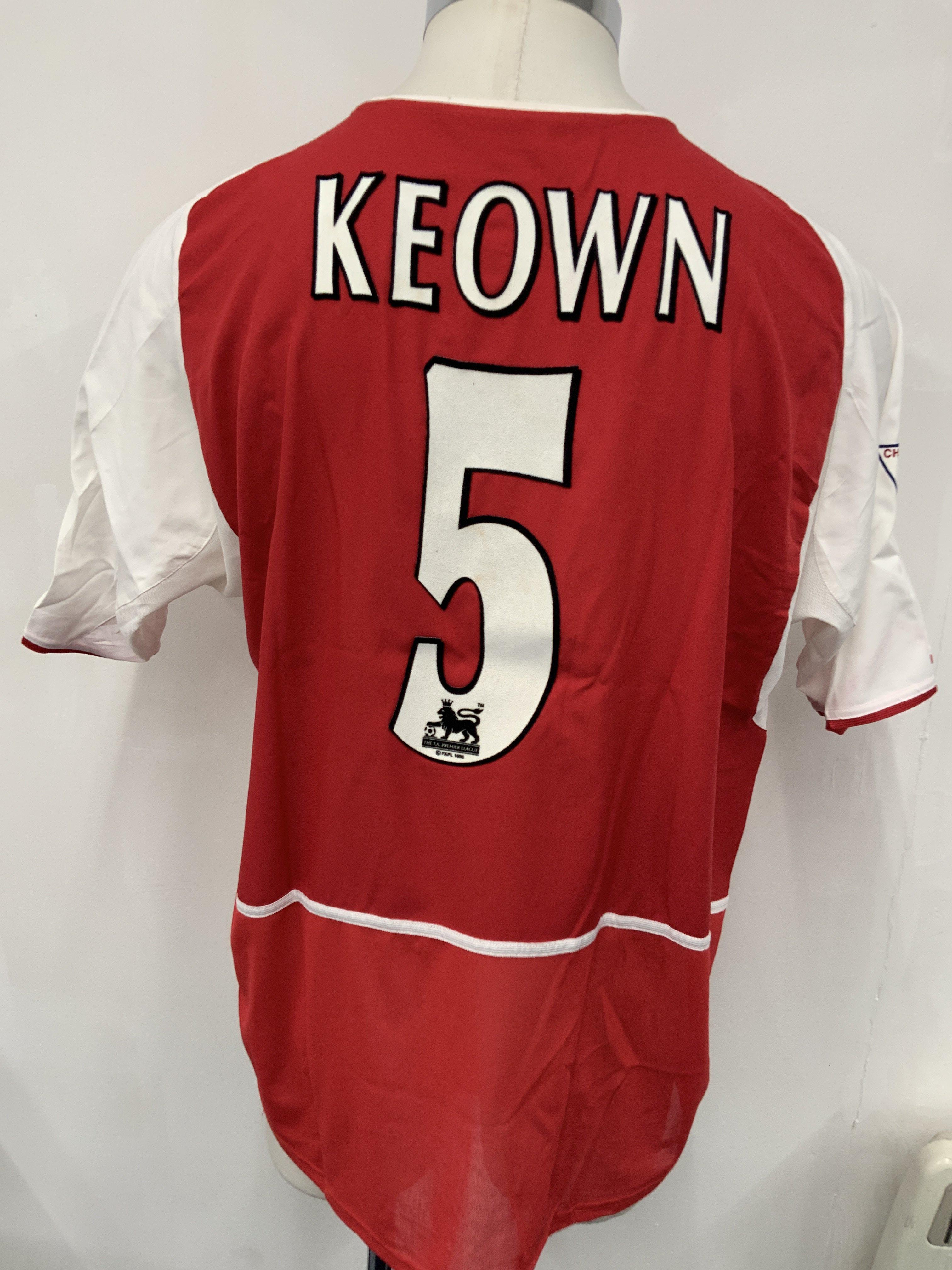 Arsenal 2002 - 2003 Match Worn Home Football Shirt: Short sleeve red home kit with Premier League badging to sleeve which states 2001 - 2002 Champions. Keown number 5 to rear. 02 sponsor. Signed COA stating I wore this shirt v Manchester City on September 10th 2002. C/W press photo of him wearing the shirt, programme and match report.