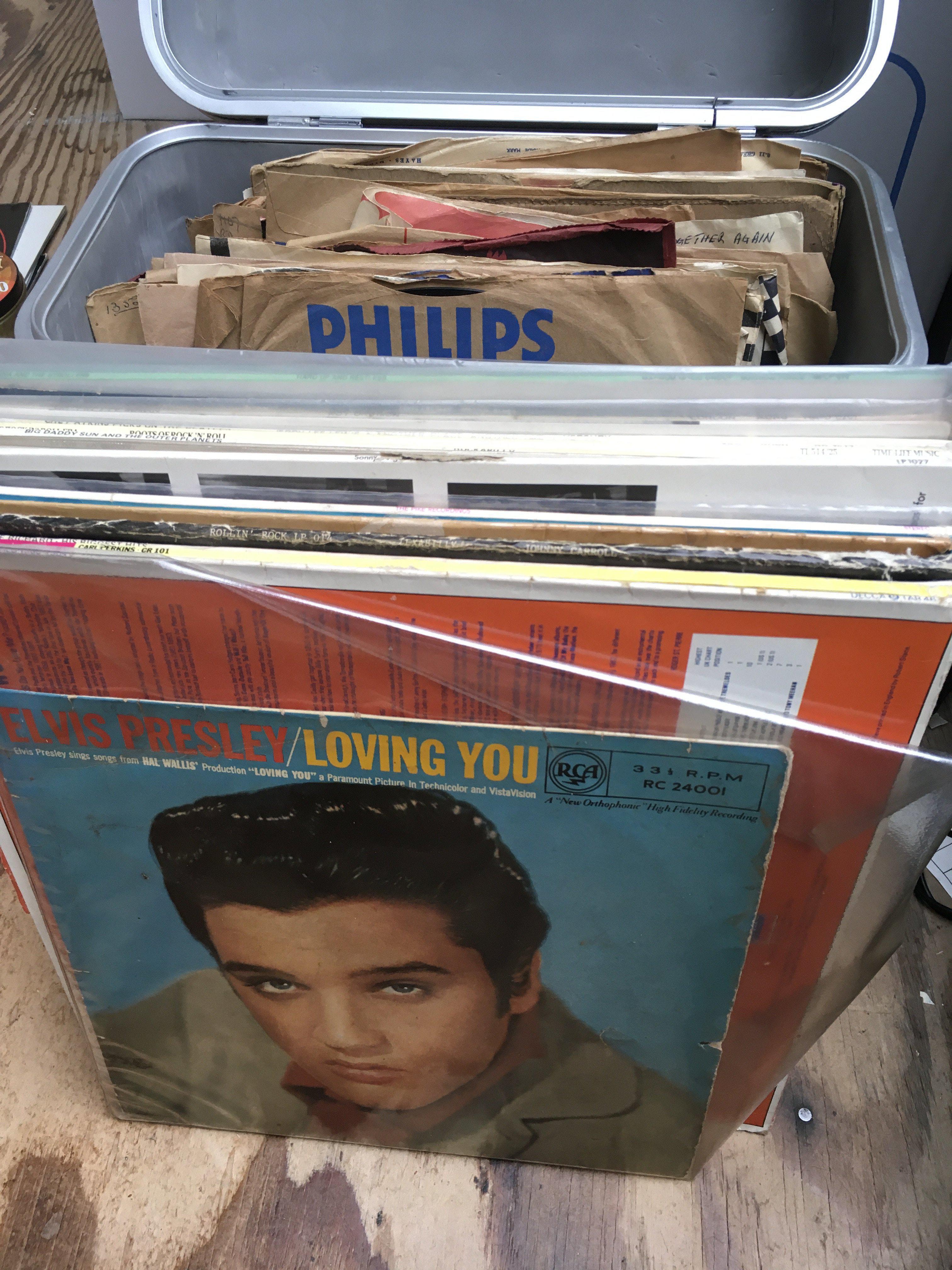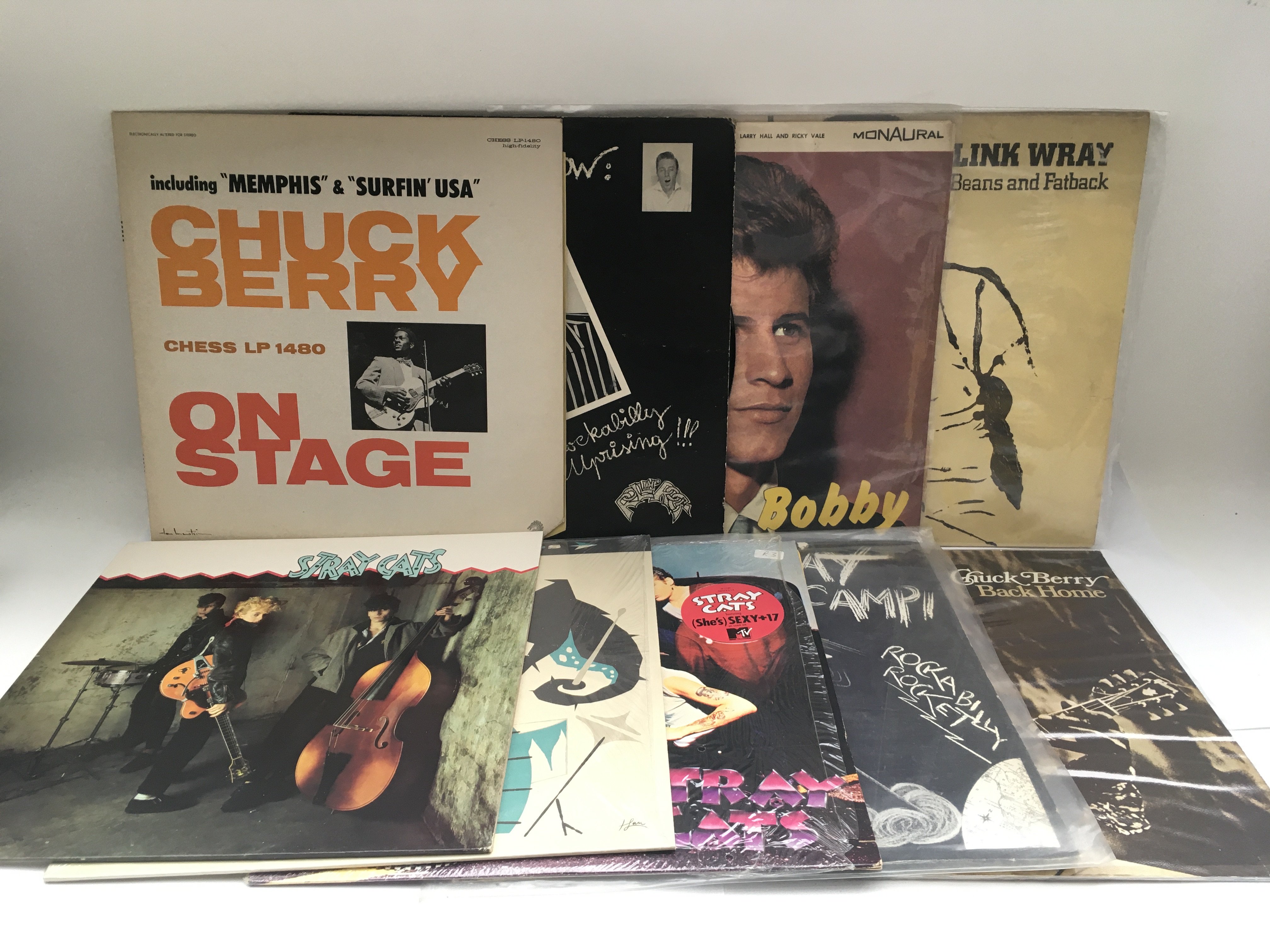 A collection of rock n roll and rockabilly LPs and 78s by various artists including Elvis Presley, Link Wray, Stray Cats and others.