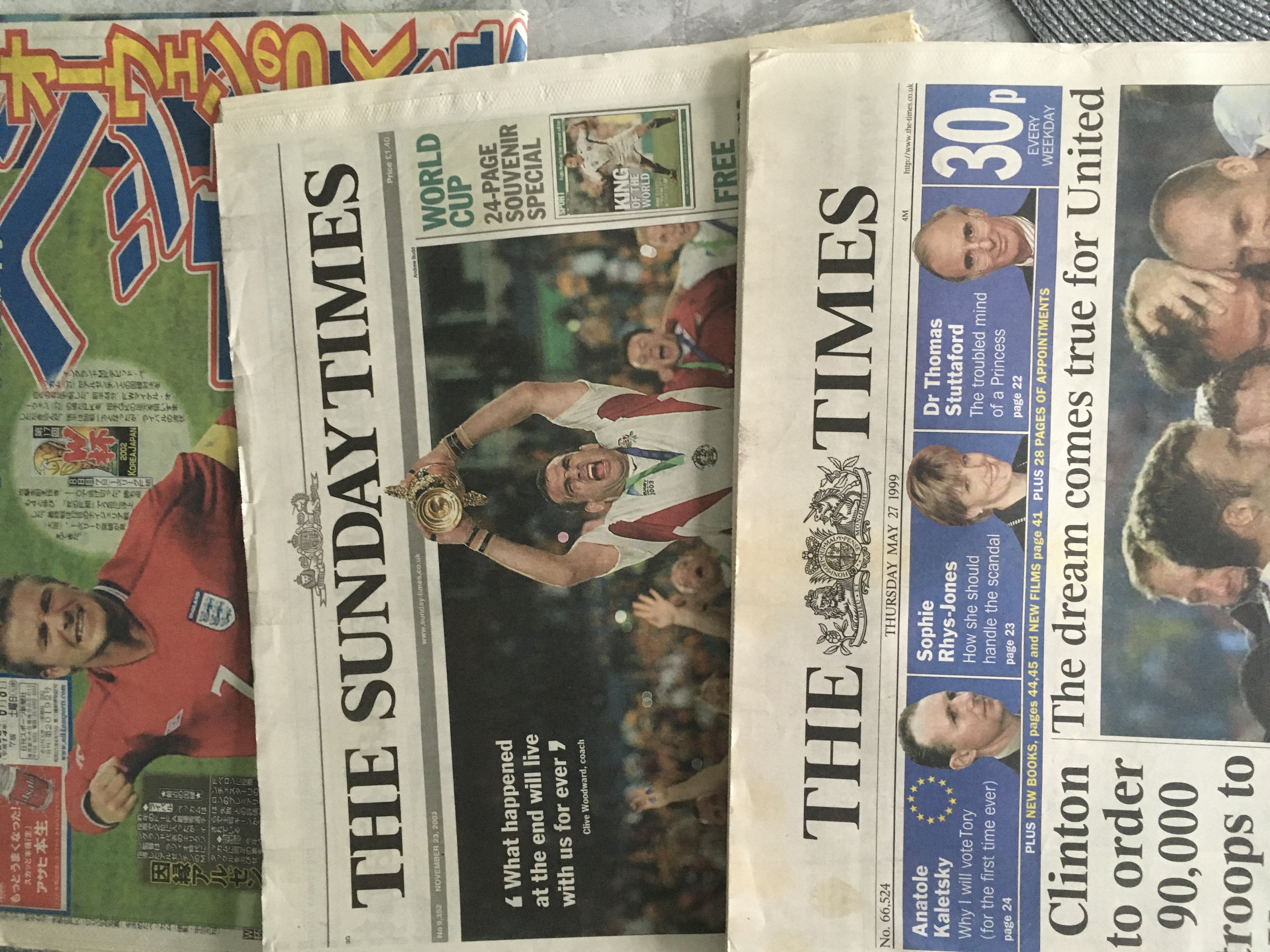 England + World Cup Football Newspapers: Large quantity covering 2002 World Cup purchased at the tournament, 1999 Manchester United treble a few other big matches in sport and even Southampton in the 1976 FA Cup Final. Instructions to sell.