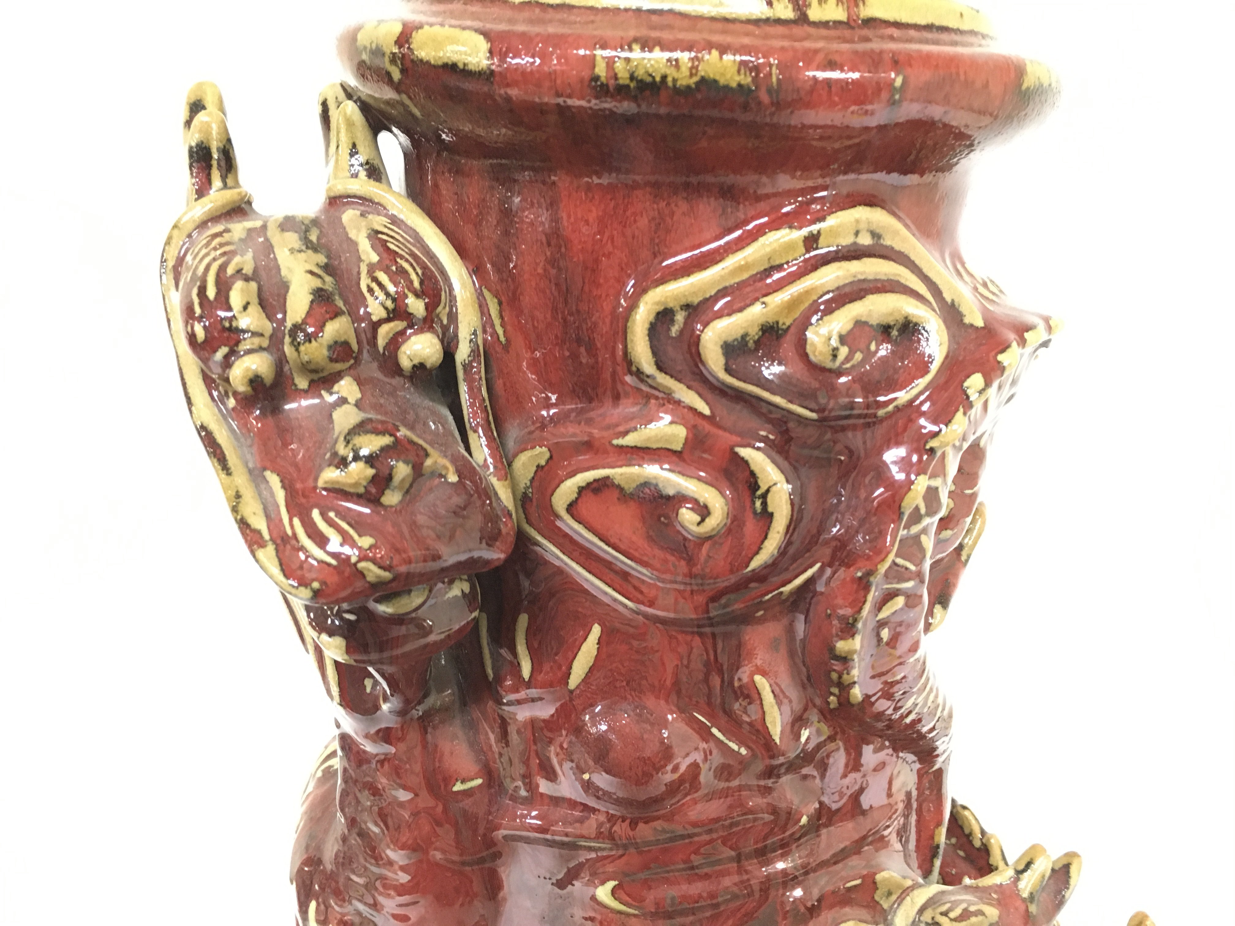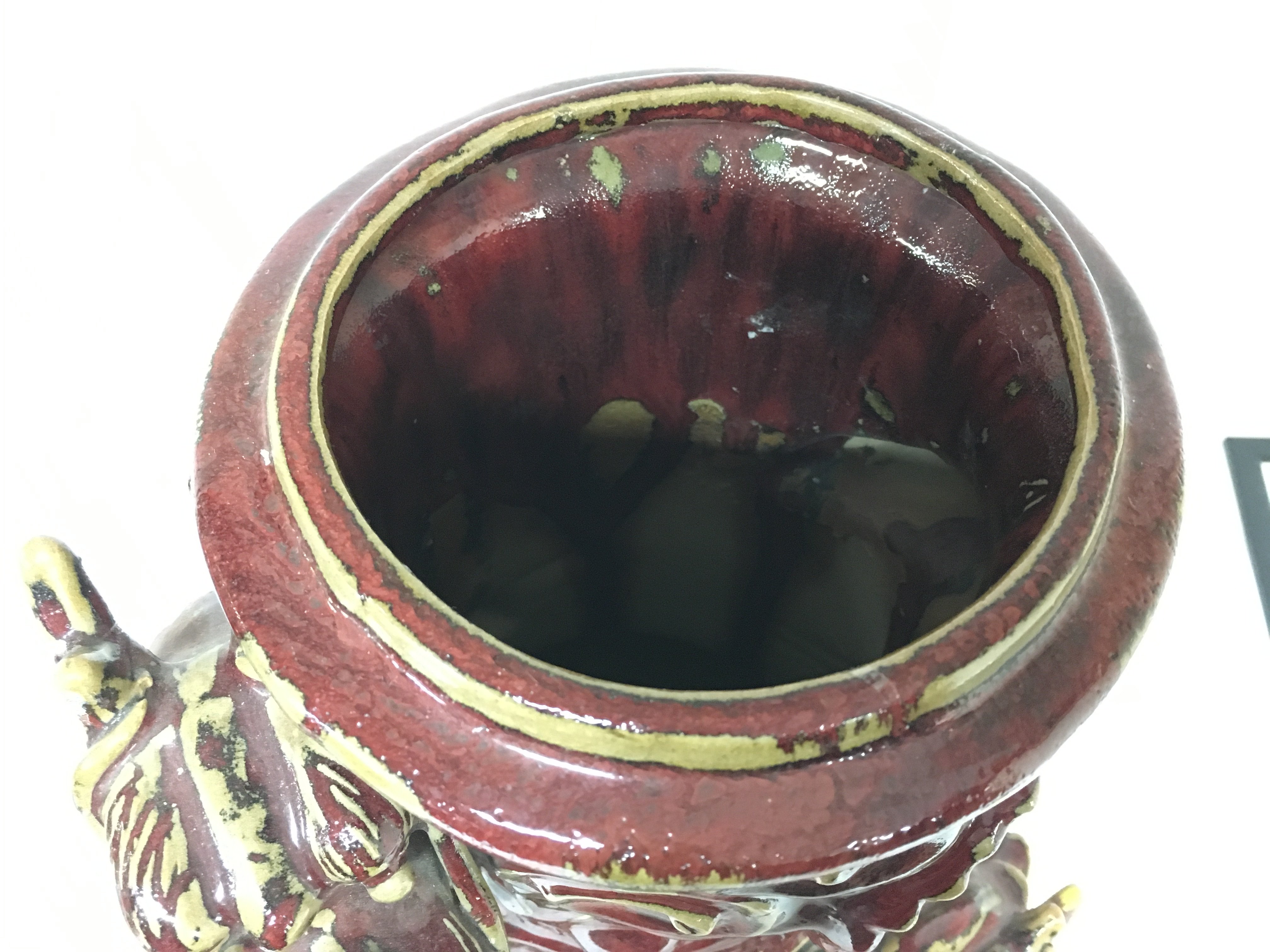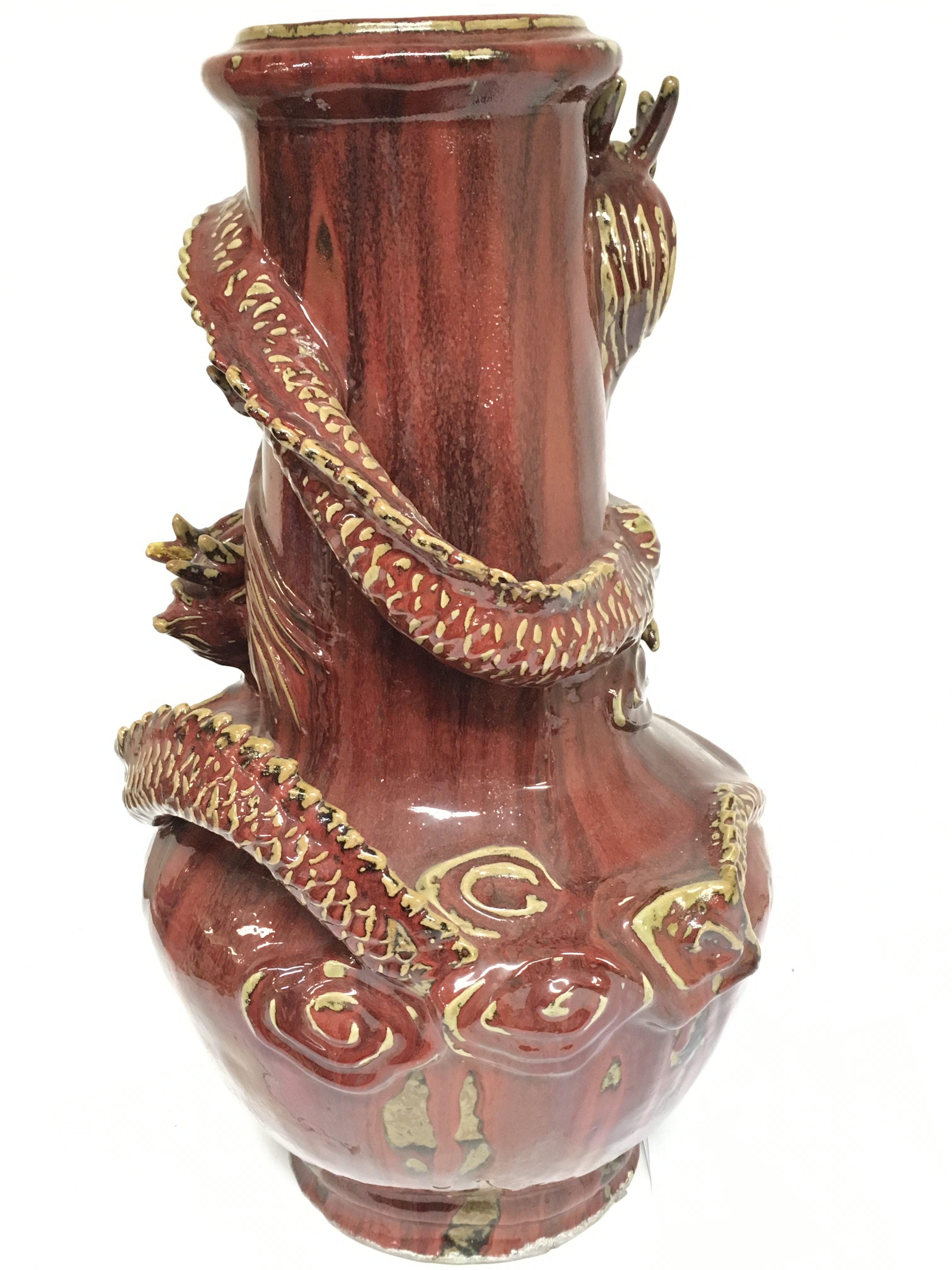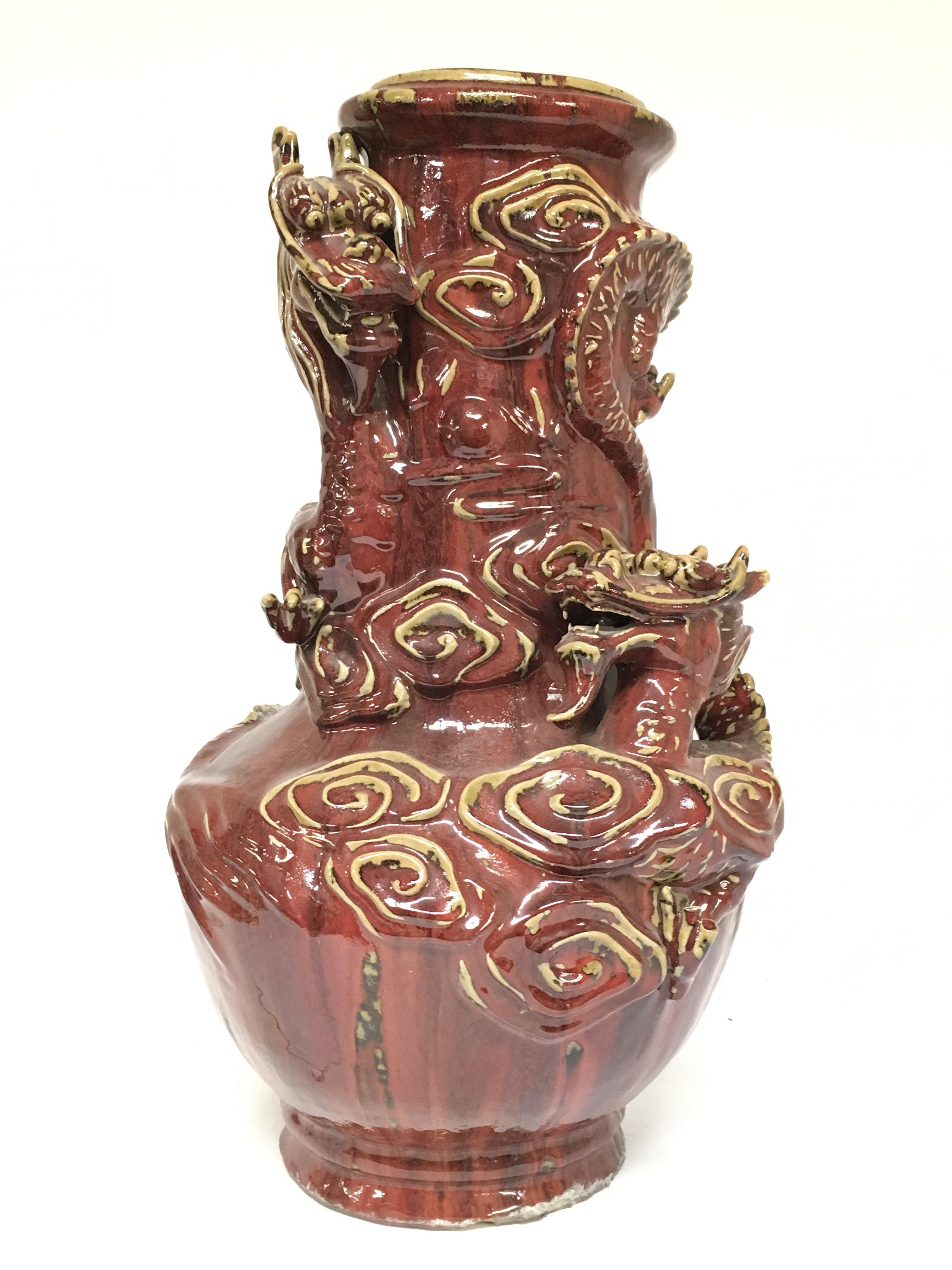 A large Chinese Sang De Boeuf Vase with relief dragons and cloud decoration, 56cm tall. This lot cannot be posted