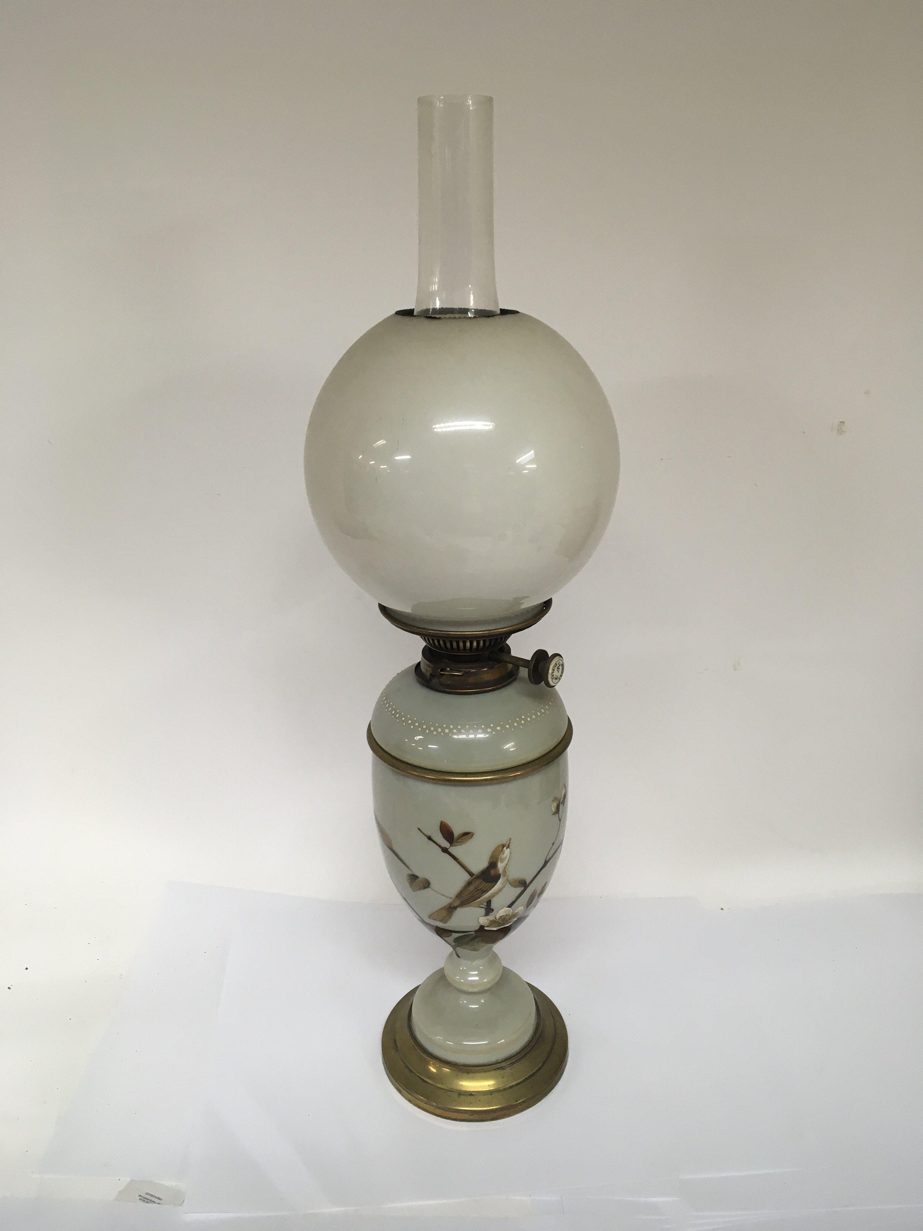 A Victorian opaque glass and enamel decorated oil lamp with an opaque shade and glass chimney. NO RESERVE