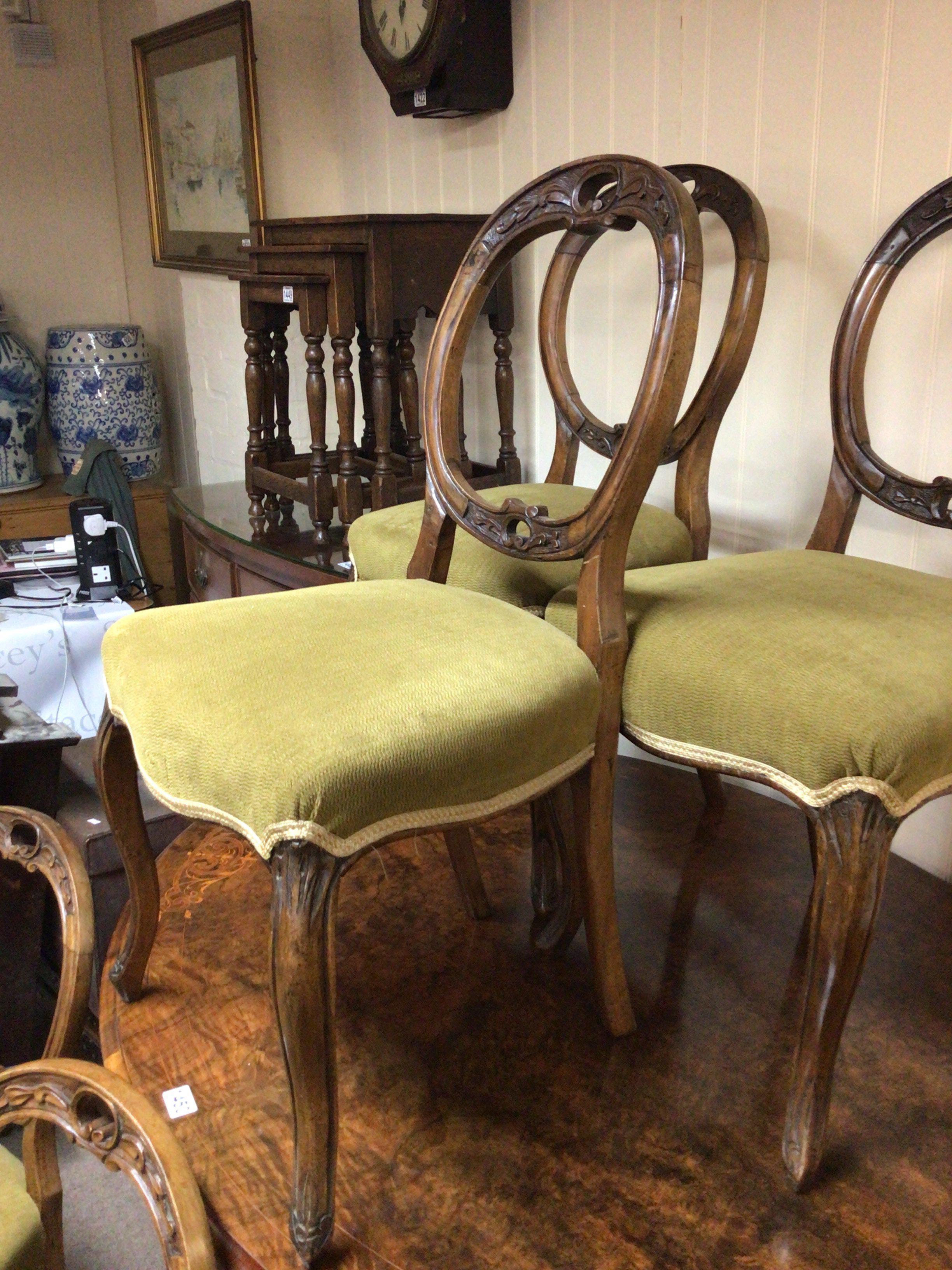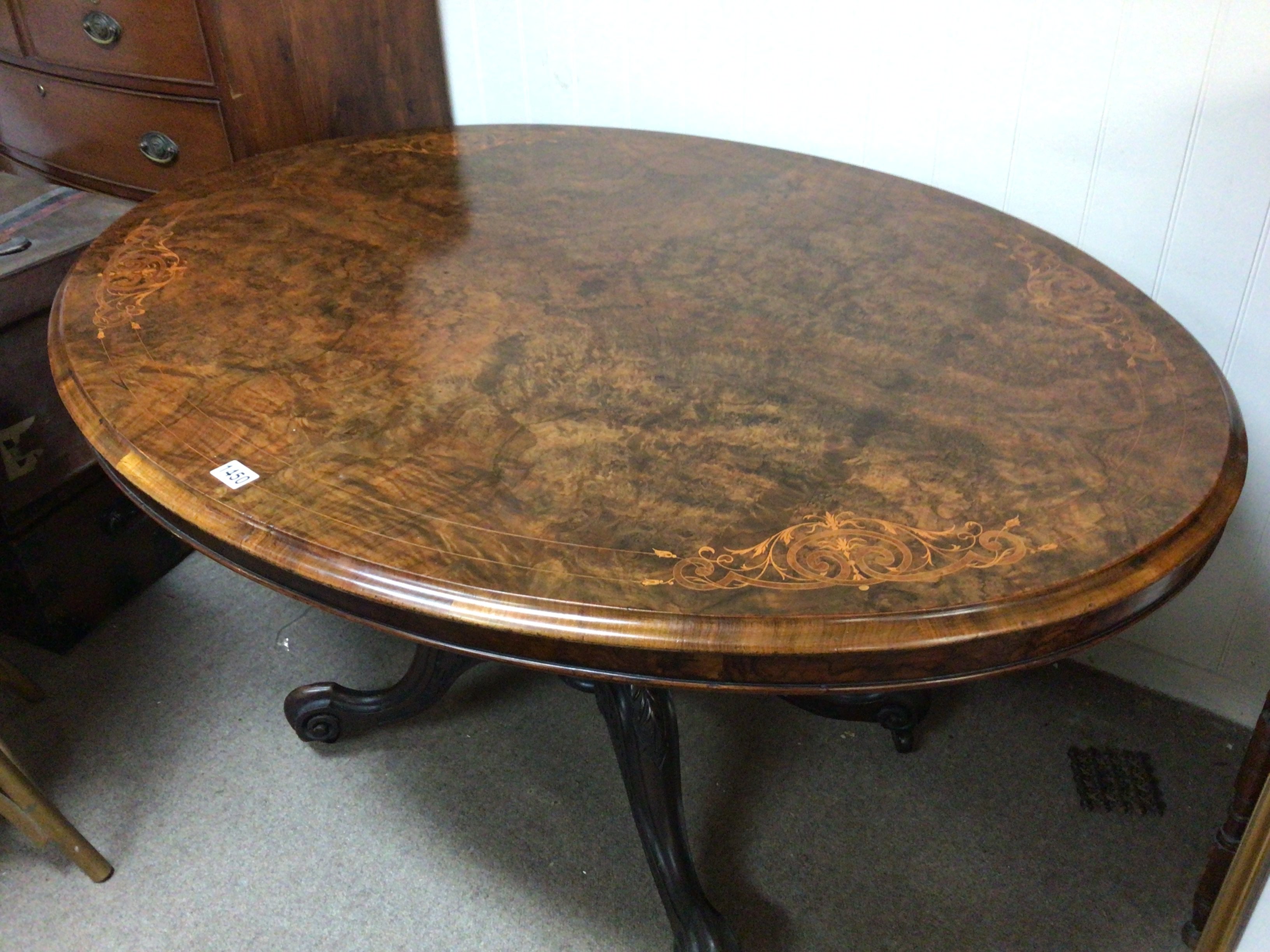 A quality Victorian burr walnut inlaid loo table the oval hinges top on a carved base with scroll feet and a set of six Victorian dining chairs with cabriole legs. Table top messures 135cmx103 cm