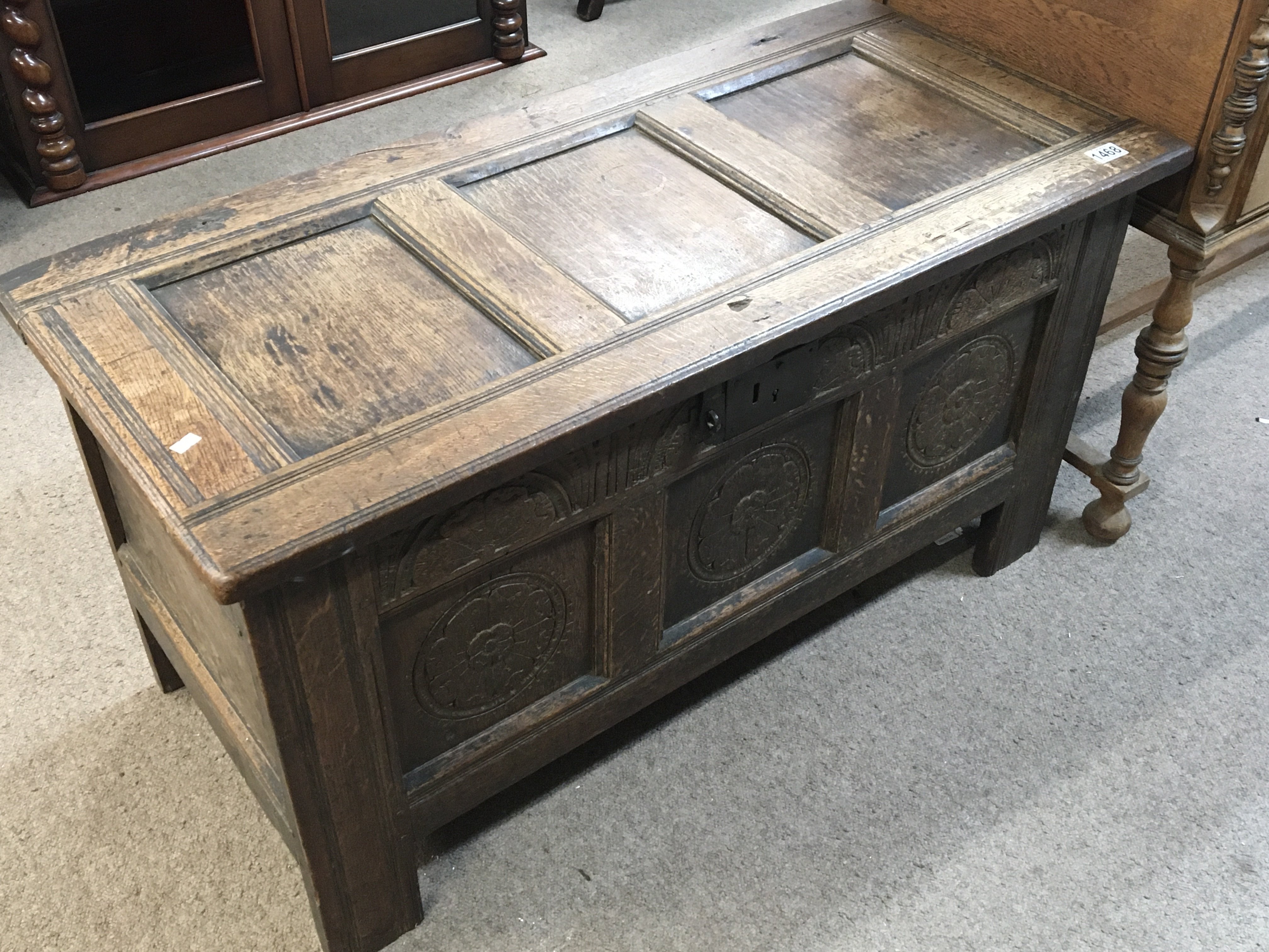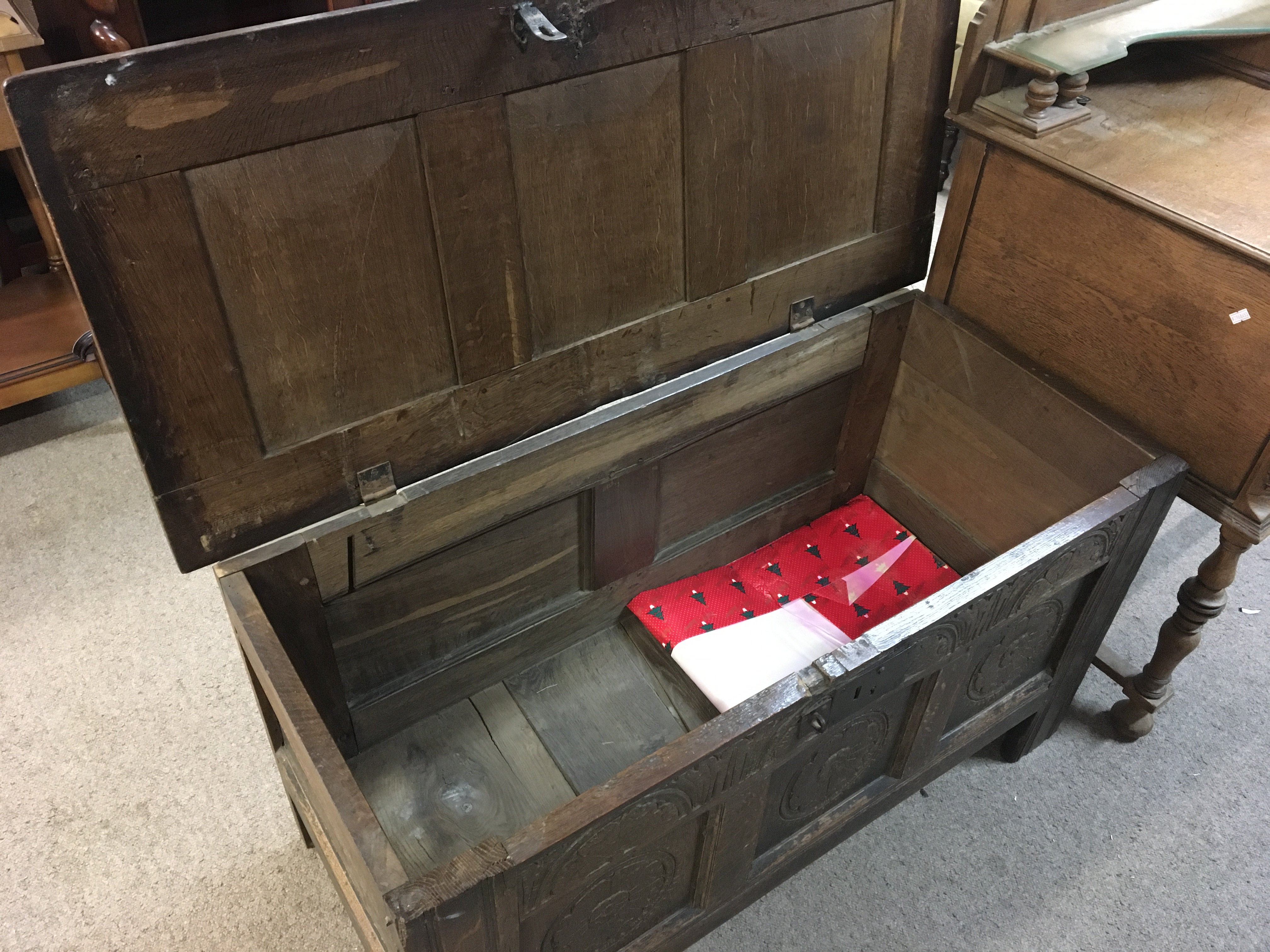 A late 18th century English oak vernacular chest with a hinged panel top above further carved panels. length 105cm x 48cm