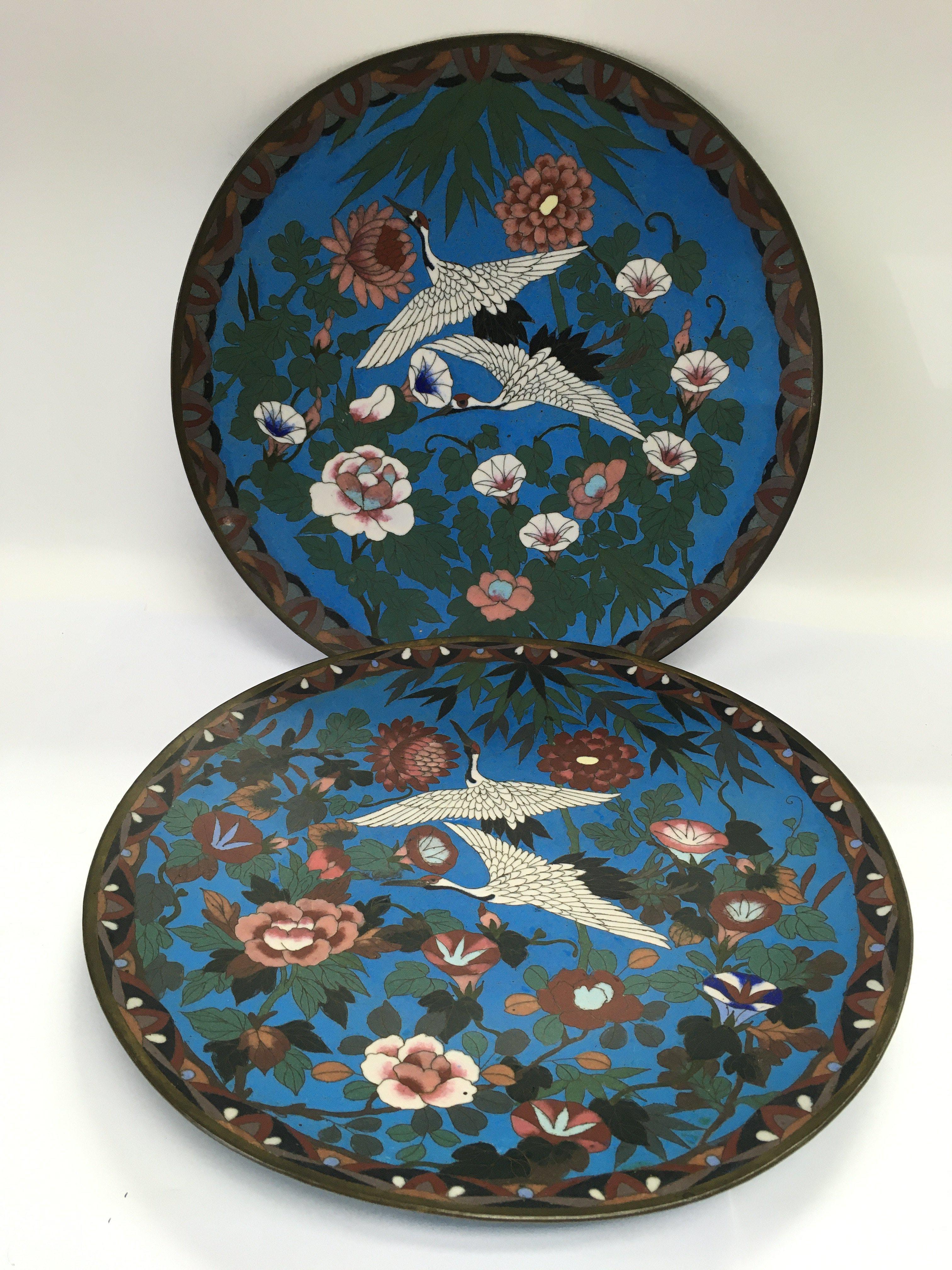 A pair of cloisonne dishes decorated with storks, approx diameter 30cm. Shipping category D. NO RESERVE