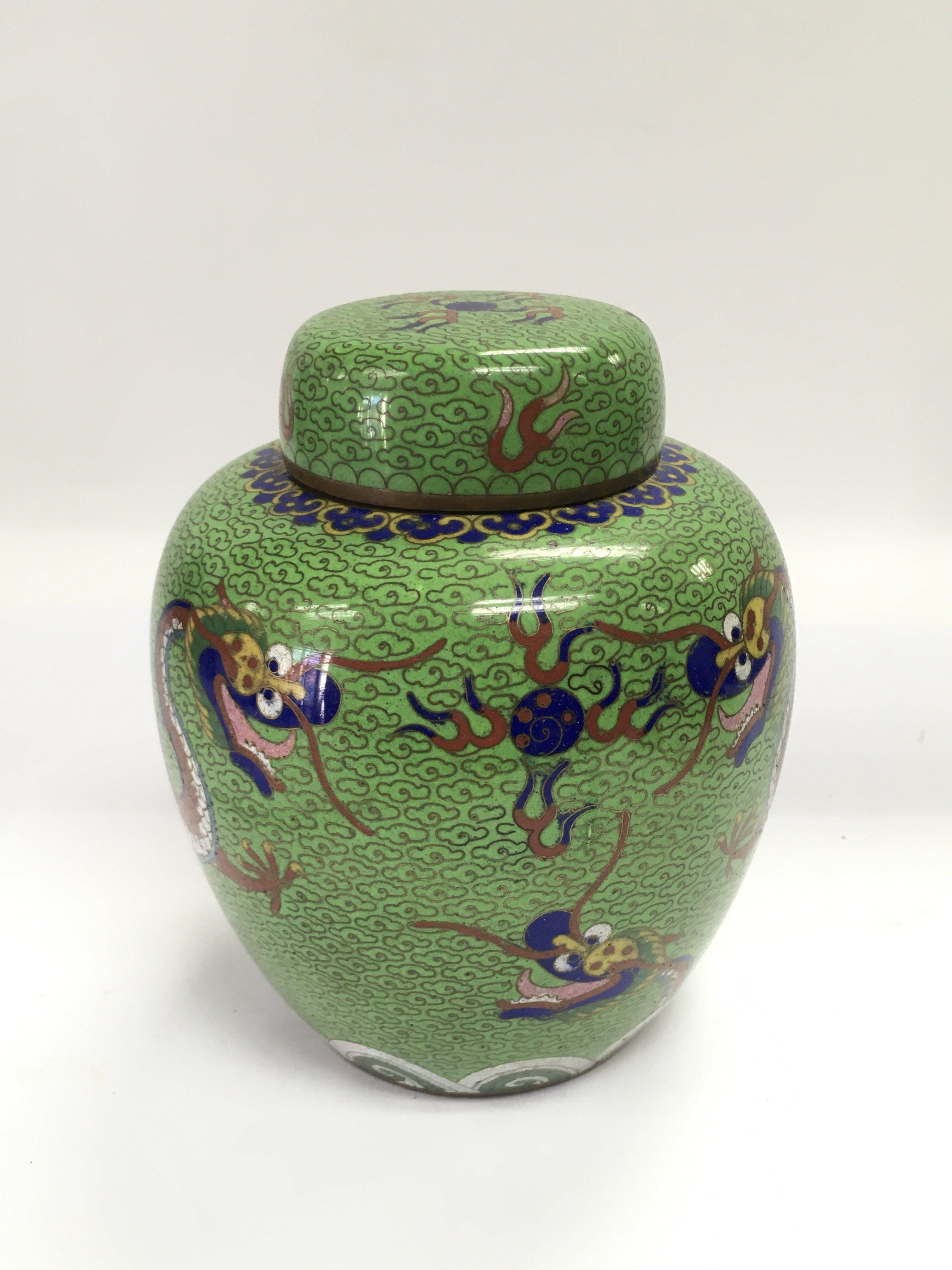 A Cloisonne ginger jar and cover decorated with dragons, approx height 15cm. Shipping category D. NO RESERVE