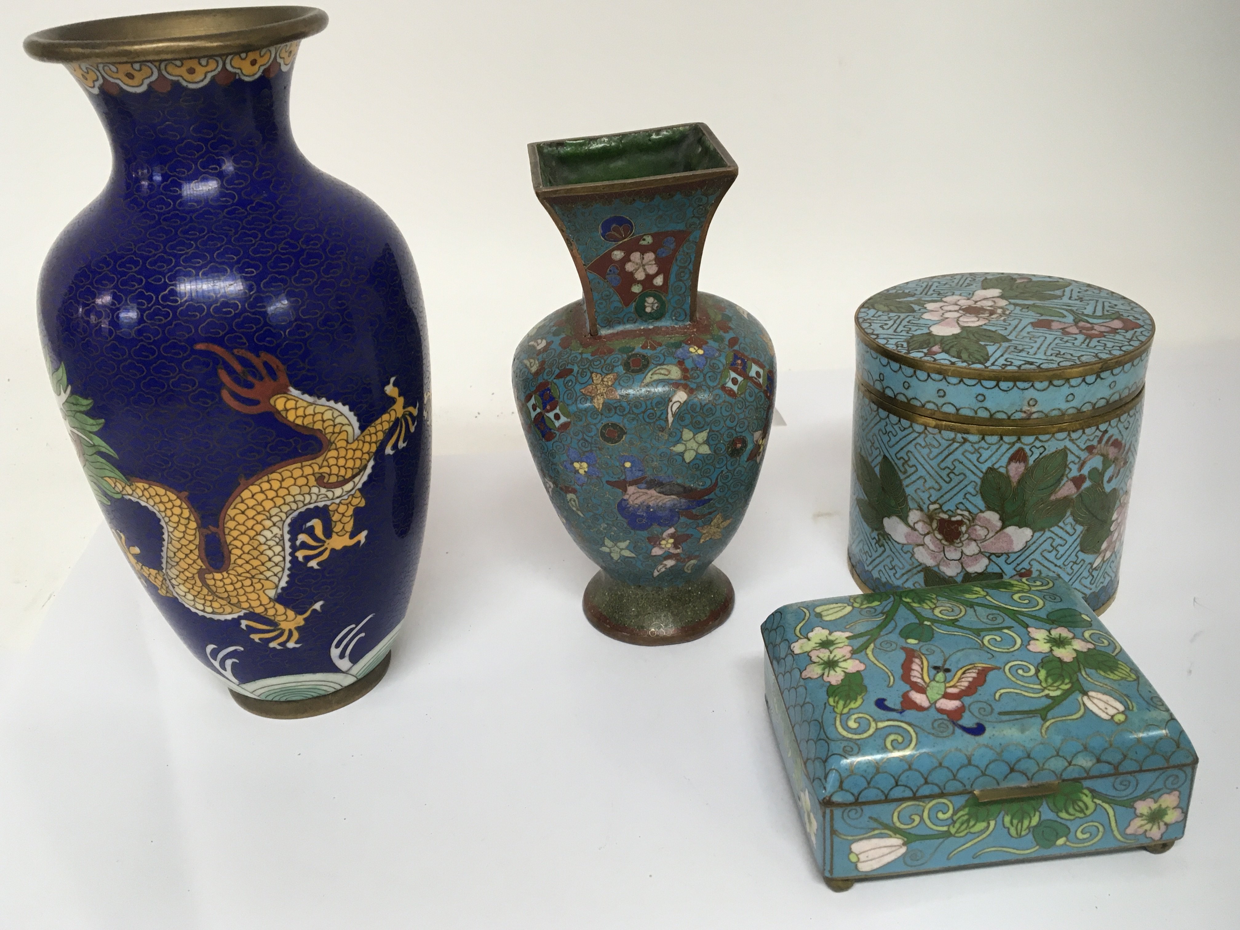 A collection of cloisonn a jar and cover two vases and a box with a hinged lid. NO RESERVE