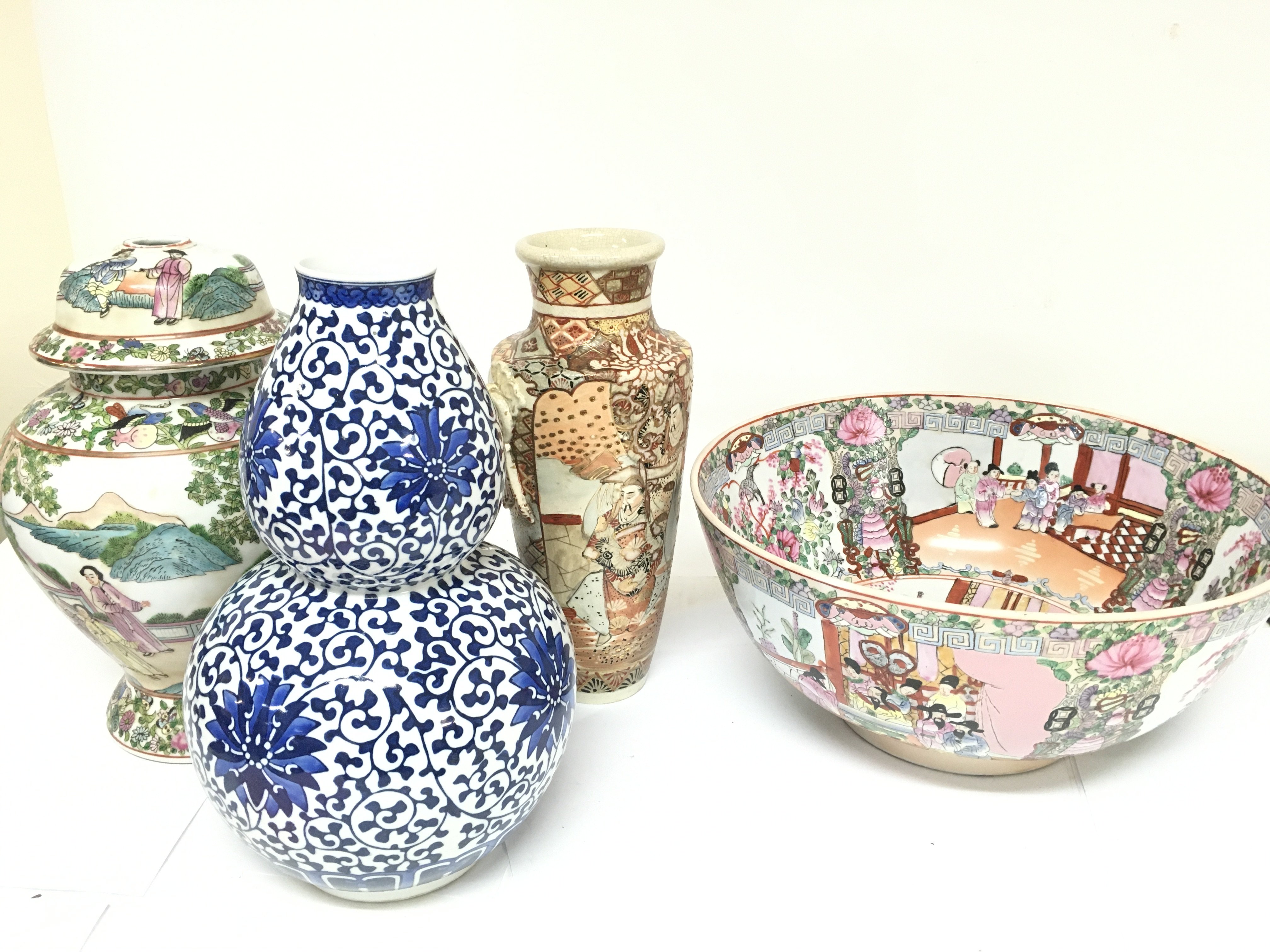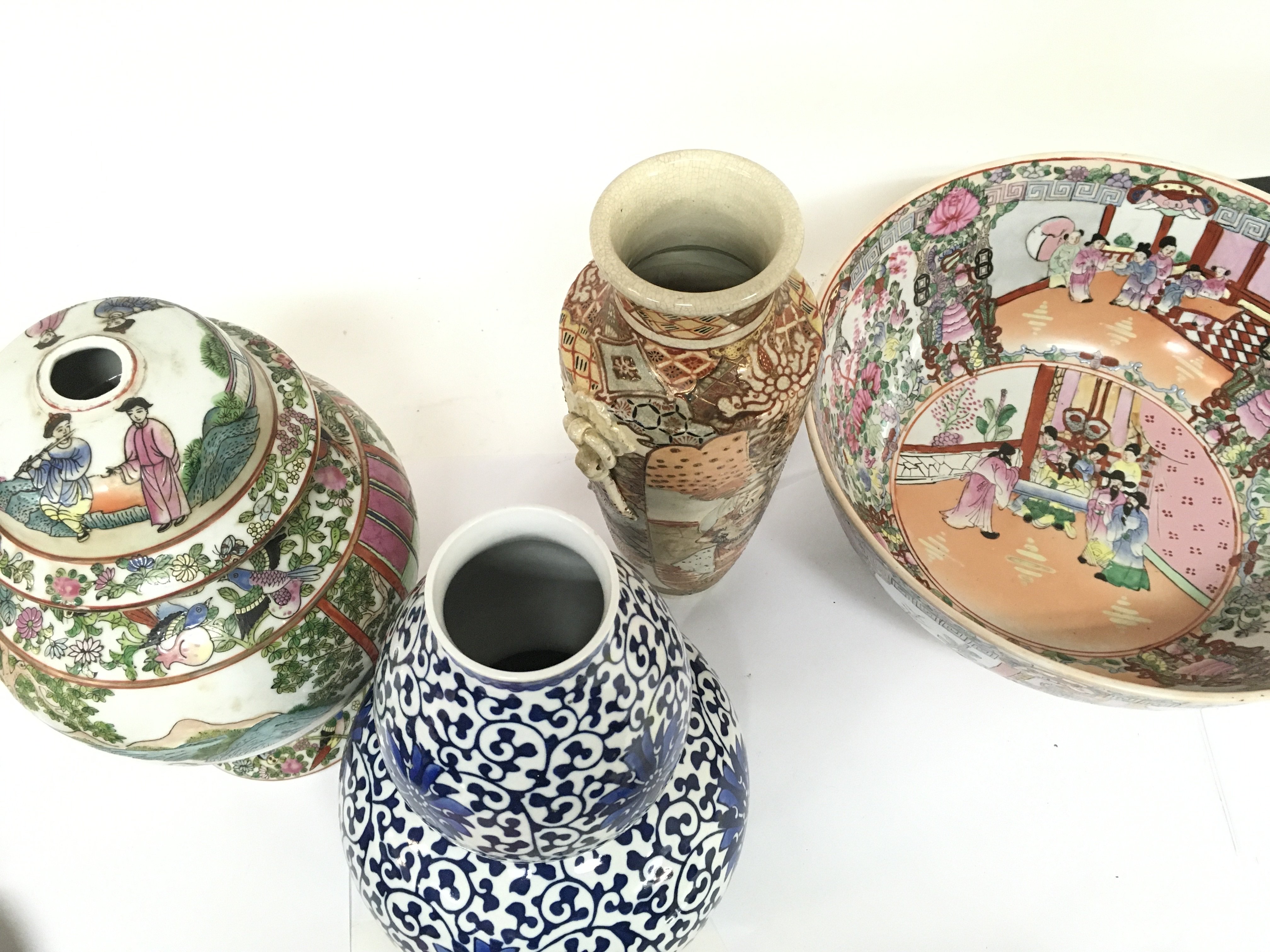 A Collection of modern Chinese and Japanese ceramics including a Famille Rose bowl, Japanese Satsuma vase, Blue and white Chinese vase etc. This lot cannot be posted