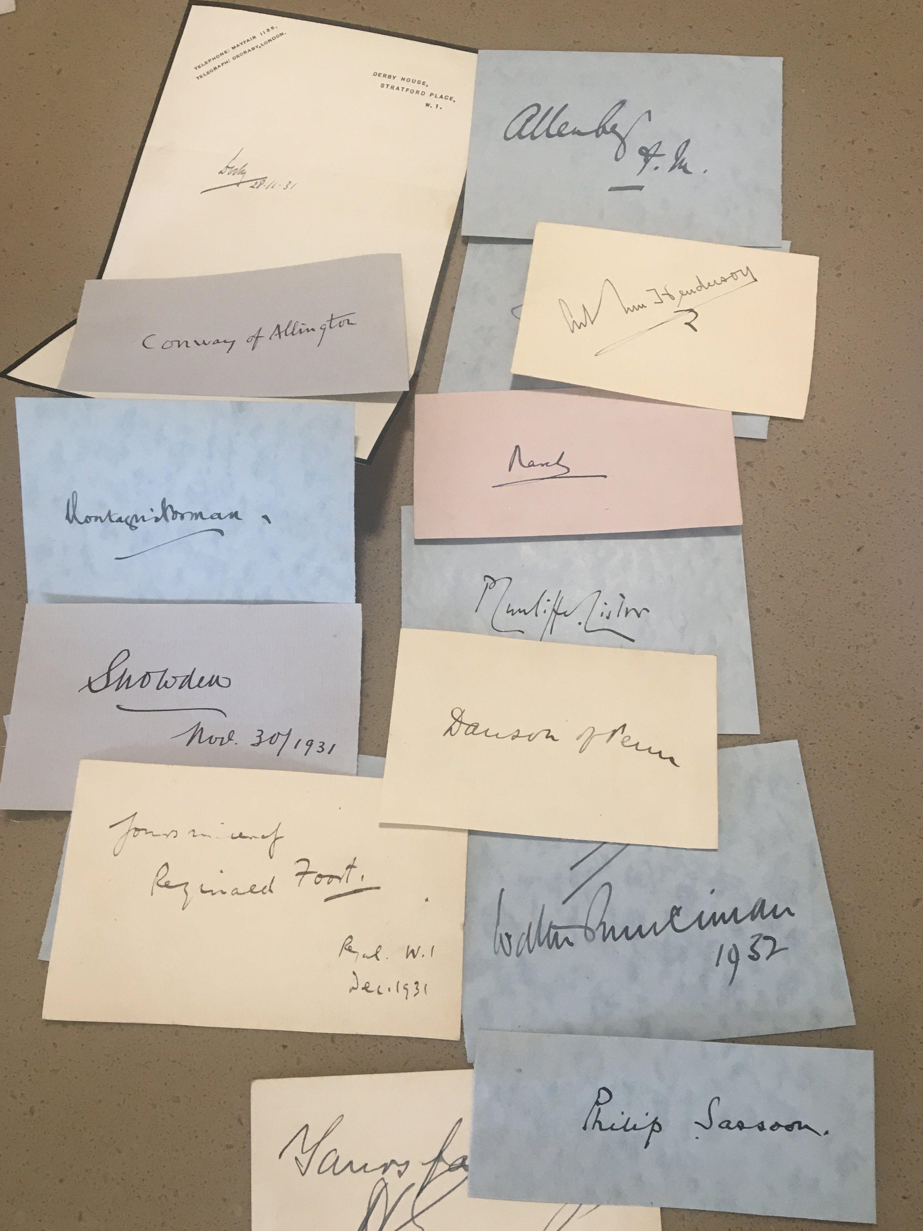 Guaranteed to be authentic signatures autographs. Lord Derby Secretary of State 1922 Minister of War also owner of many horses won the Derby in 1924. Montague Norman Governor of the Bank of England also awarded DSO in South African war. H Gordon Selfridge founder of Selfridges Oxford Street. Lord Conway of Arlington Director General at the war Museum. Rt Hon Arth Henderson Lord Dawson of PennReginald Foort. Viccount Snowden Rt Hon Sir Philip Sassoon Rt Hon Runciman Rt Hon Sir Herbert Samuel The Rt Hon Sir Samuel Hoare Vicount Allenbey Earl March Rt Hon Cunliffe Lister Rt Hon Sir Thos Tnskip