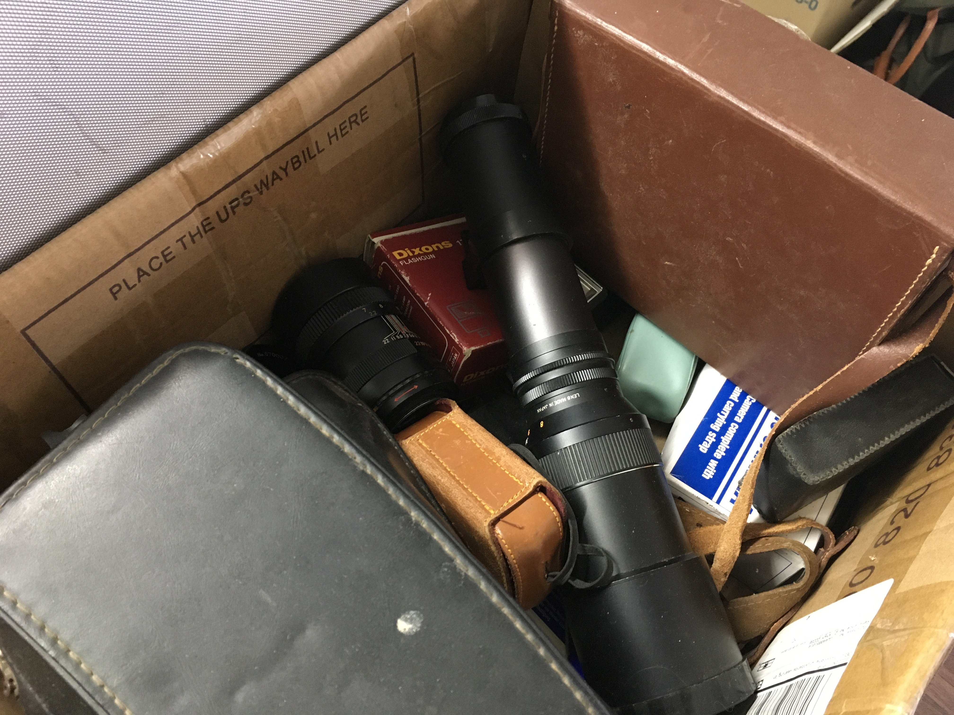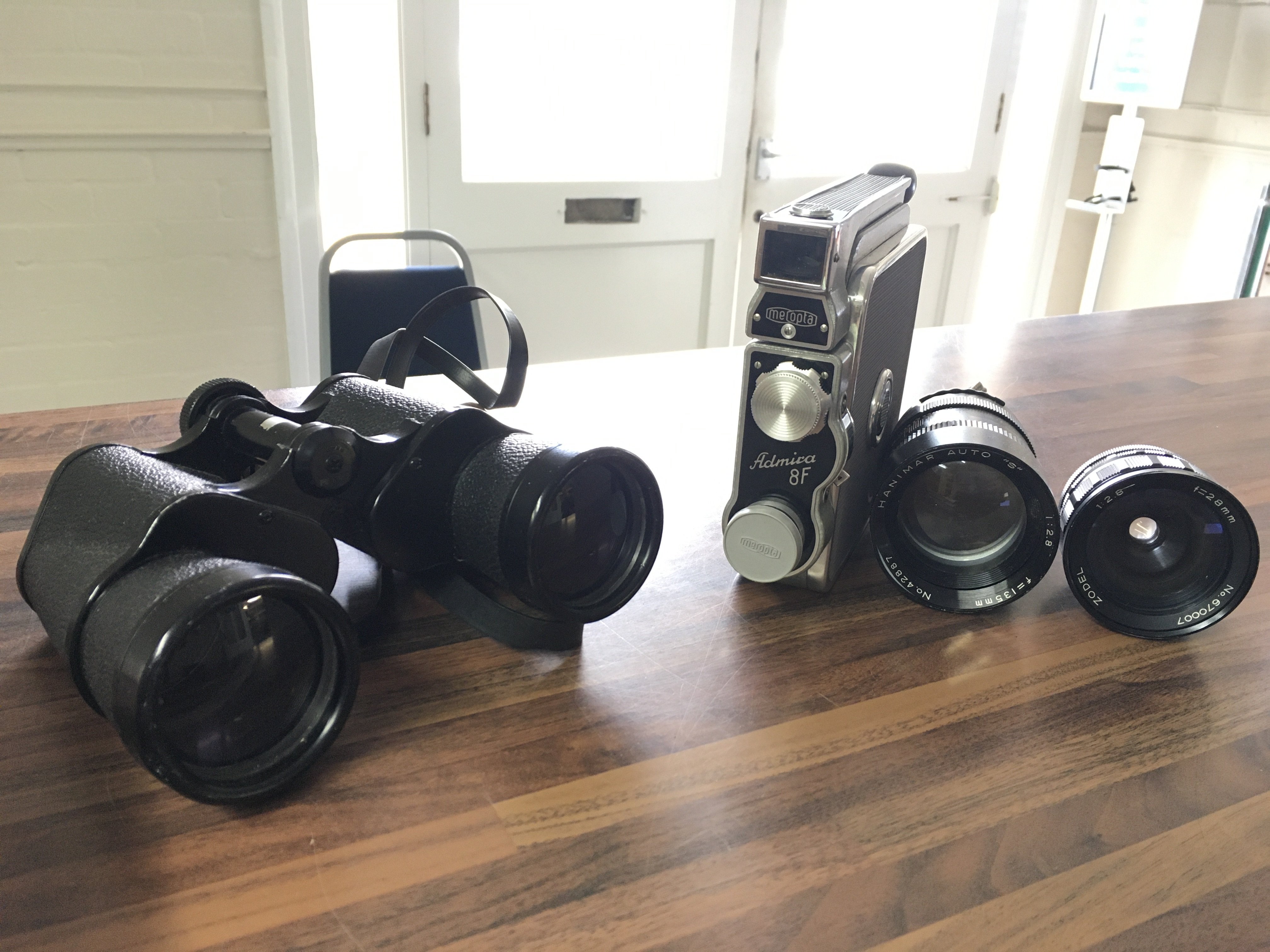 A collection of camera equipment including a Photax 400mm lens, Meopta Admira 8f, 16x50 field 3.5 binoculars etc. NO RESERVE