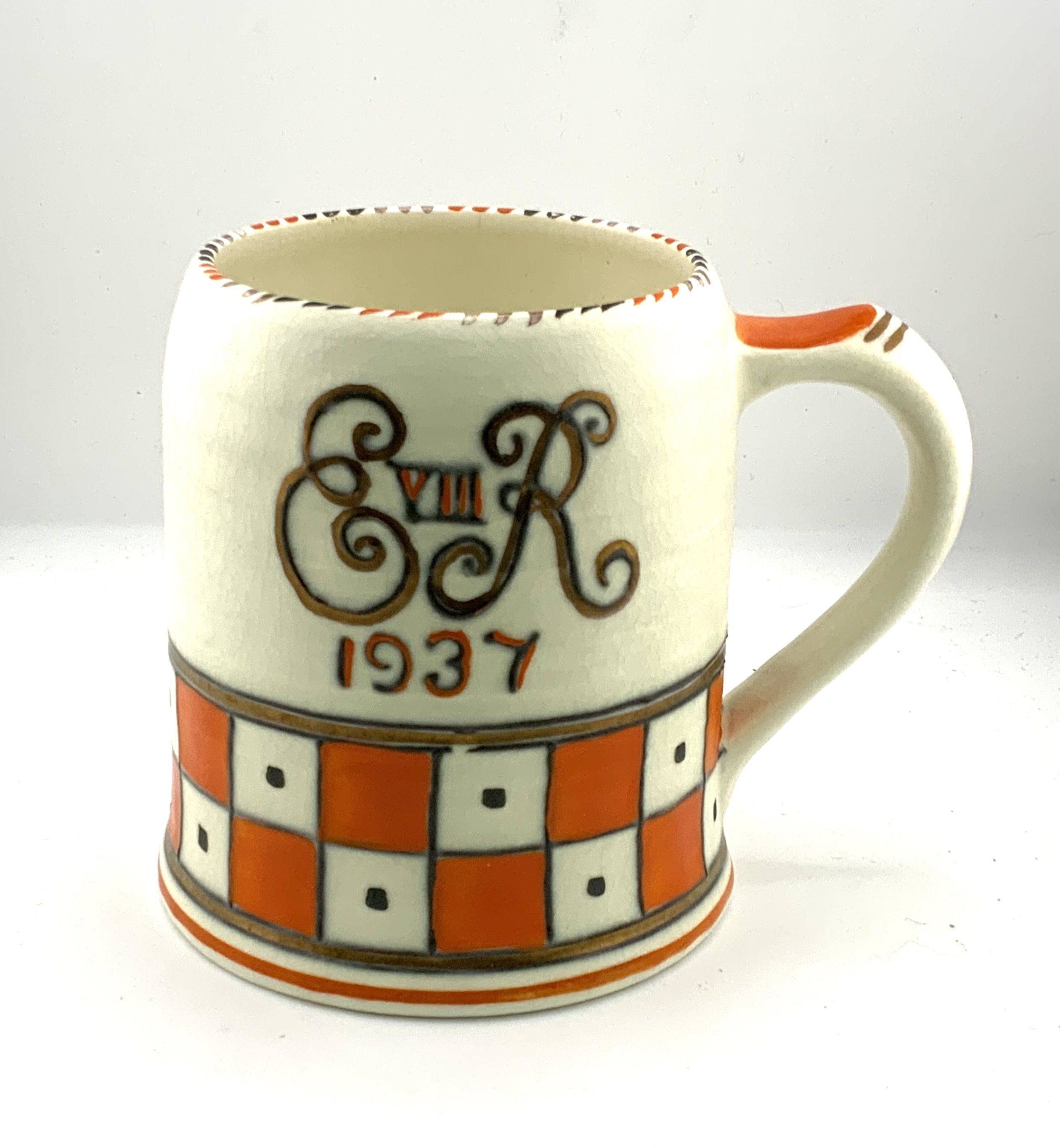A Crown Ducal Royal Commemorative Edward VIII Coronation tankard, by Charlotte Rhead, of circular form decorated with ER monogram with a geometric chequer border banding in orange and cream, on a circular foot, printed marks beneath, unsigned, 12cm. (D) NO RESERVE