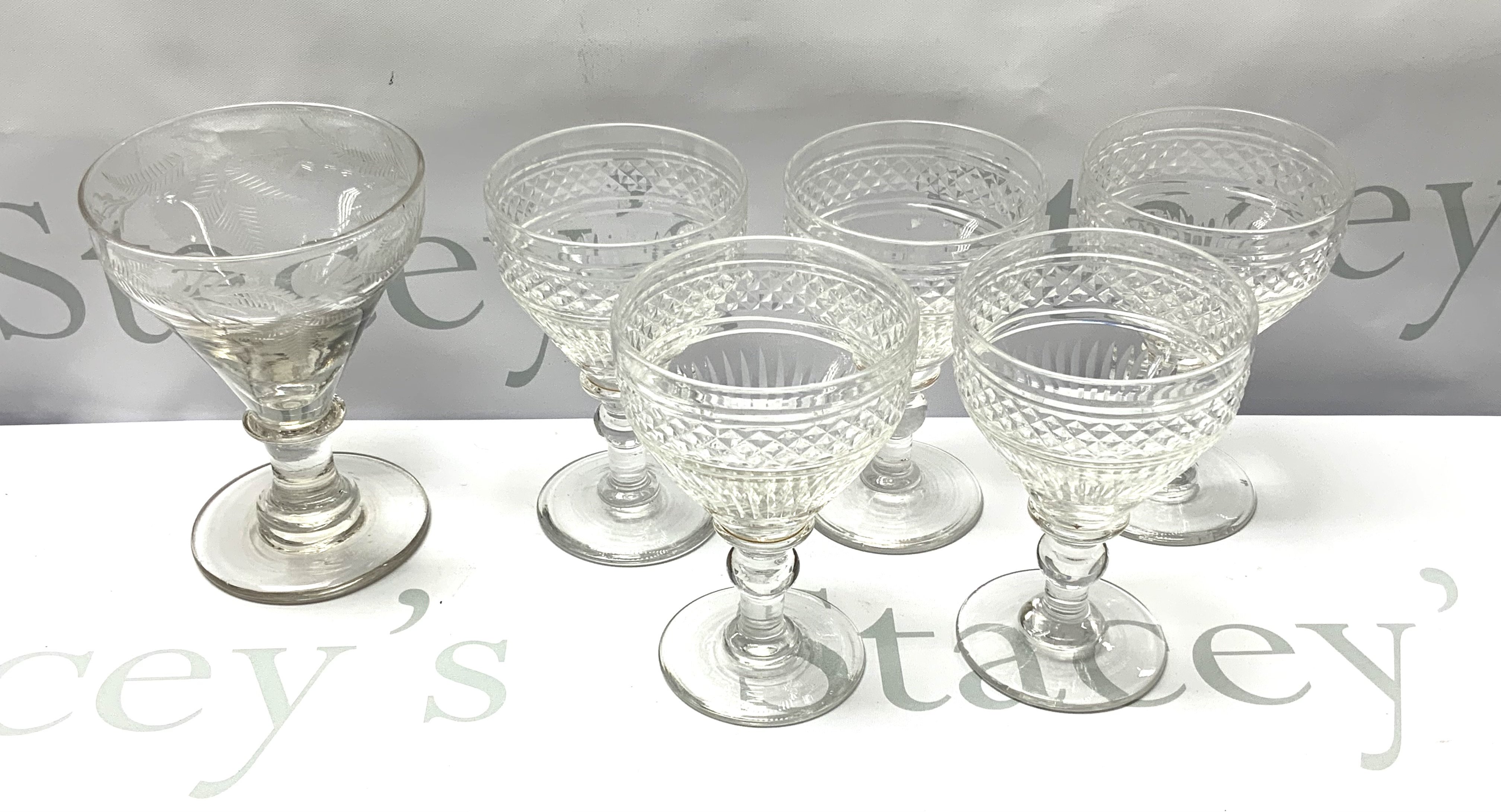 5 vintage gut glass runners together with an early Victorian example with etched fern leaf design. (D) NO RESERVE