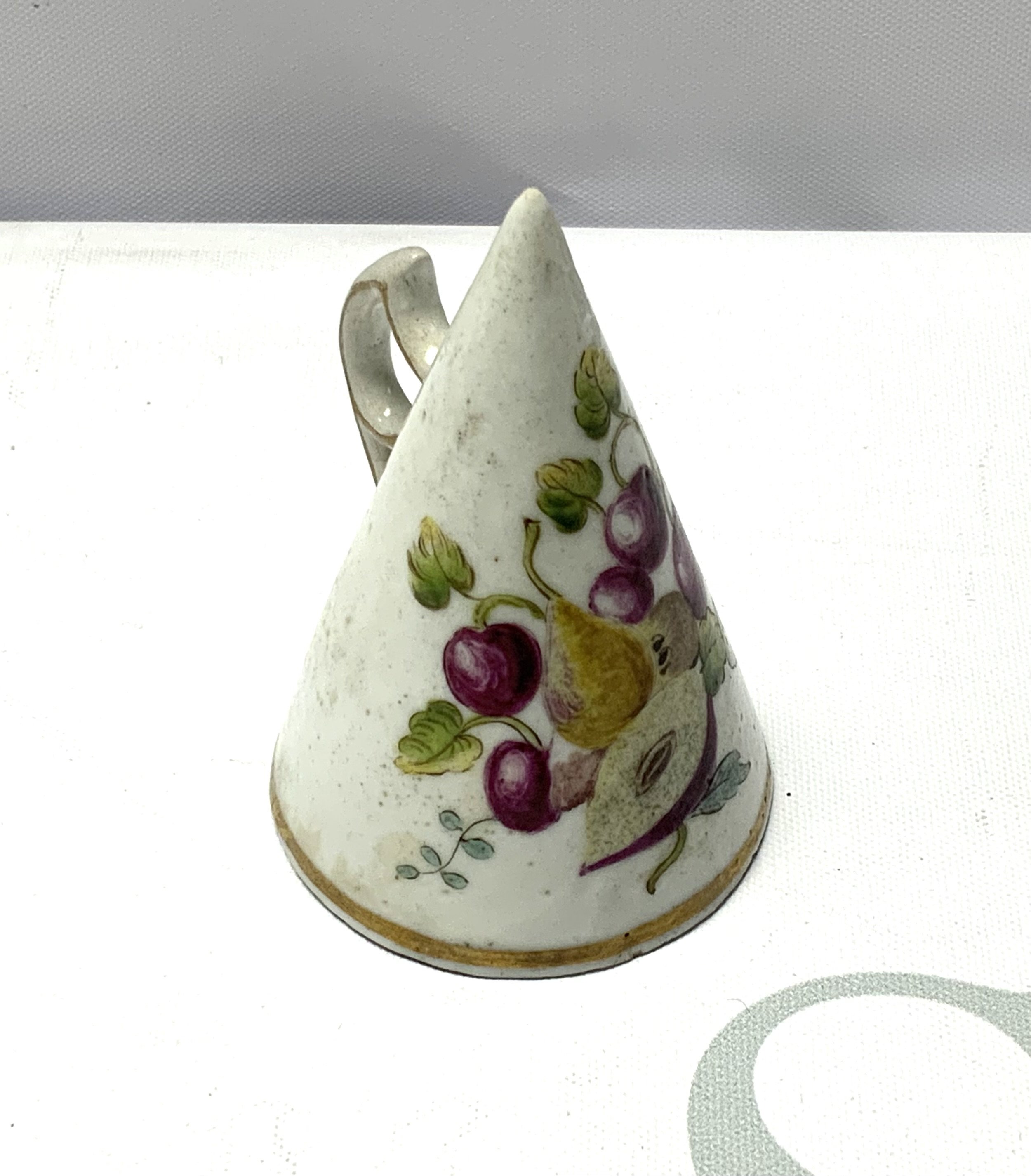 A small possibly Chelsea porcelain candle snuff with hand painted fruit decoration. (Some restoration) 6.5cm. NO RESERVE
