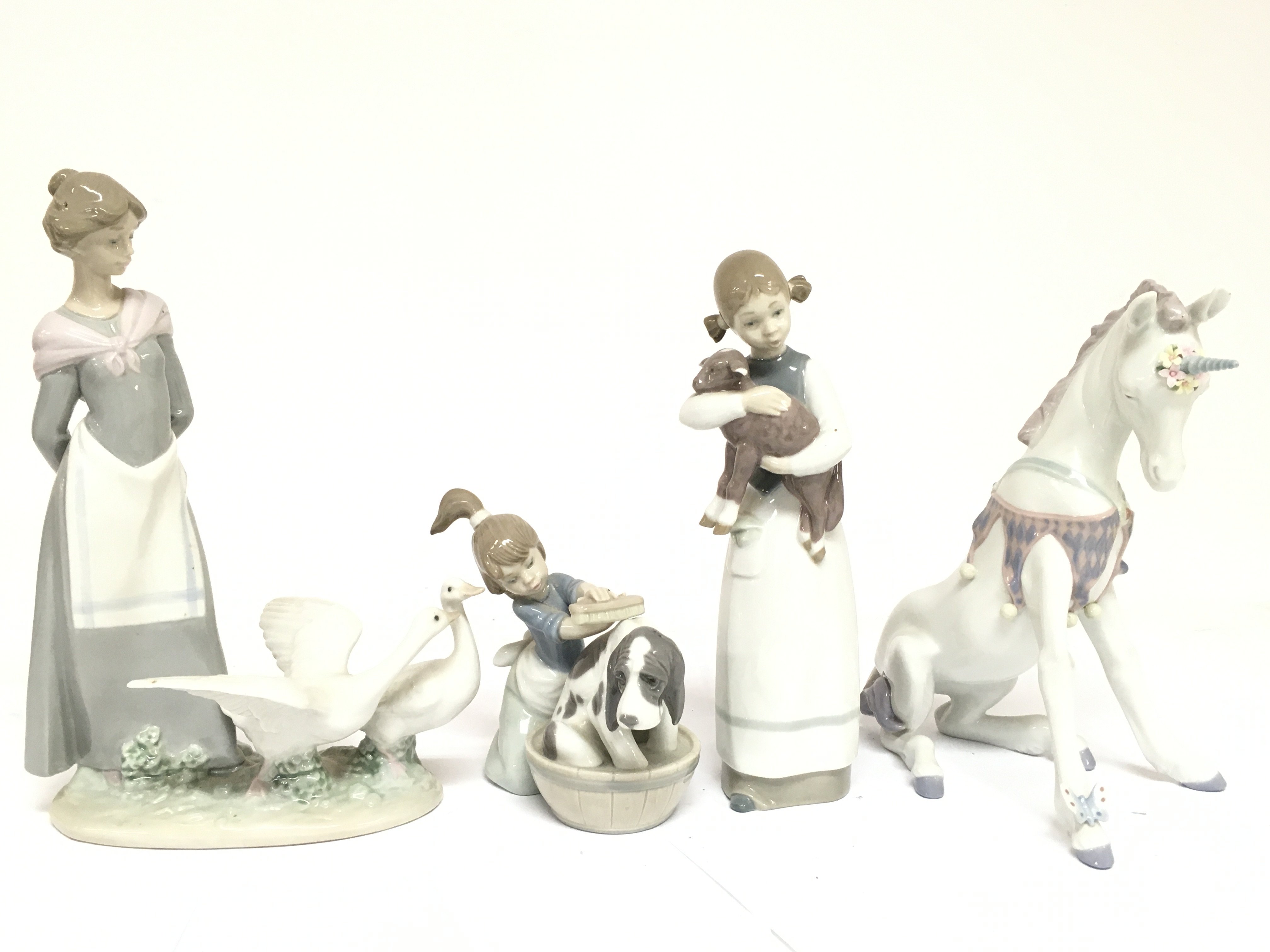 A Collection of boxed Lladro figures including Playful unicorn , girl with lamb, 12 to 24cm tall. This lot cannot be posted