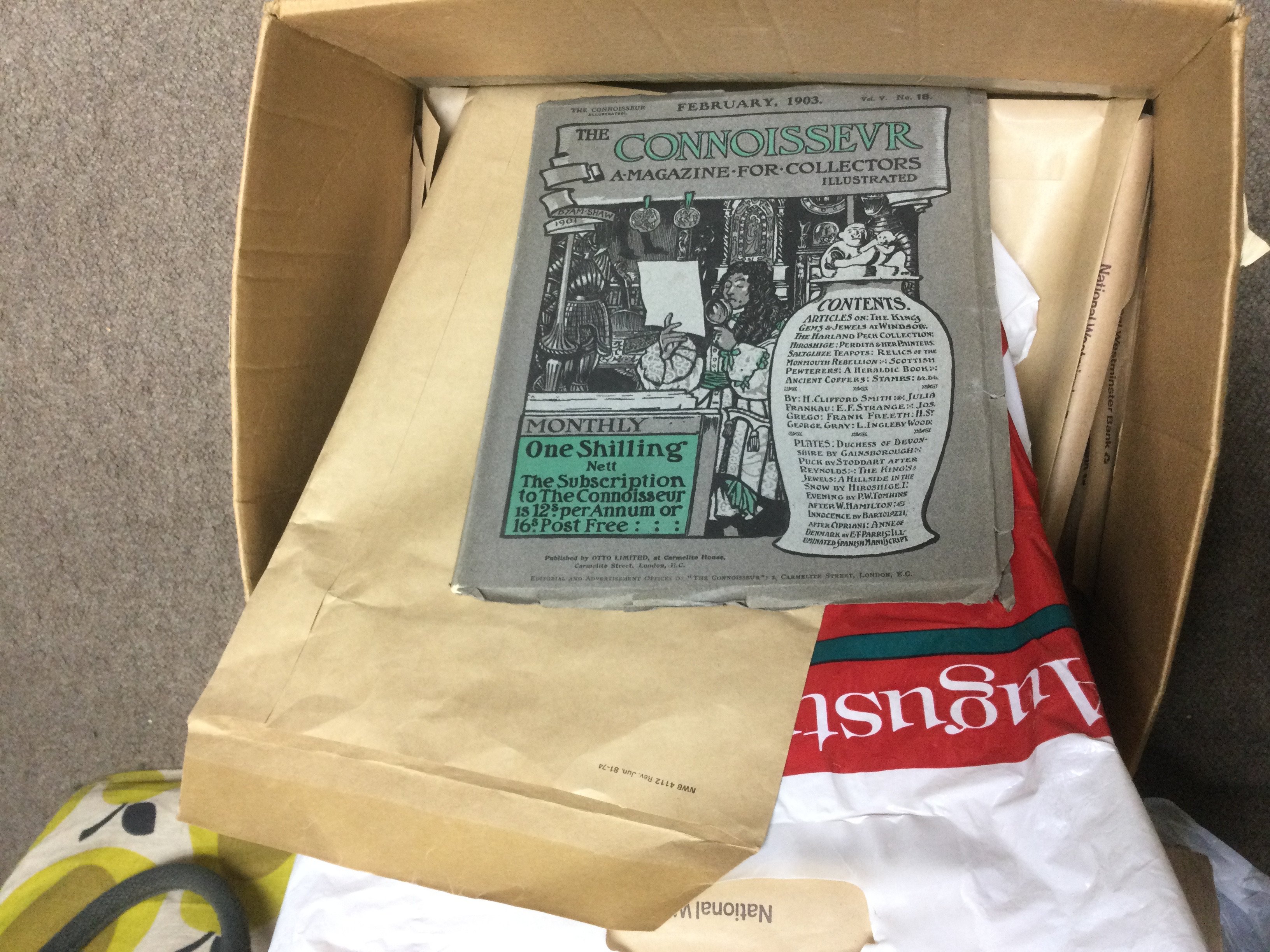 A box of Edwardian Connoisseur magazines, a photograph album and a Mrs Beeton book of household amusements and enjoyments. Shipping category C. NO RESERVE