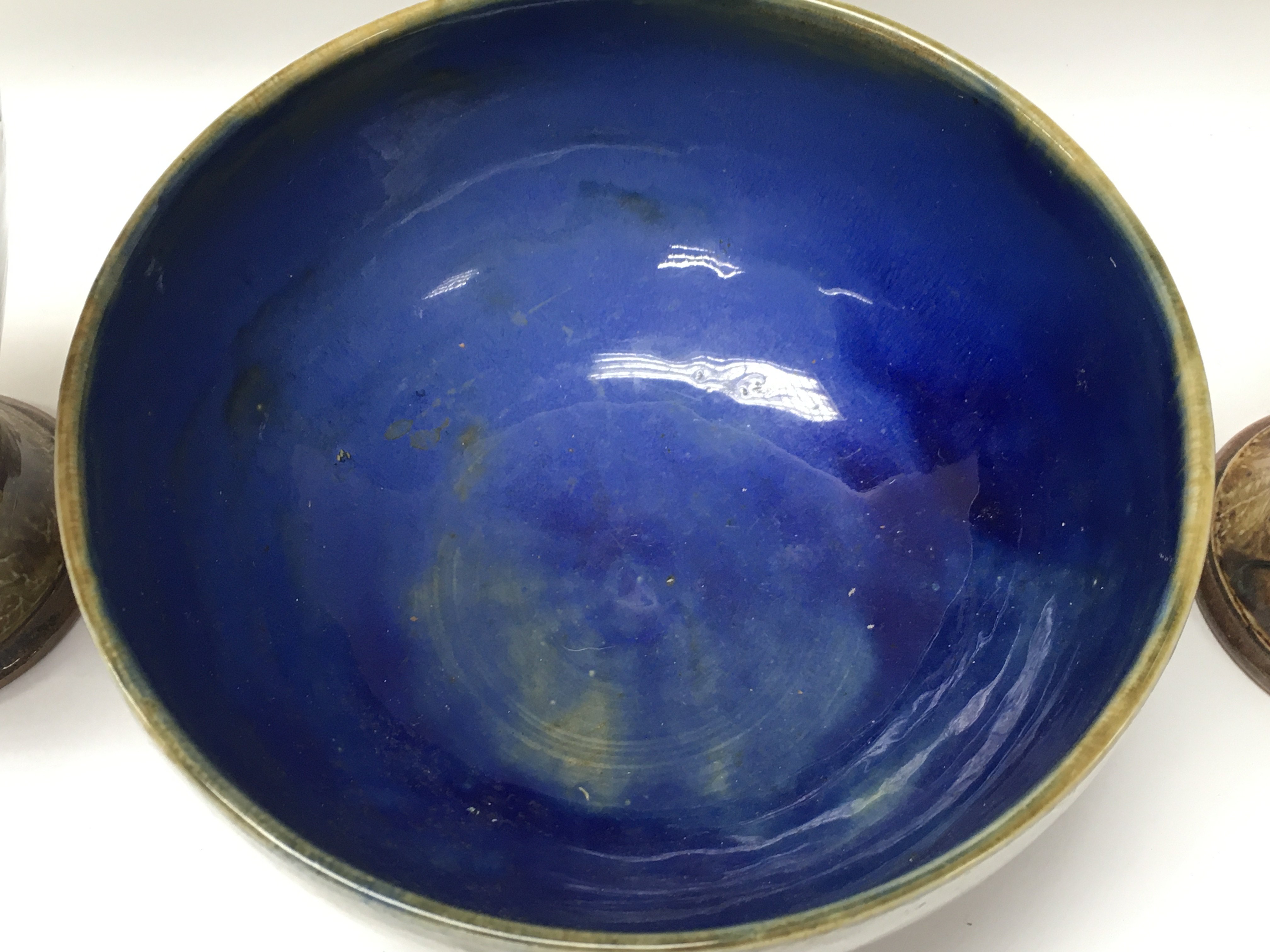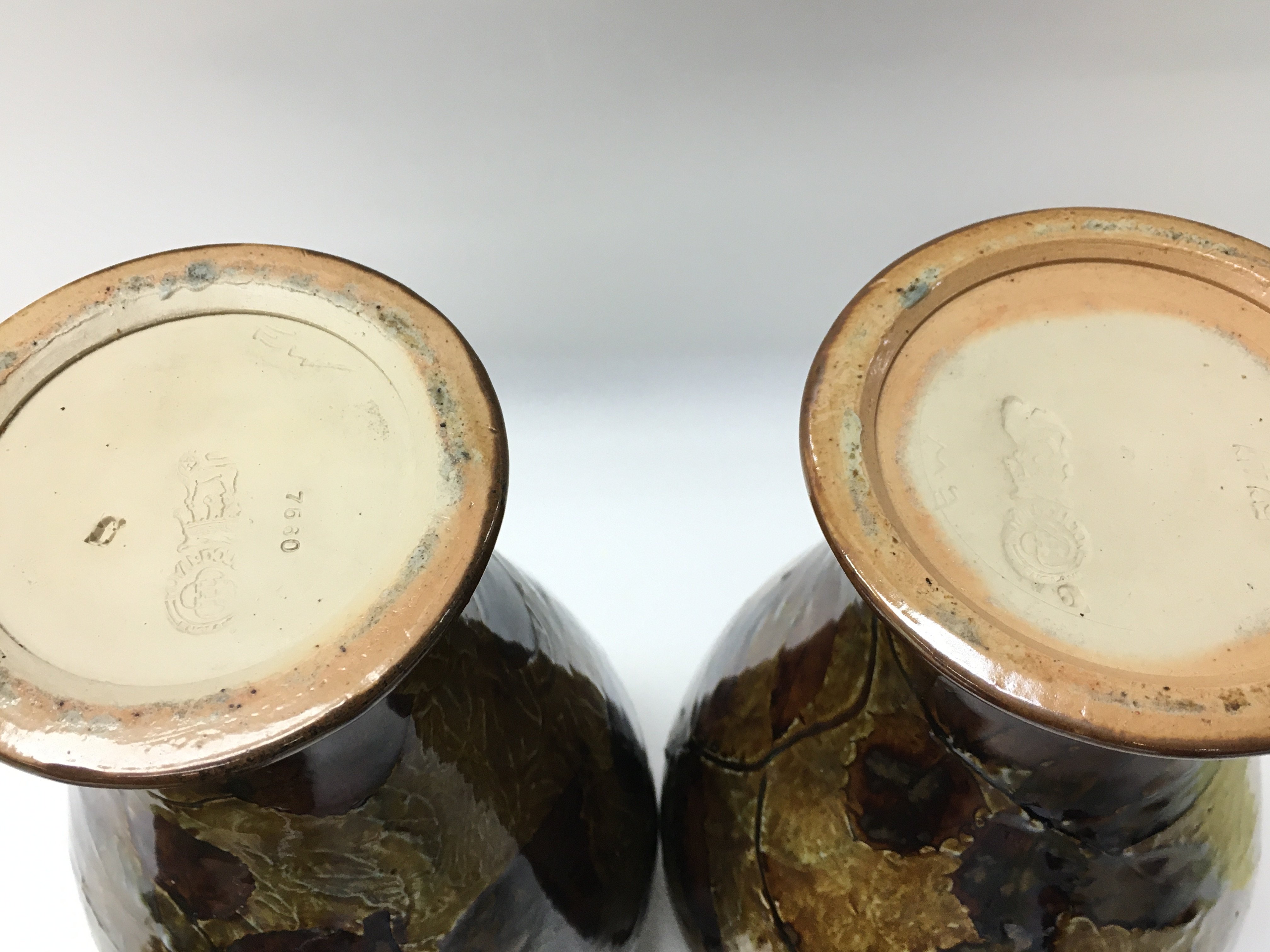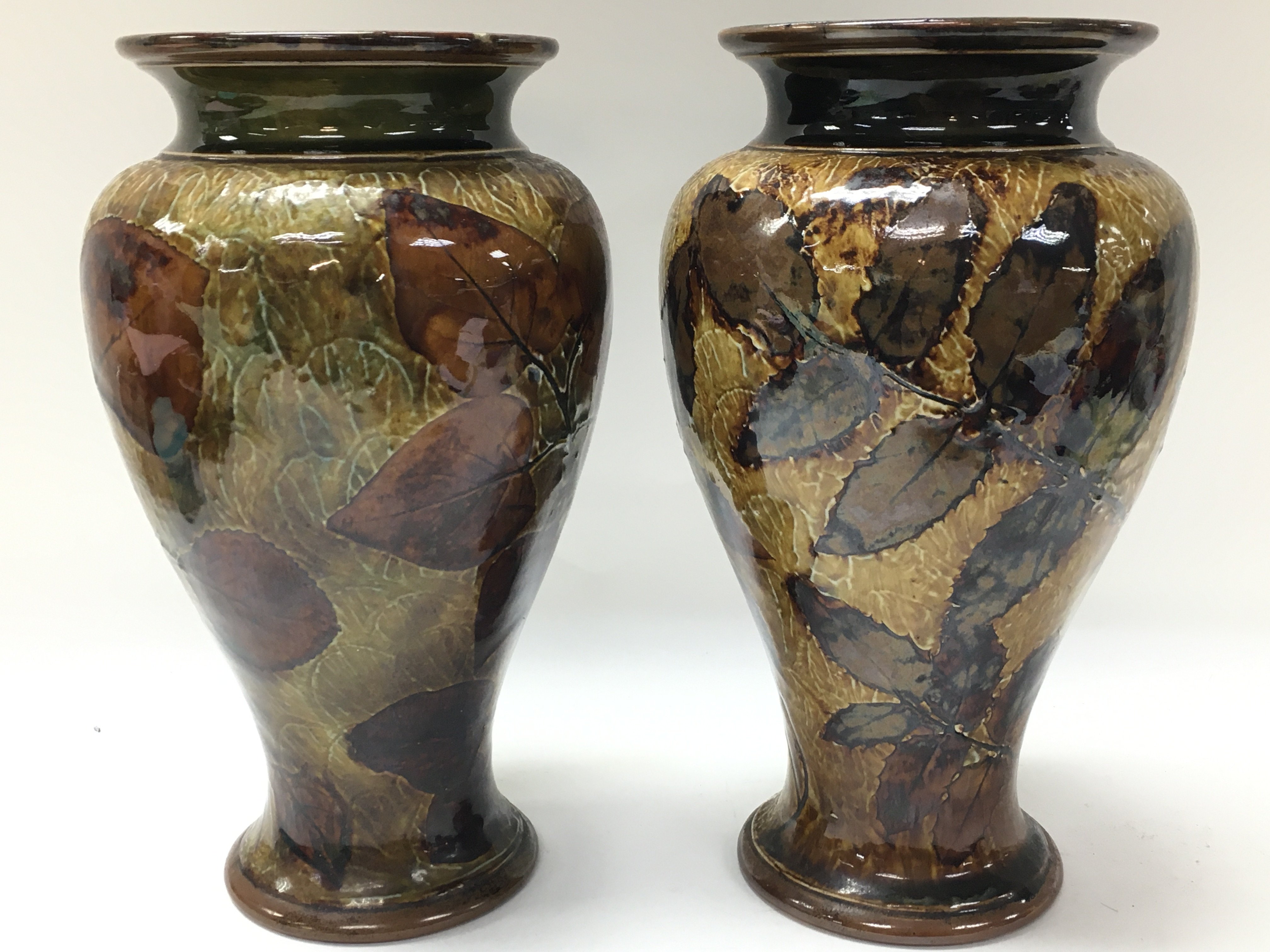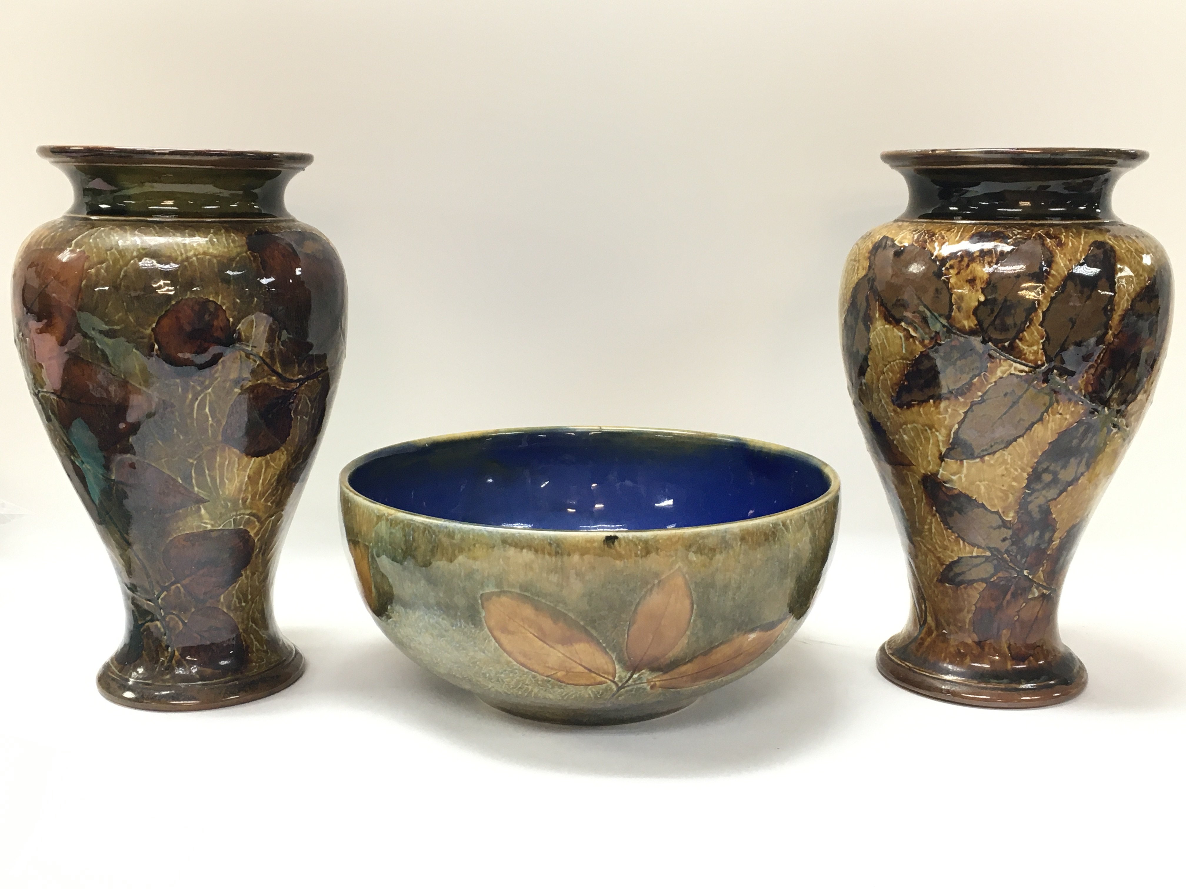 A pair of Royal Doulton autumnal foliage vases and a bowl. Bowl 20cm in diameter, vase 22cm tall. No obvious damage or restoration. This lot cannot be posted. NO RESERVE