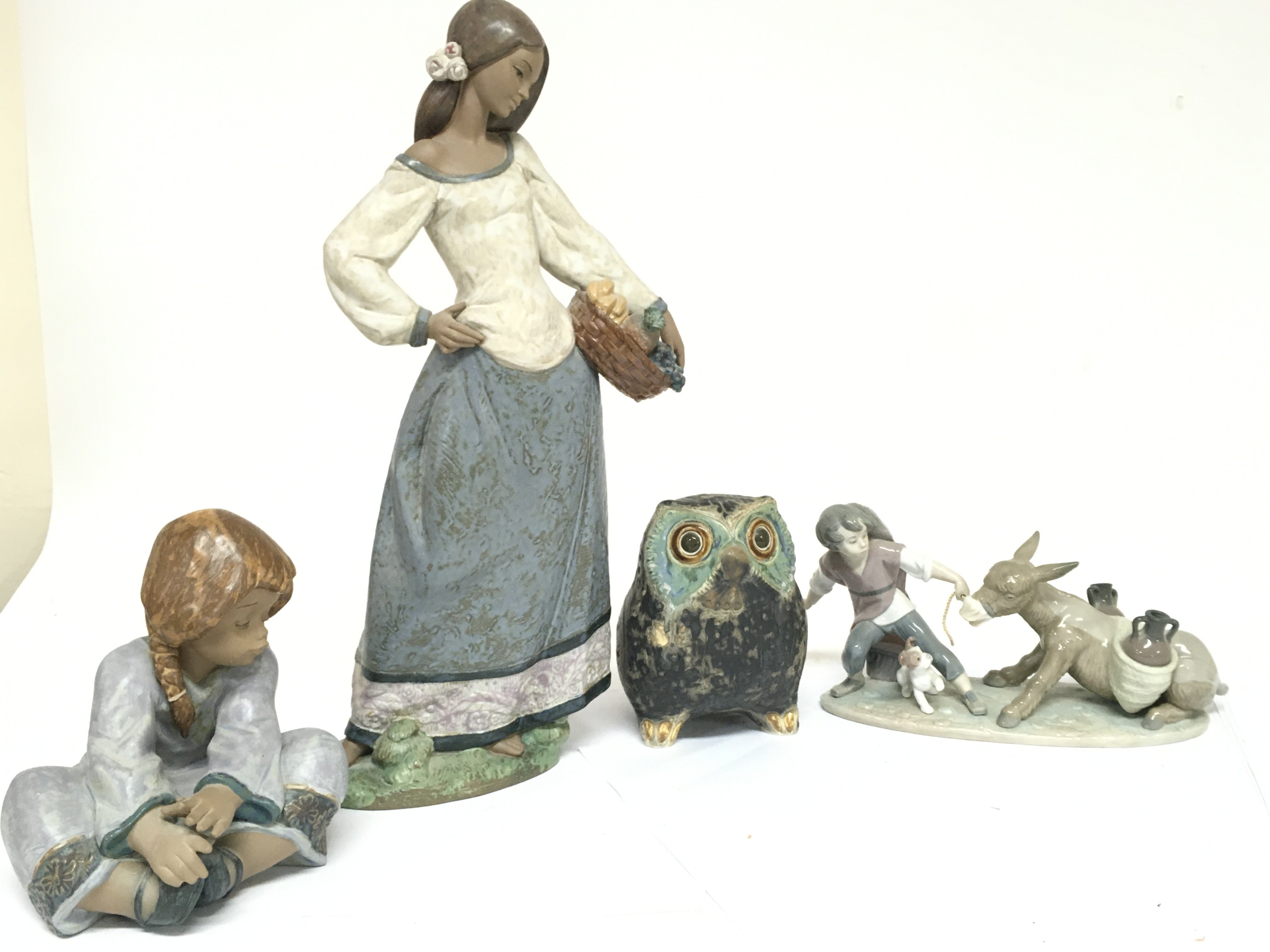 A collection of boxed Lladro figures including a large figure Seasonal Gifts, Little Eagle Owl, Lazy Day, Stubborn Donkey. This lot cannot be posted