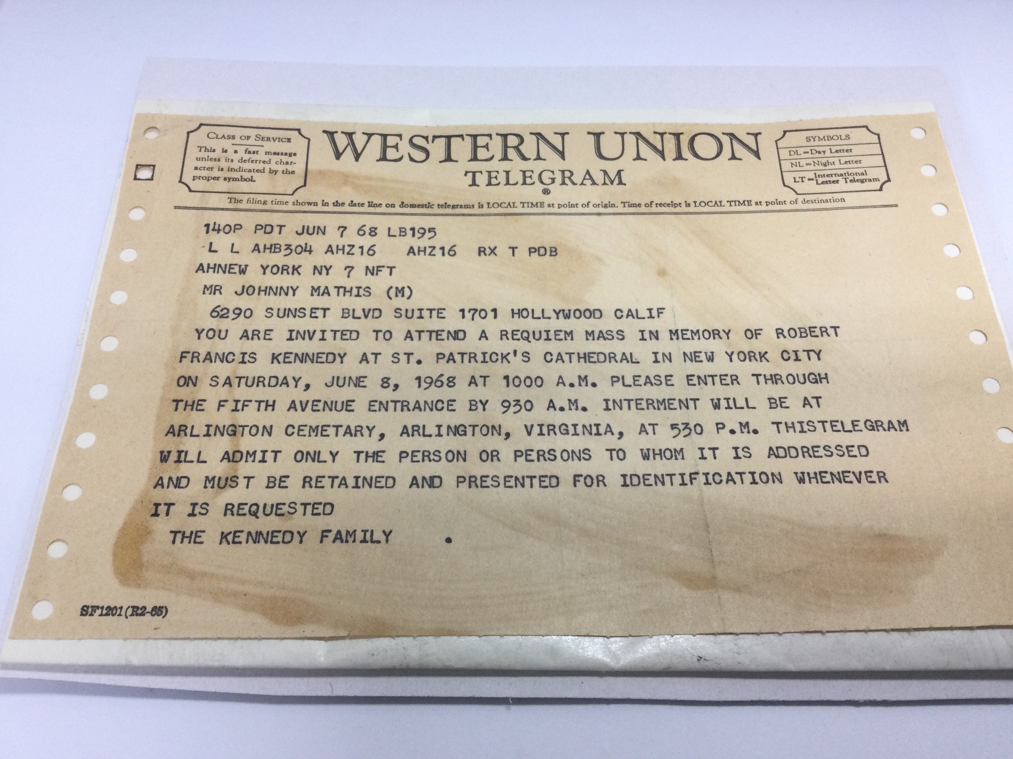 A Western Union telegram sent to Johnny Mathis from the Kennedy family inviting Mr Mathis to attend a requiem mass in memory of Robert Kennedy on Saturday, 8th June 1968. Shipping category A. NO RESERVE