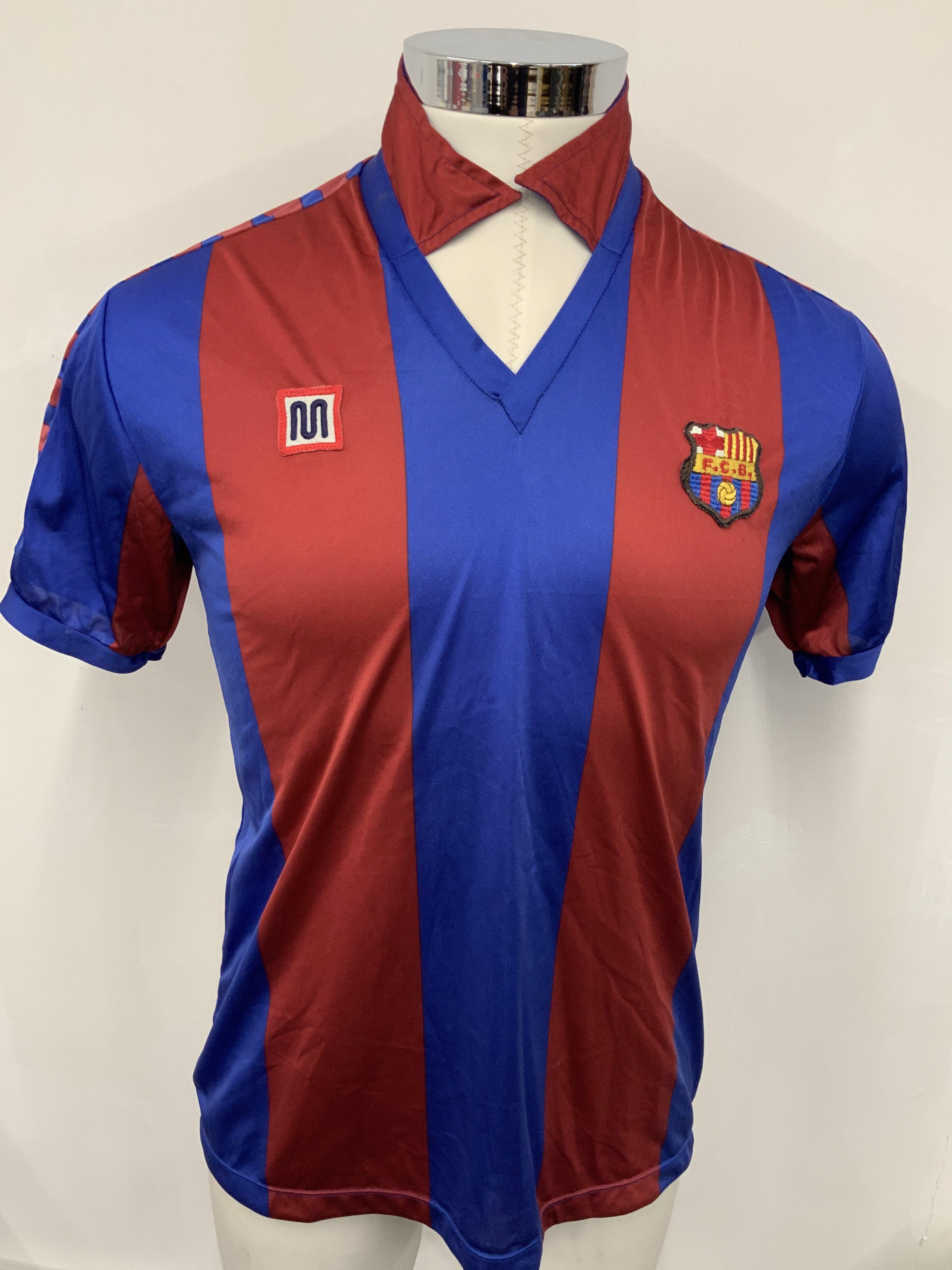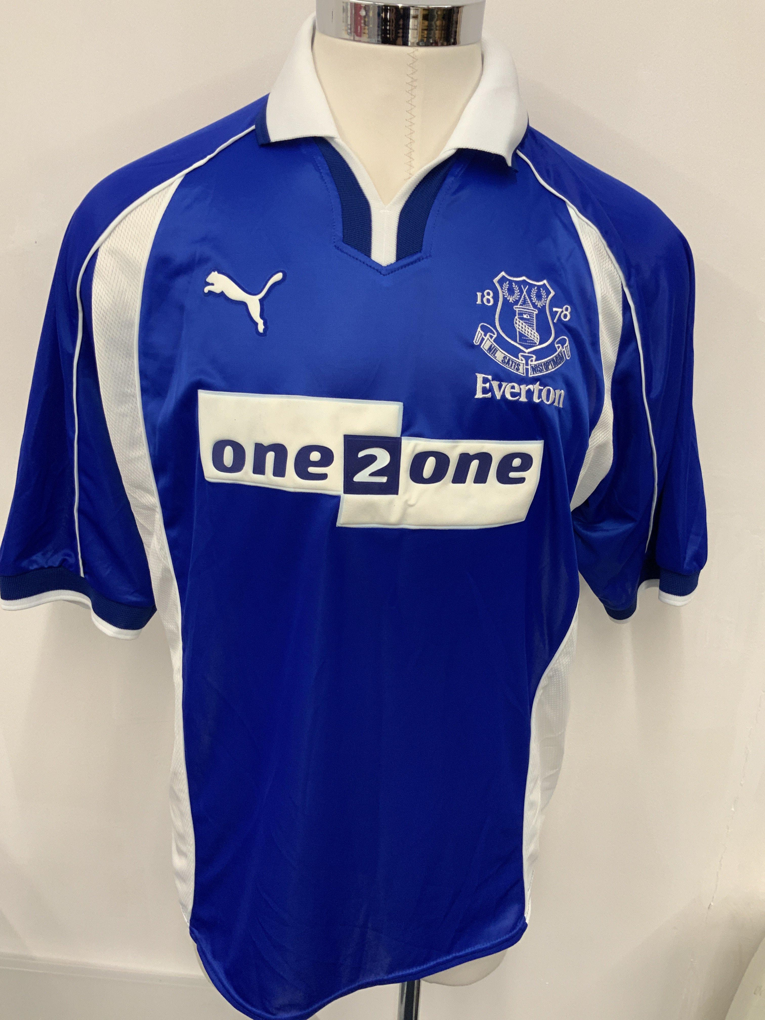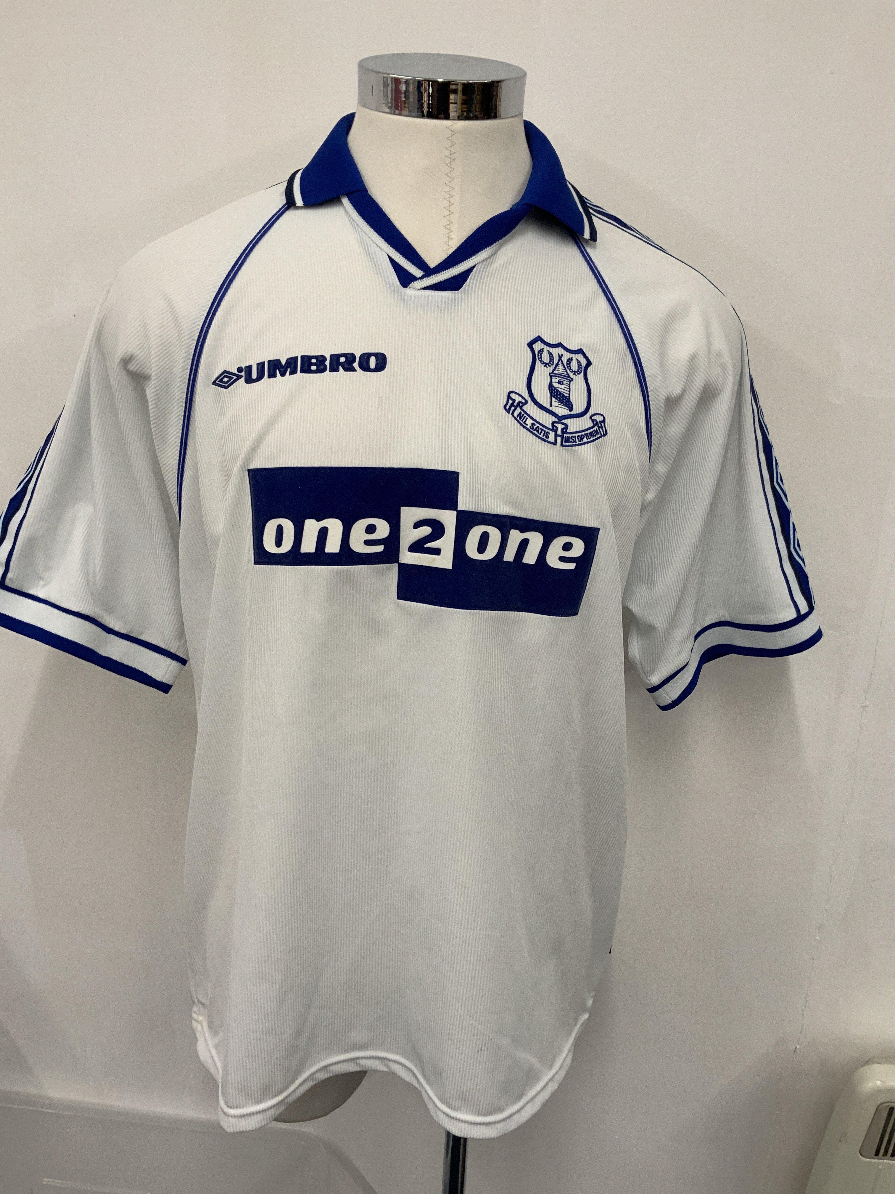Everton Football Shirts: 98/99 white XXL away shirt and a 2000 - 2002 home shirt with 17 to rear in size XL. C/W and old z Barcelona shirt. Very good. (3)