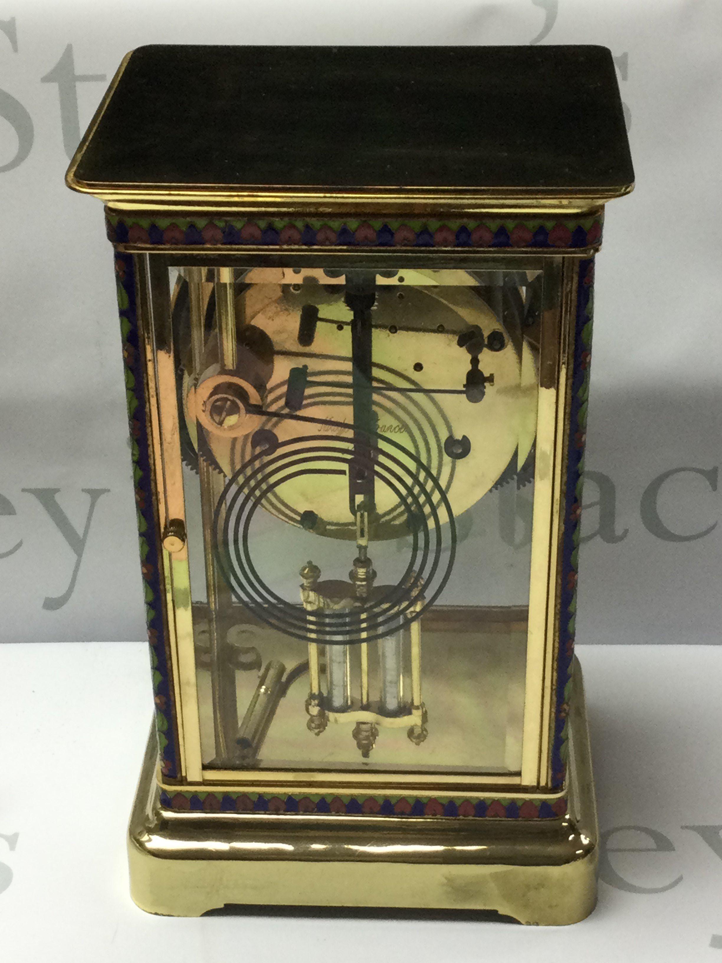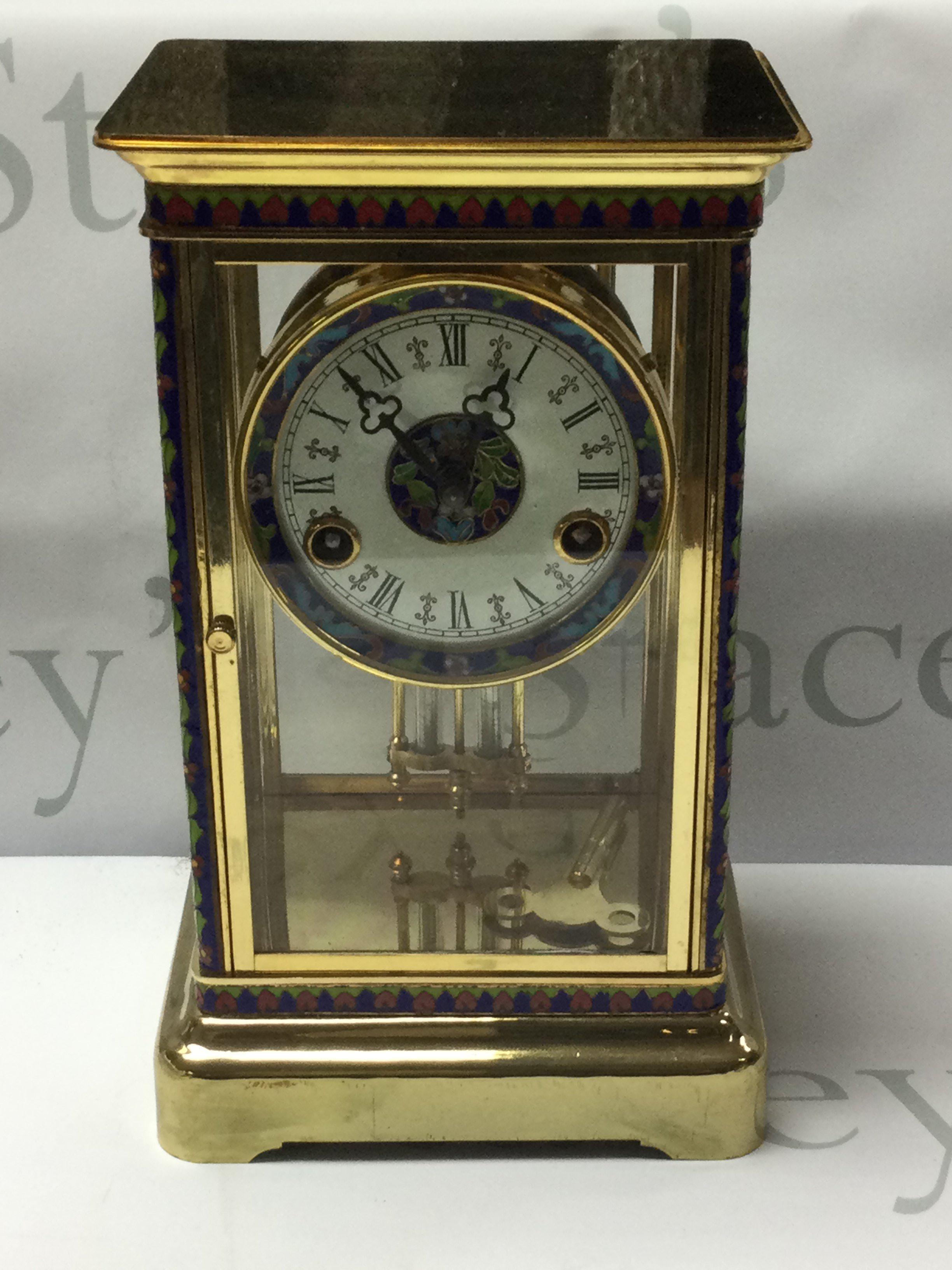 A good quality brass and cloisonne 4 glass clock with mercury pendulum, 29.5cm x 17.5cm x 13.5cm. (D, postage no offered for this lot).