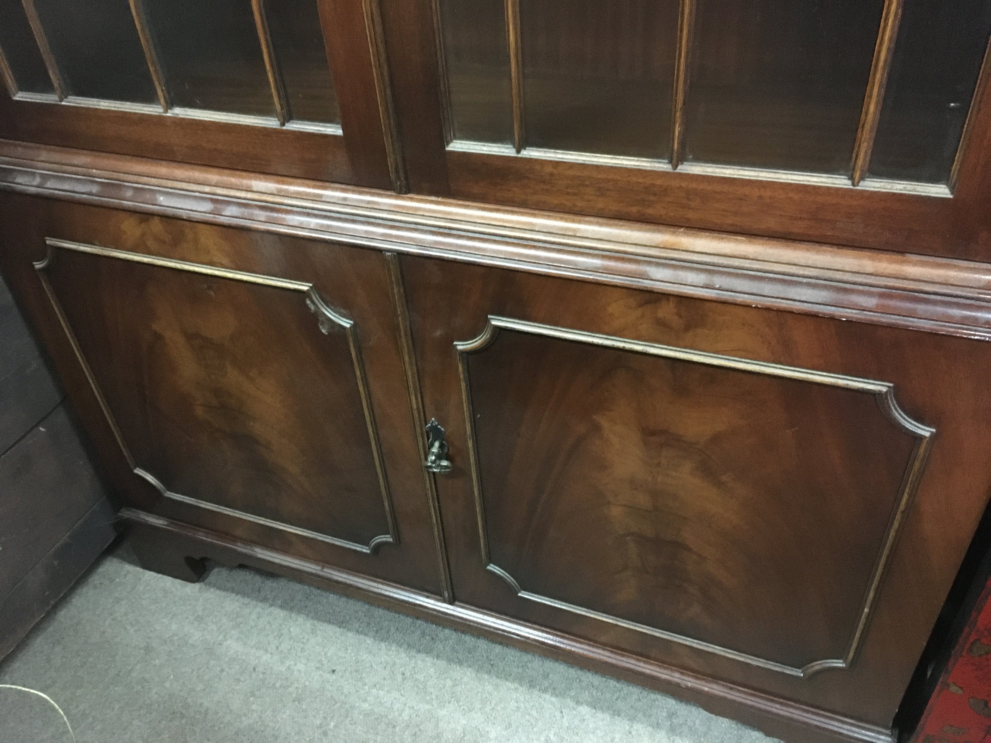 A mahogany bookcase with glazed doors above cupboards, dimensions 185x90x34cm