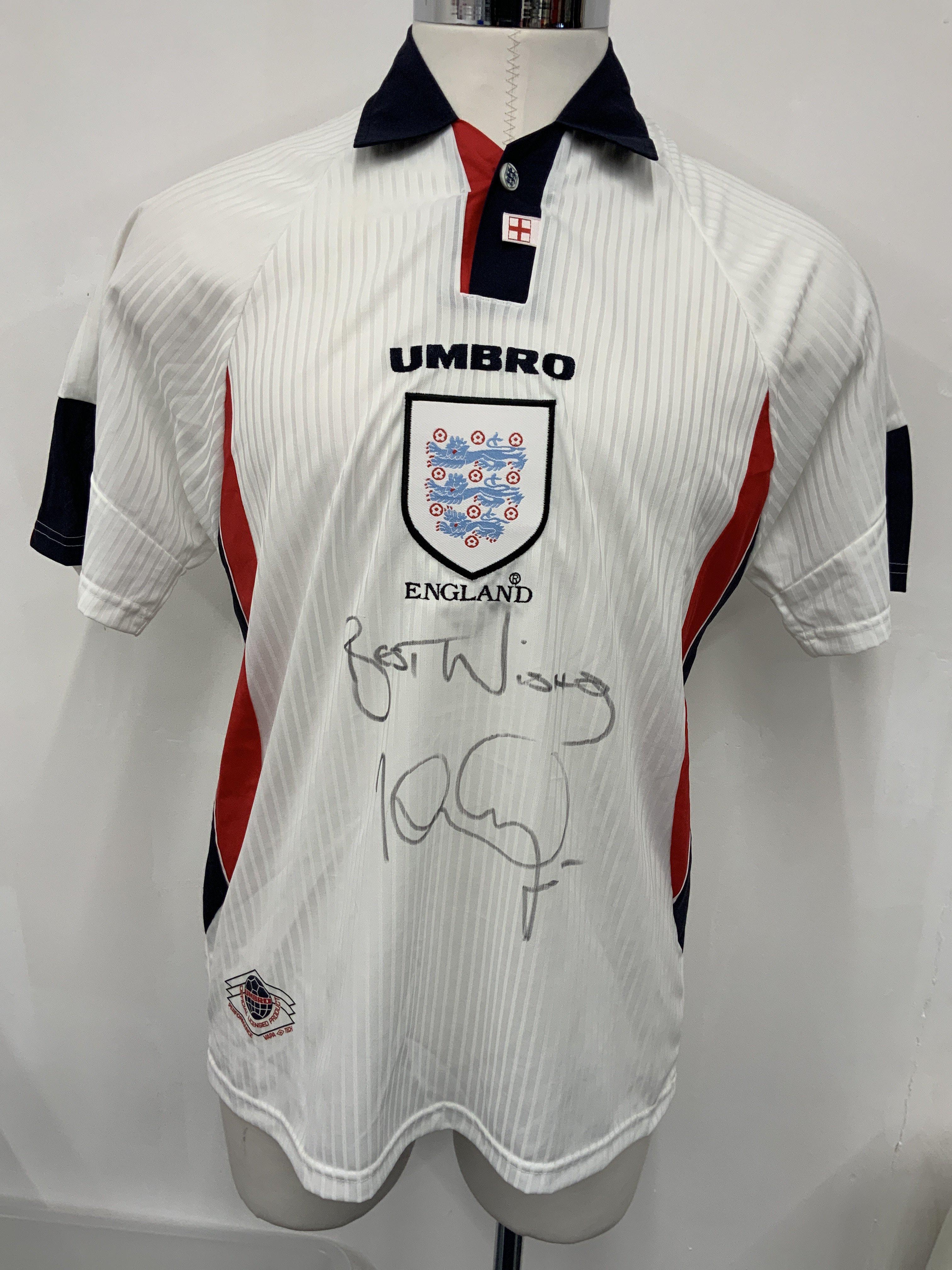 England World Cup 1998 Ian Wright Signed Football Shirt: White home shirt in size large brand new with tags. Given to major sponsor who attended the tournament. Signed clearly to front by Ian Wright.