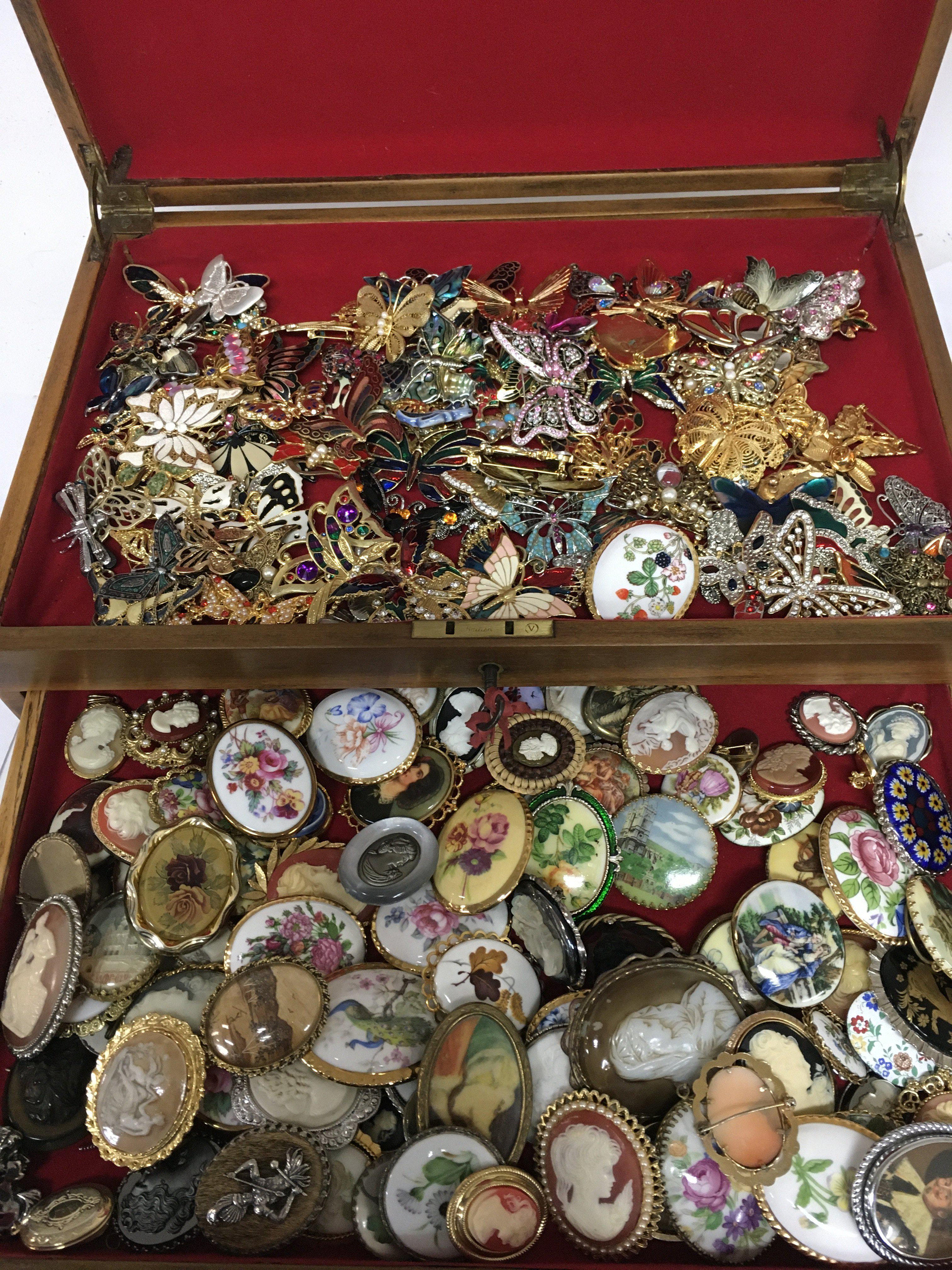 A large collection of vintage brooches including butterflys and cameos. Postage cat C