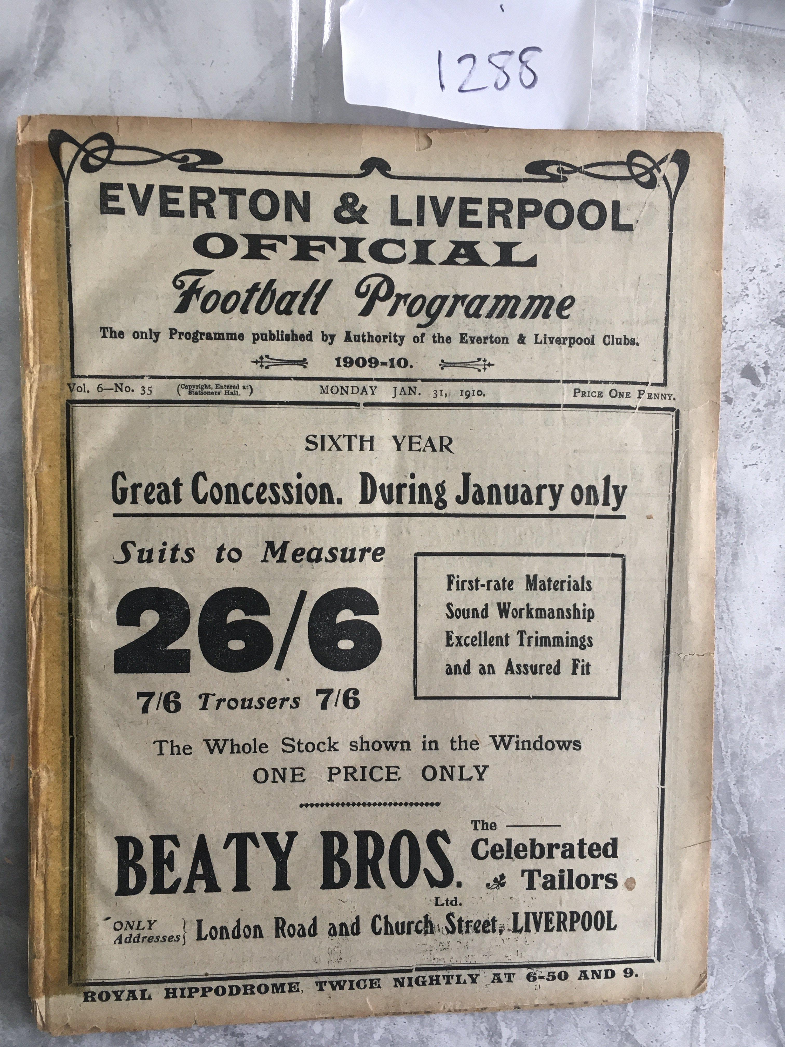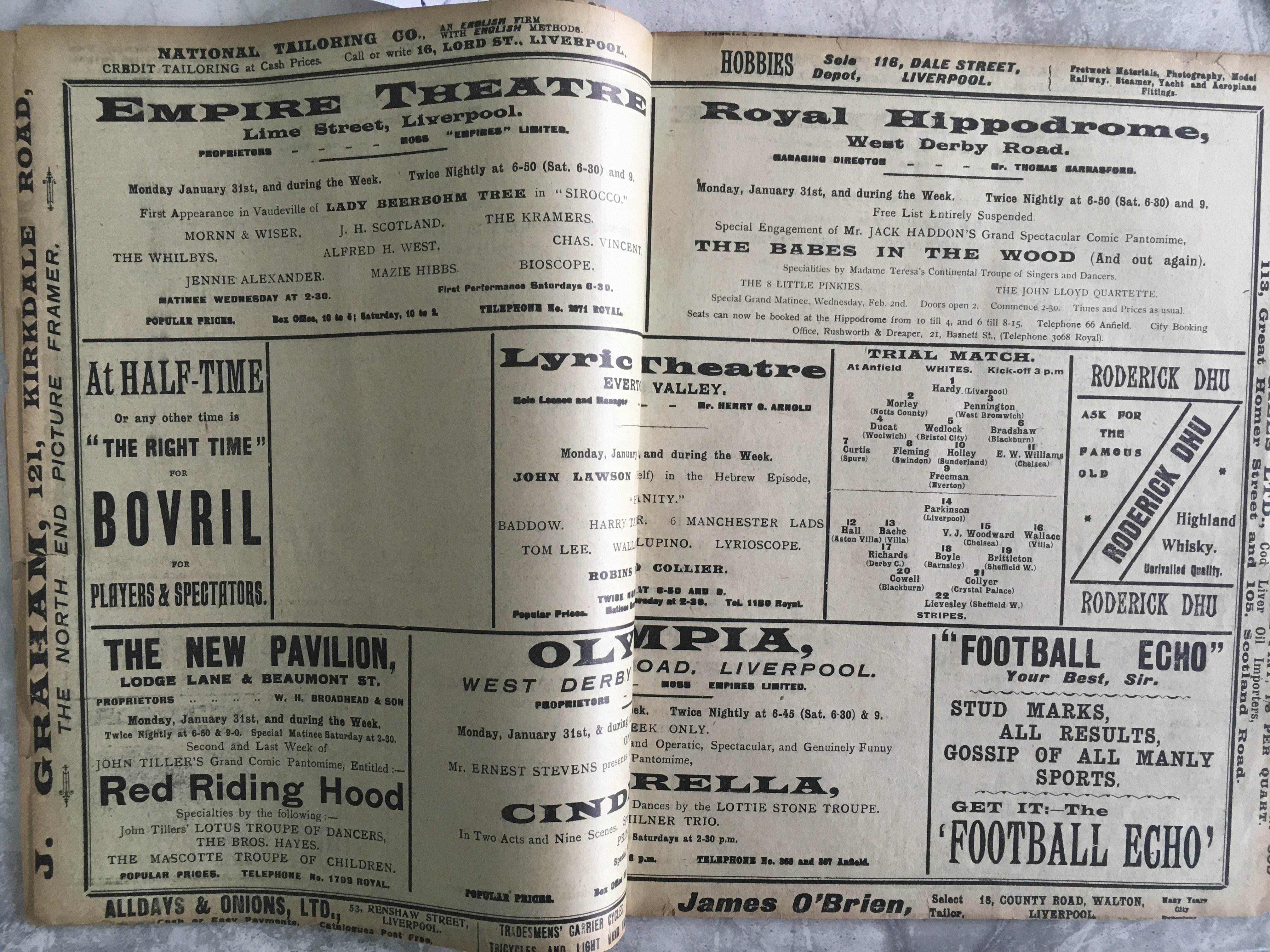 1909 - 1910 England Trial Football Programme: Whites v Stripes played at Anfield Liverpool. Fair/good condition 16 page programme with no team changes. Tape to spine.