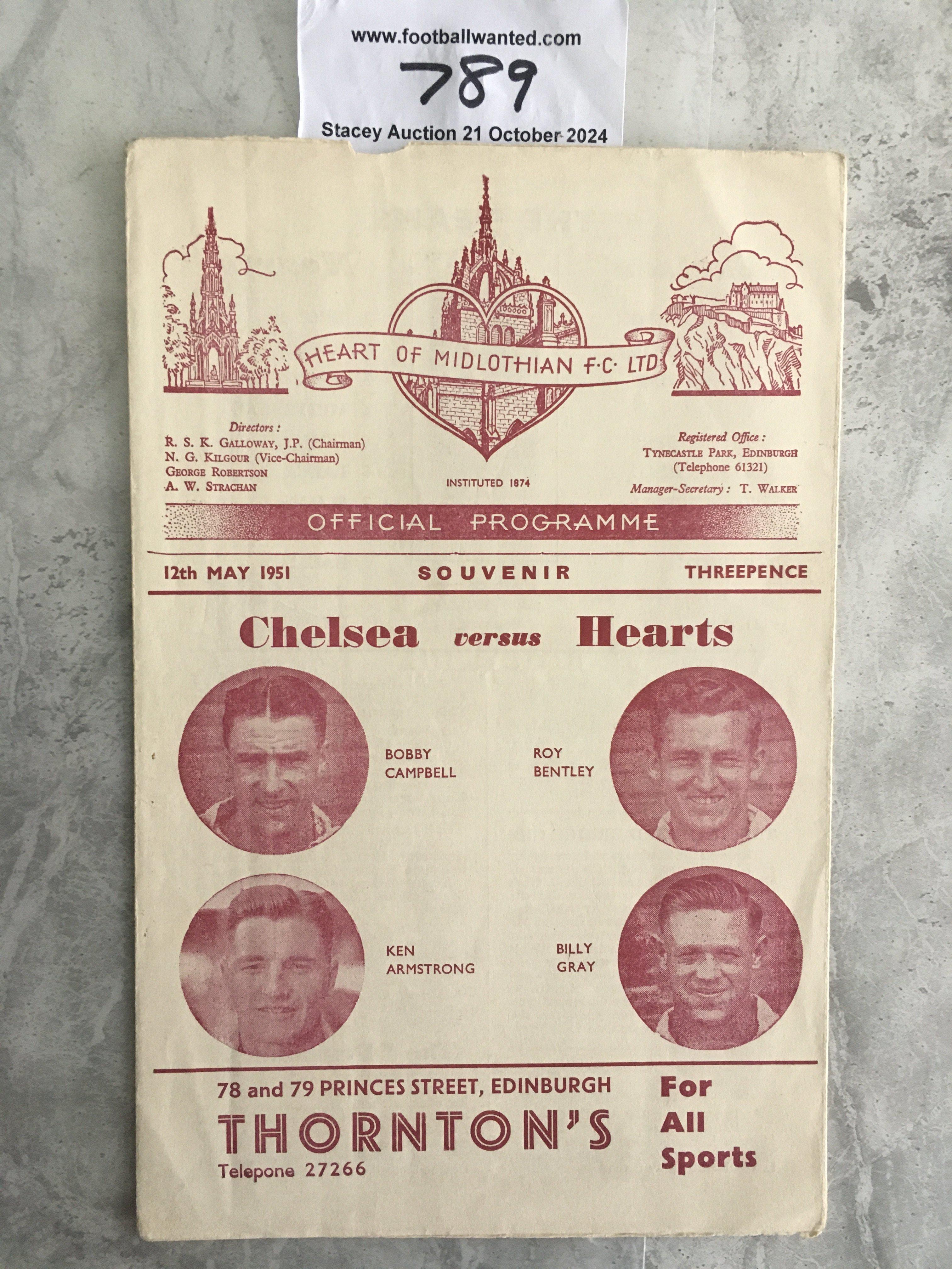 50/51 Hearts v Chelsea Football Programme: Good condition gatefold programme with no team changes. Tiniest tear. Friendly to p,Ayers for the Stamford Bridge Cup at Tynecastle.