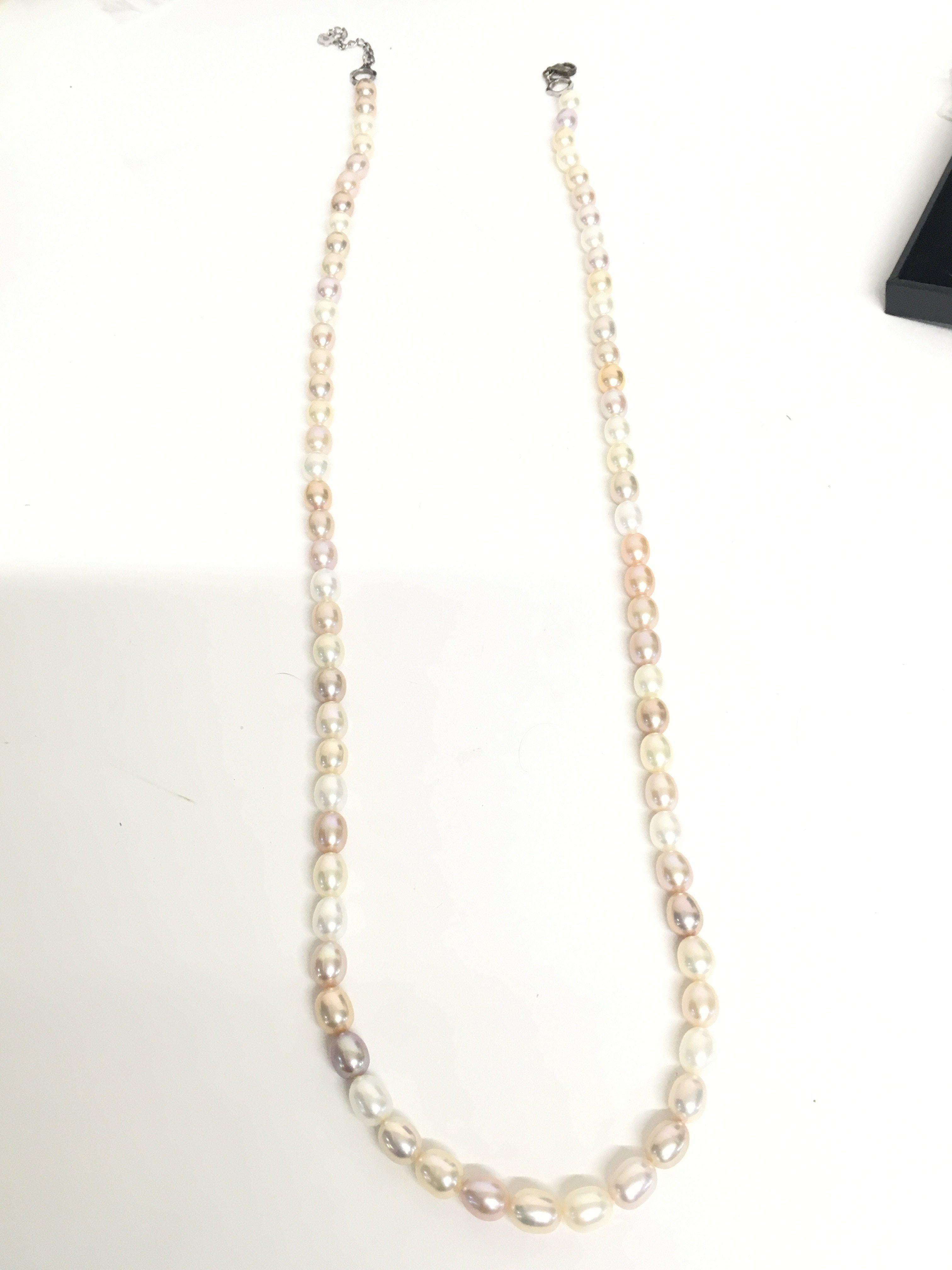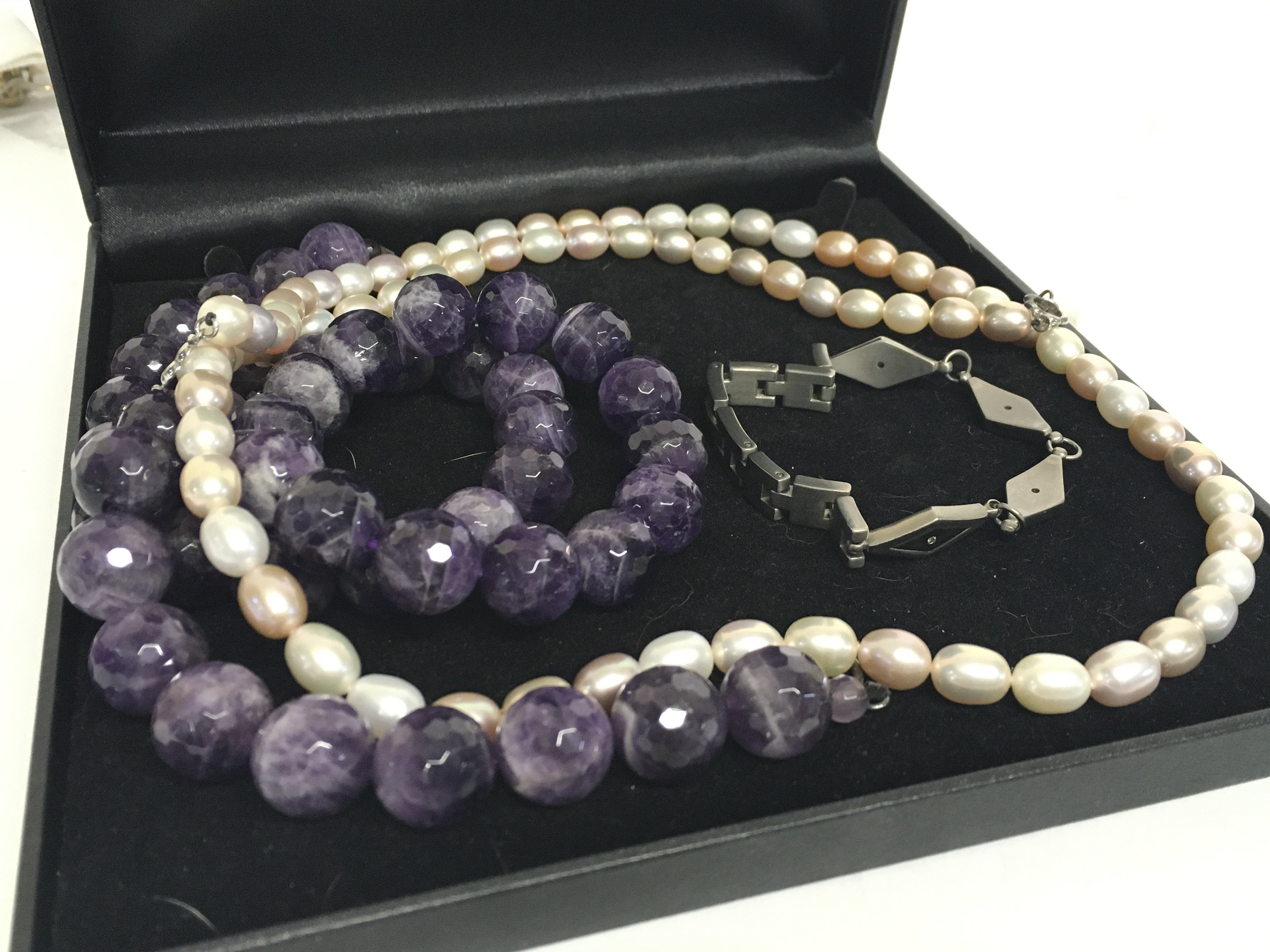 A pearl necklace, a beaded amethyst necklace, matching bracelet and a titanium bracelet. postage category B. NO RESERVE