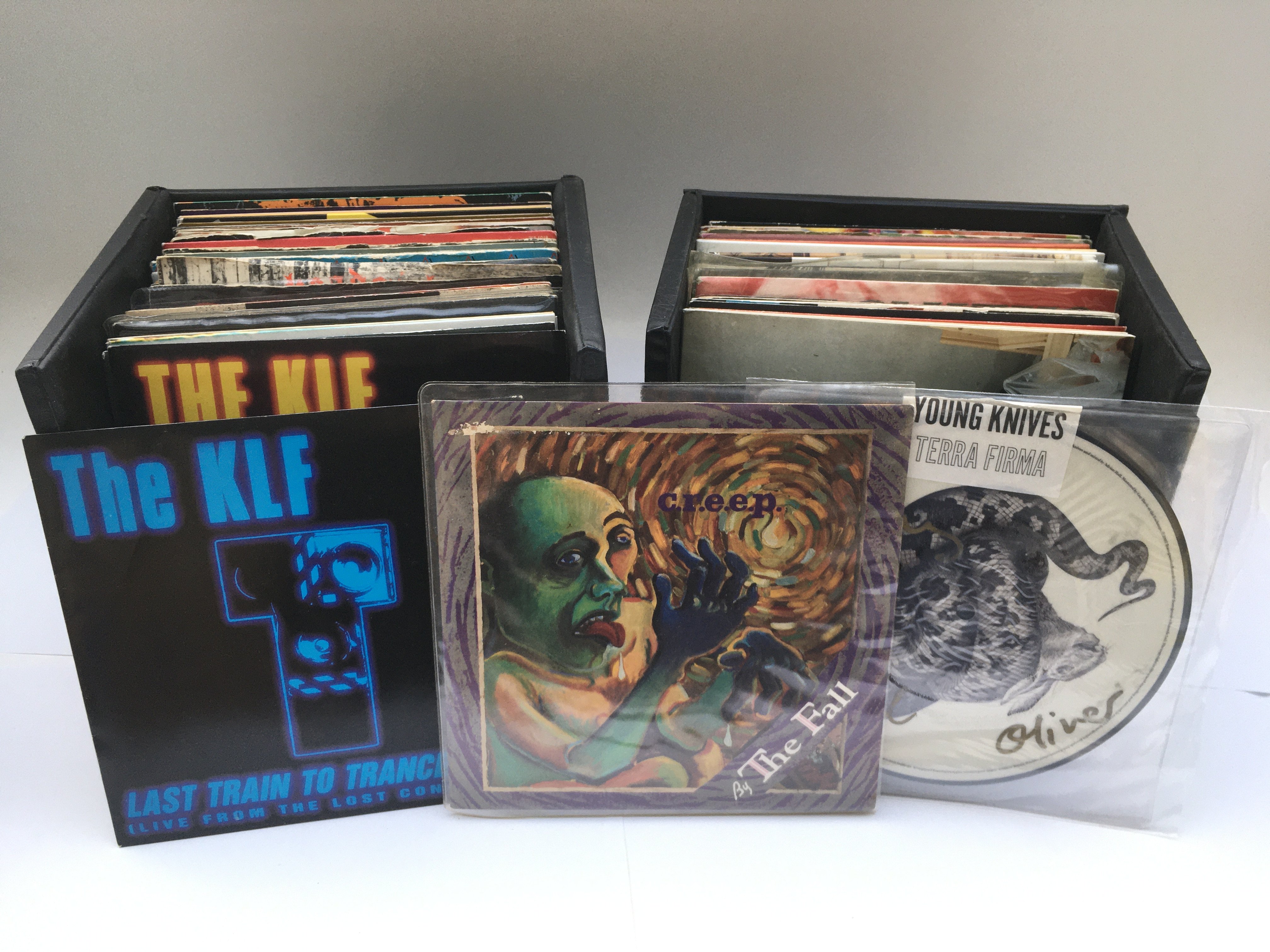 Two record cases of indie alternative and rock 7" singles by various artists including The Smiths, The Fall, KLF, Shed Seven and others. Includes some picture discs.