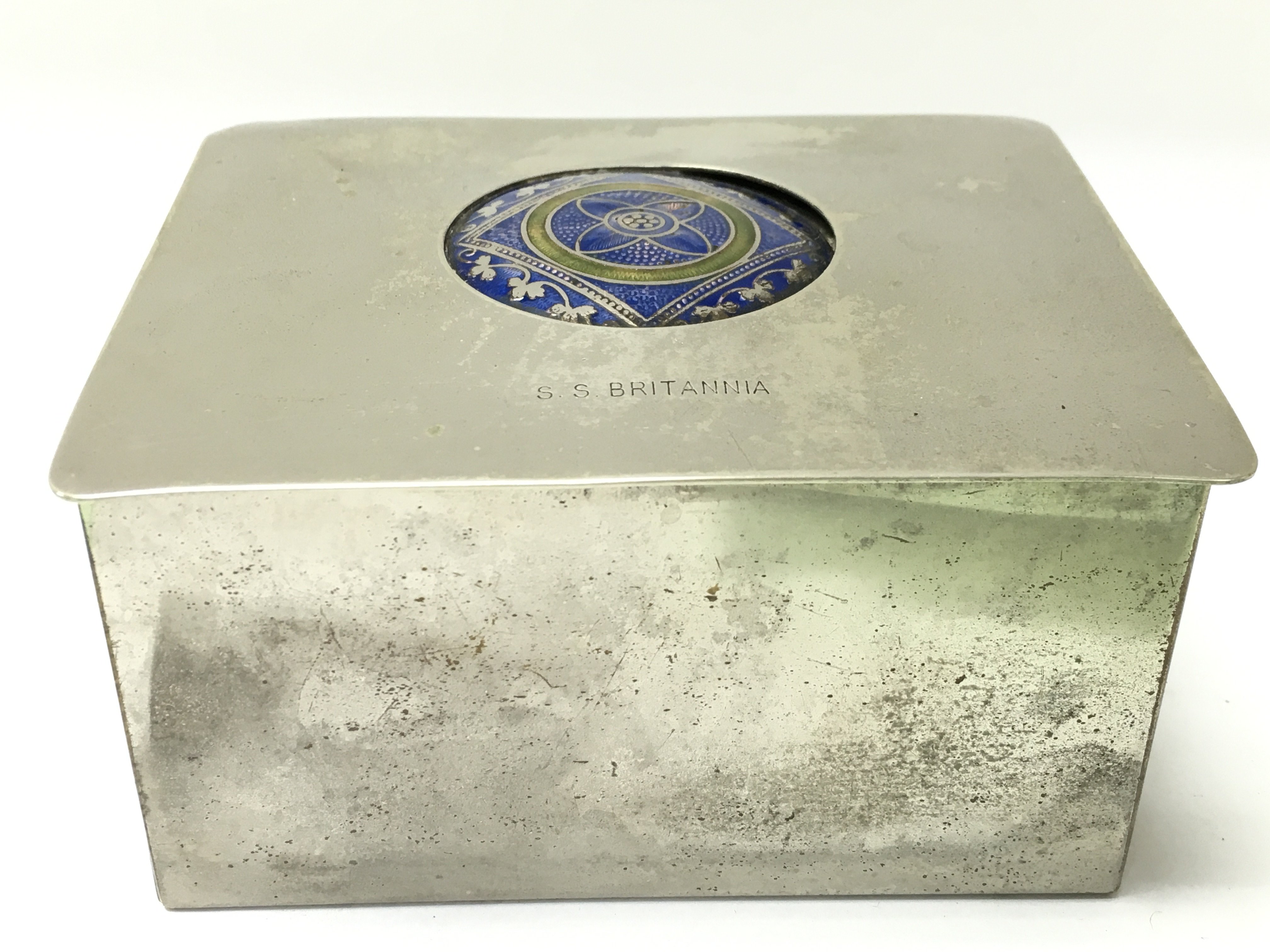 A 1920s S.S. Britannia silver plated cigarette box, with enamel design. Dimensions 9x10x5.5cm postage category B. NO RESERVE
