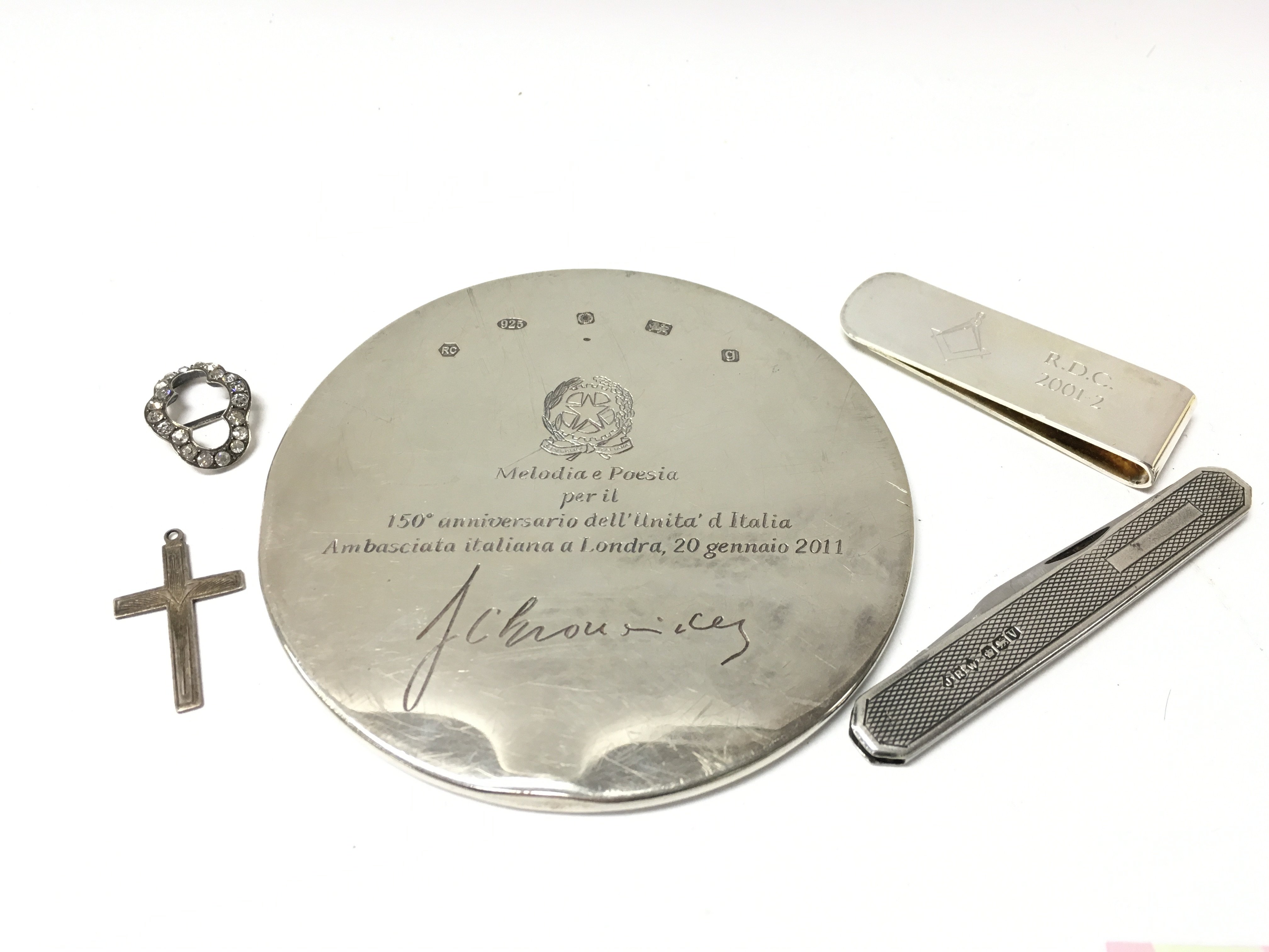 An assorted collection of silver items including a Sankey-Sheldon penknife, coaster, a non silver Masonic money clip etc. Postage category A. NO RESERVE