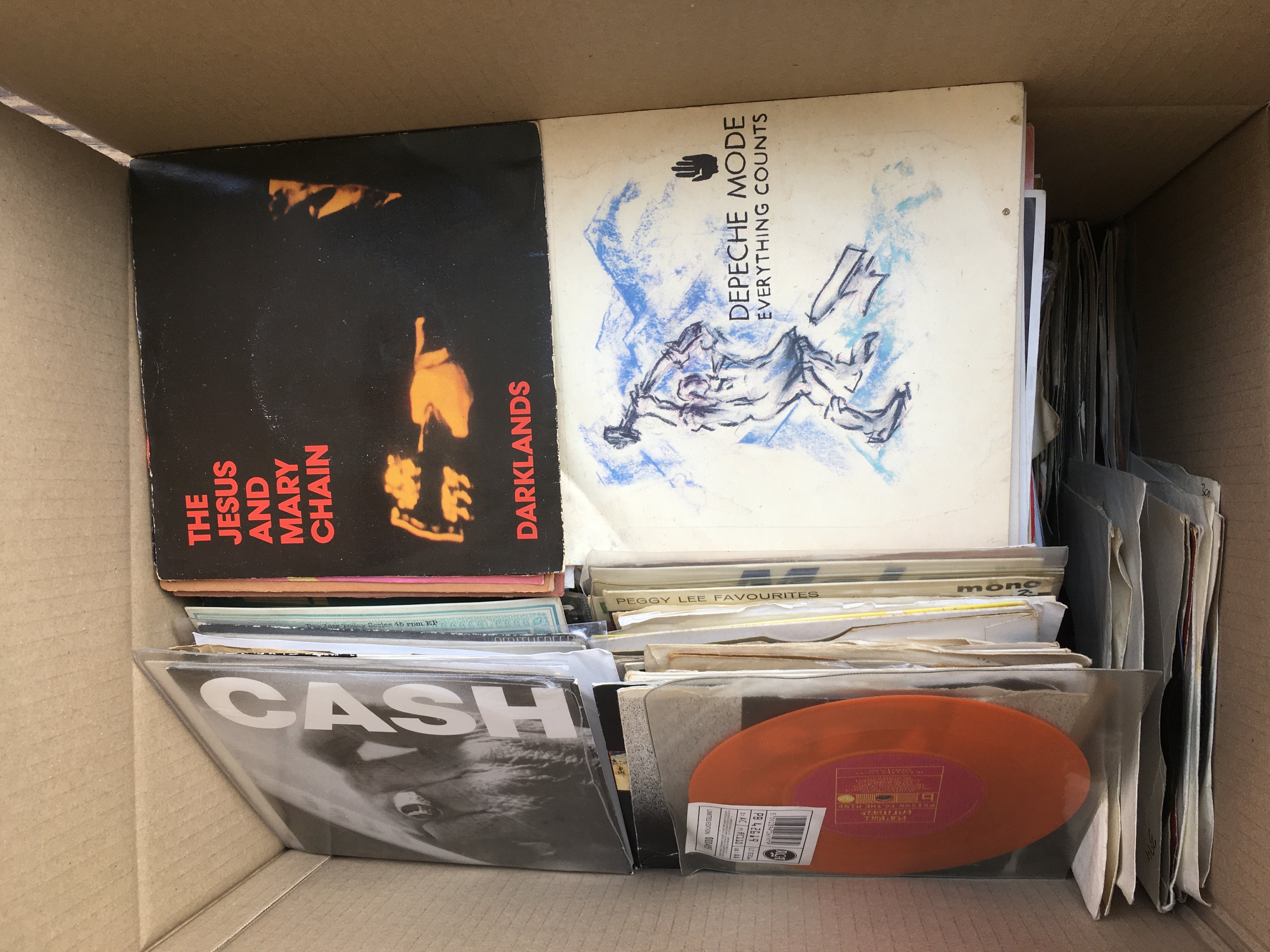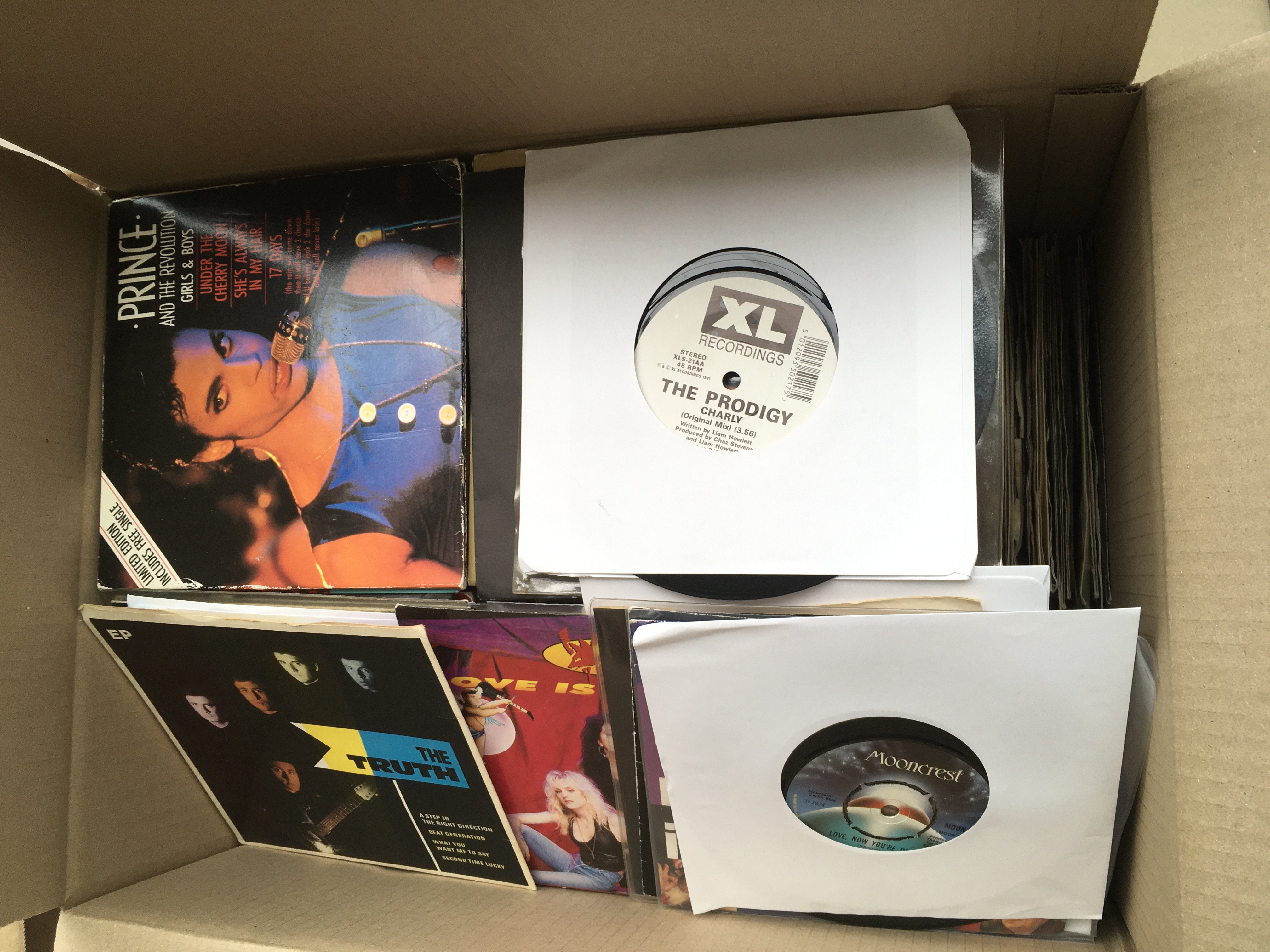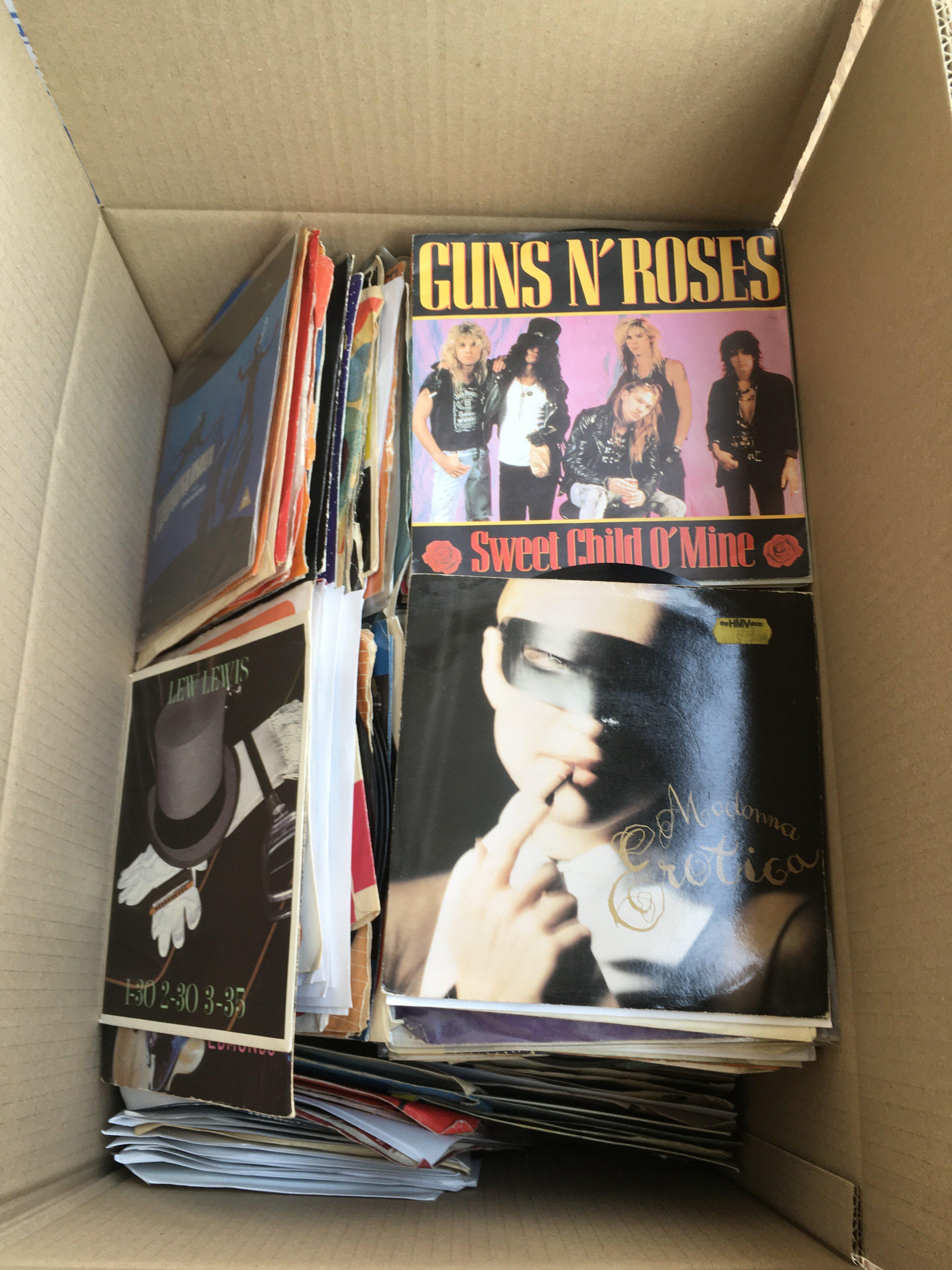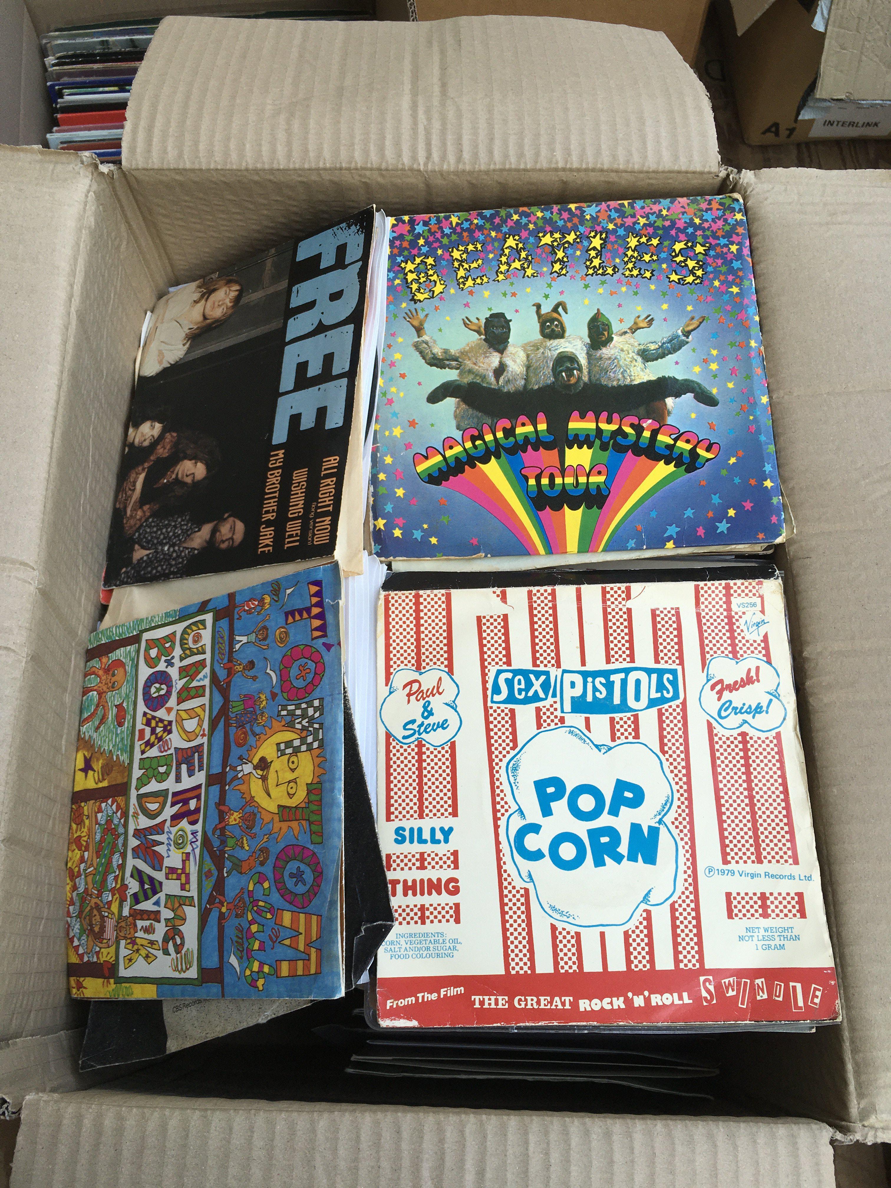 Four boxes of 7" singles by various artists including The Rolling Stones, The Beatles,