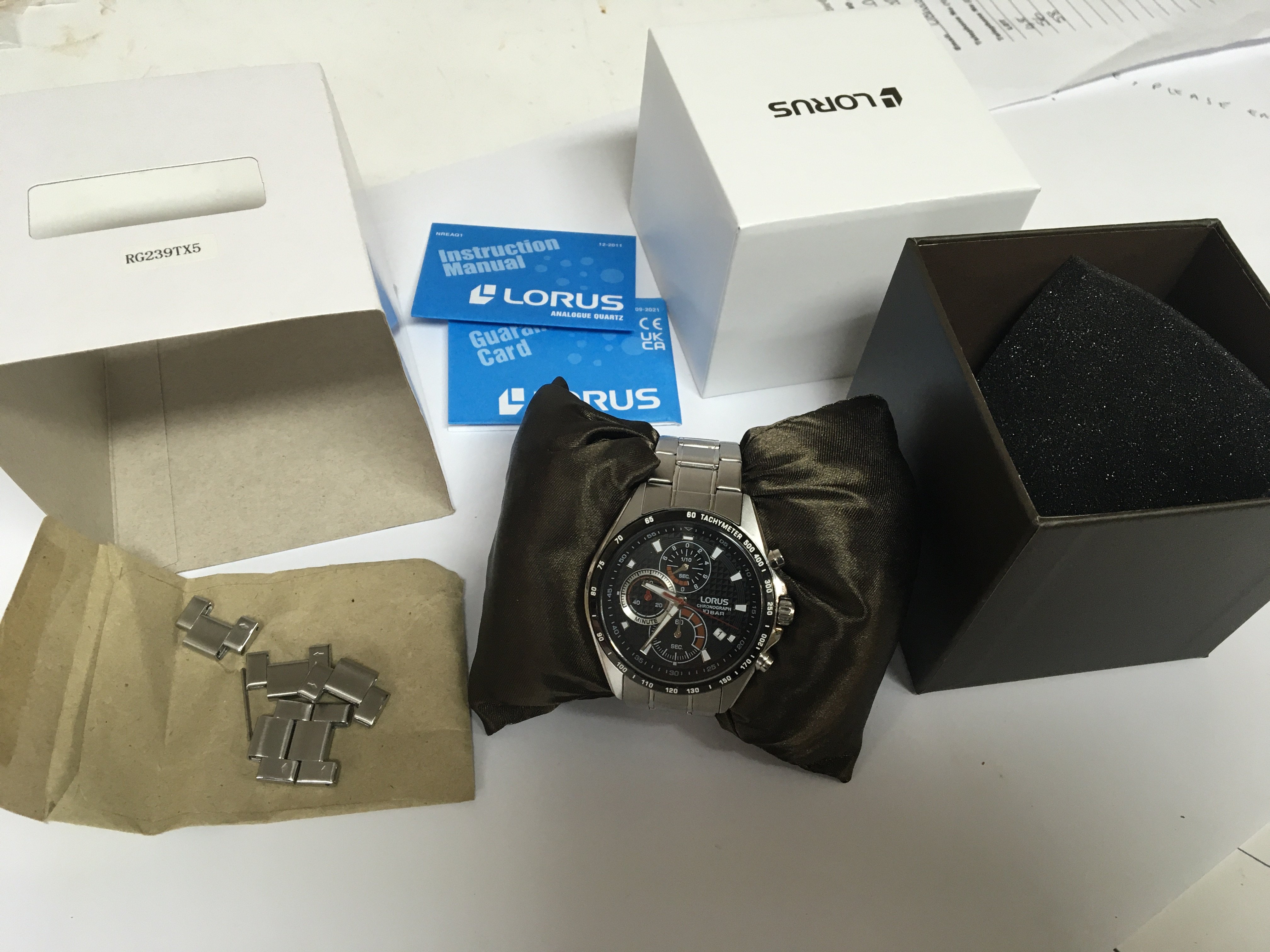 A Lorus 10 Bar Chronograph watch as new seen working with box paperwork and extra links. NO RESERVE