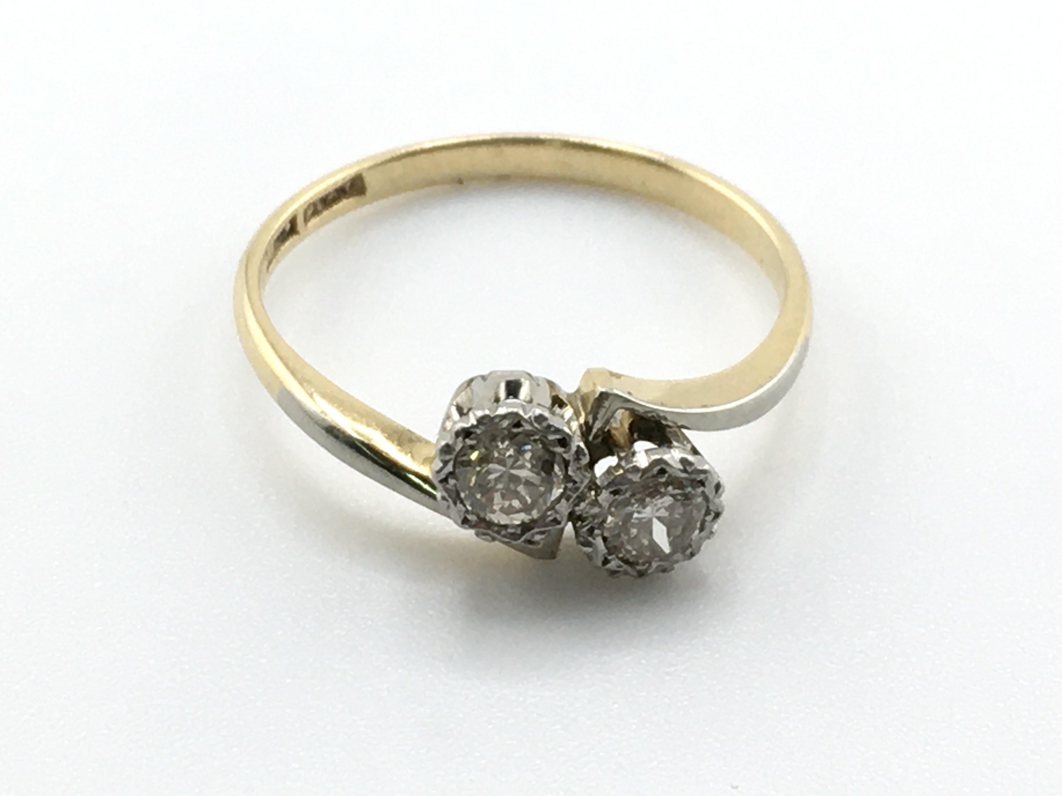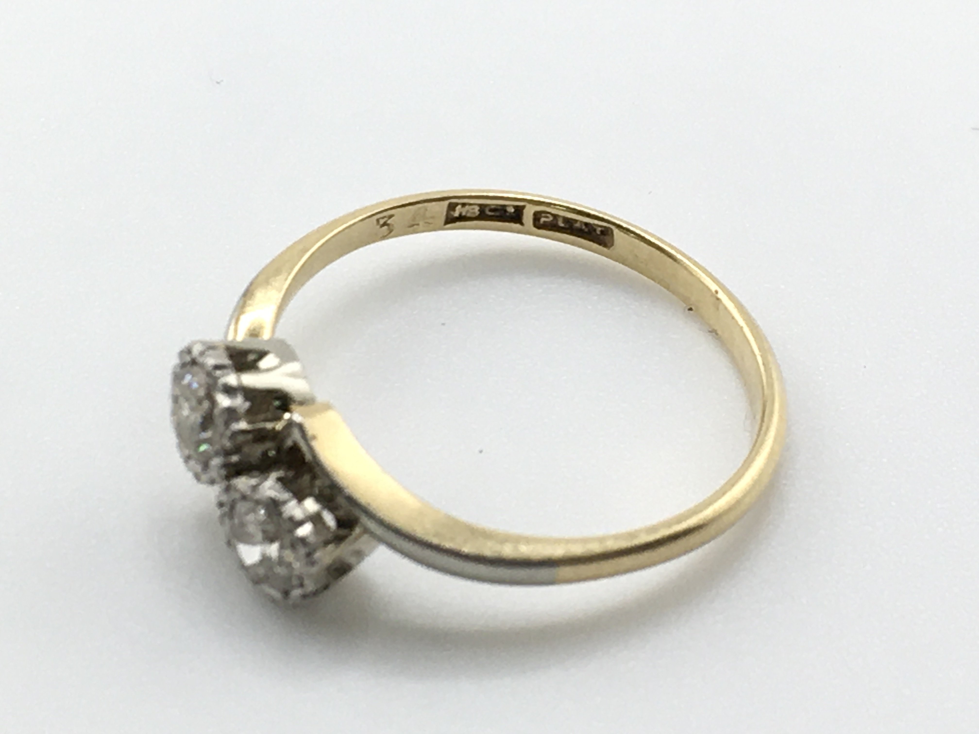 An 18ct gold and platinum cross over ring. Size N and 2.3gPostage A