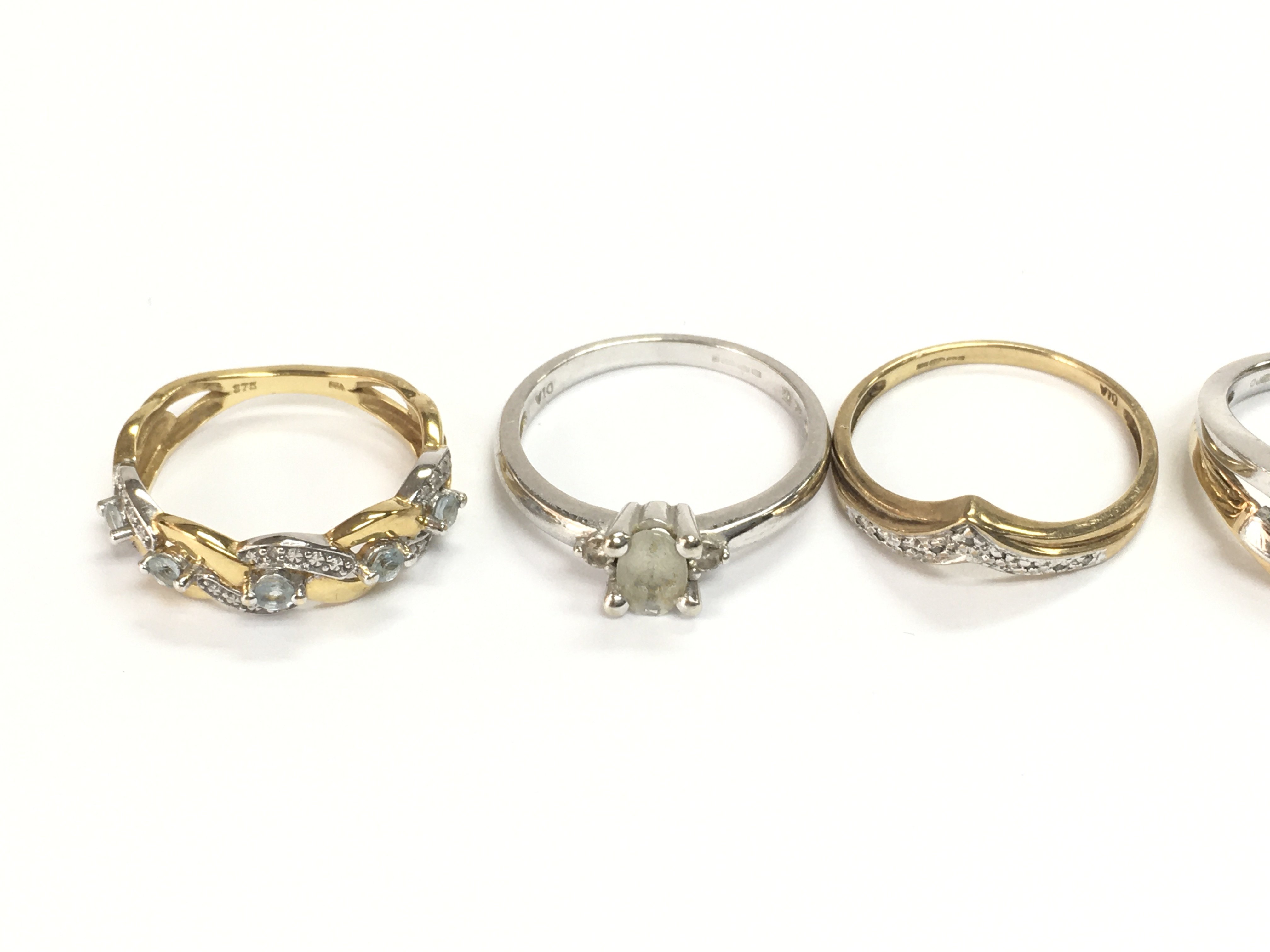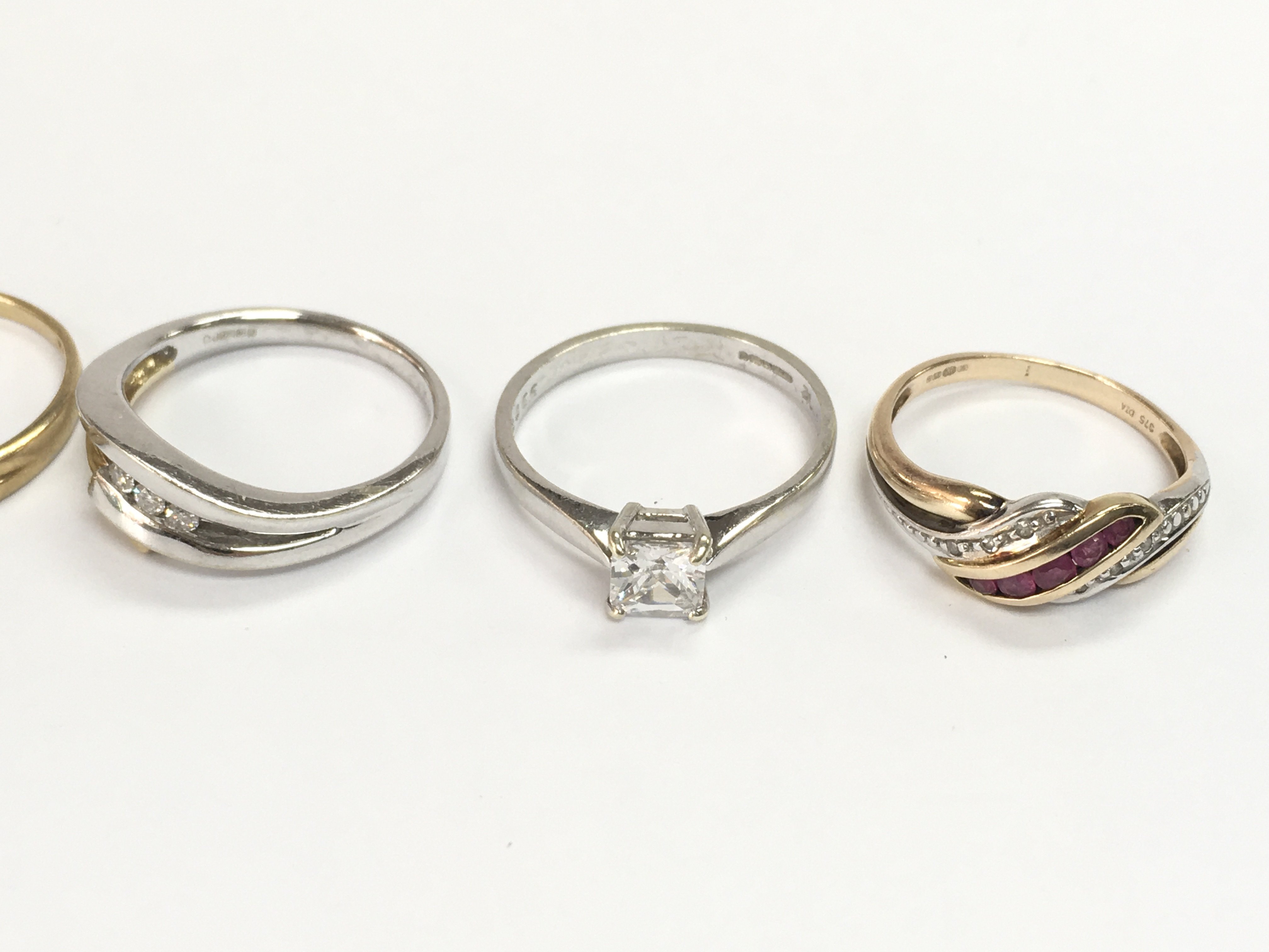Three 9ct white gold and three 9ct gold rings all set with assorted stones. 12.70g Postage A