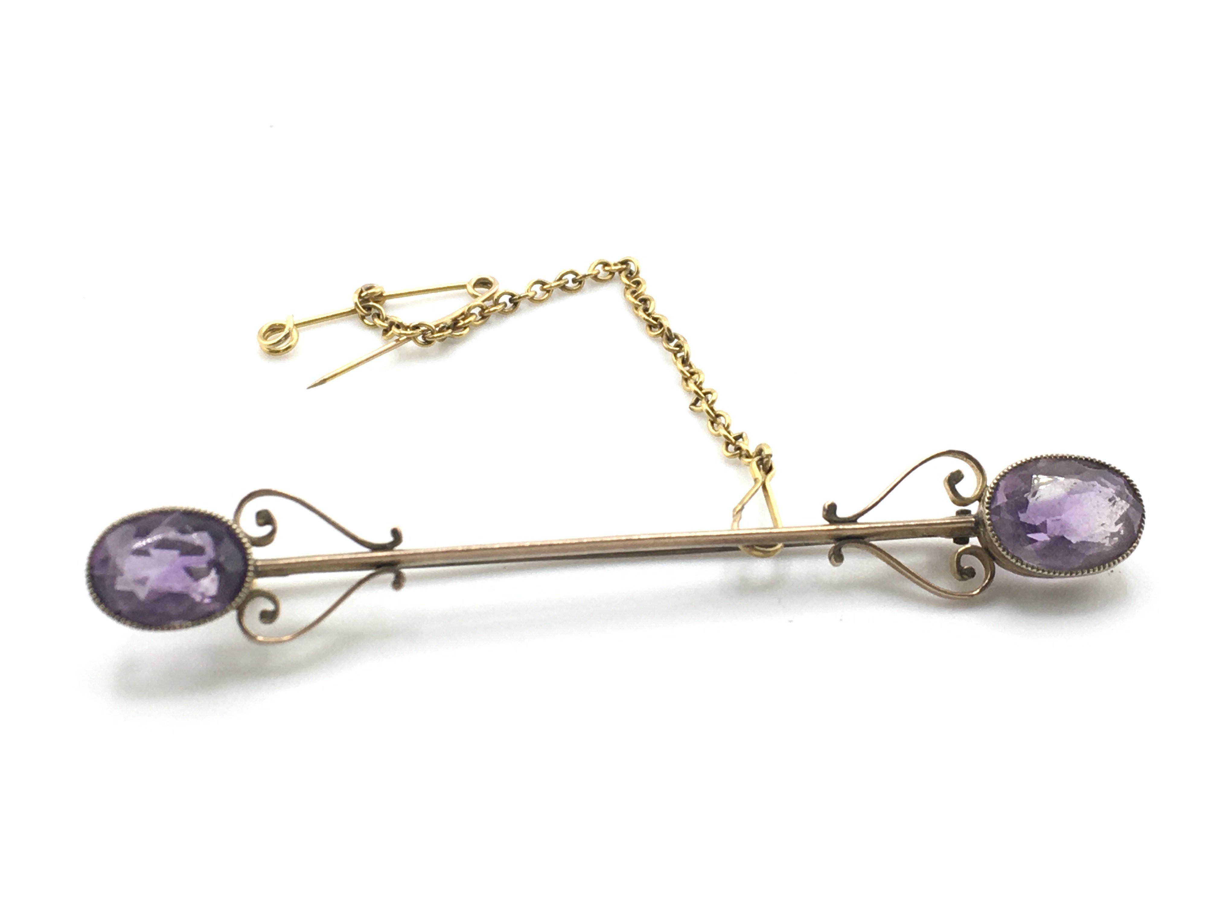 A 9ct gold brooch set with amethyst. 6cm and 3.4g.
