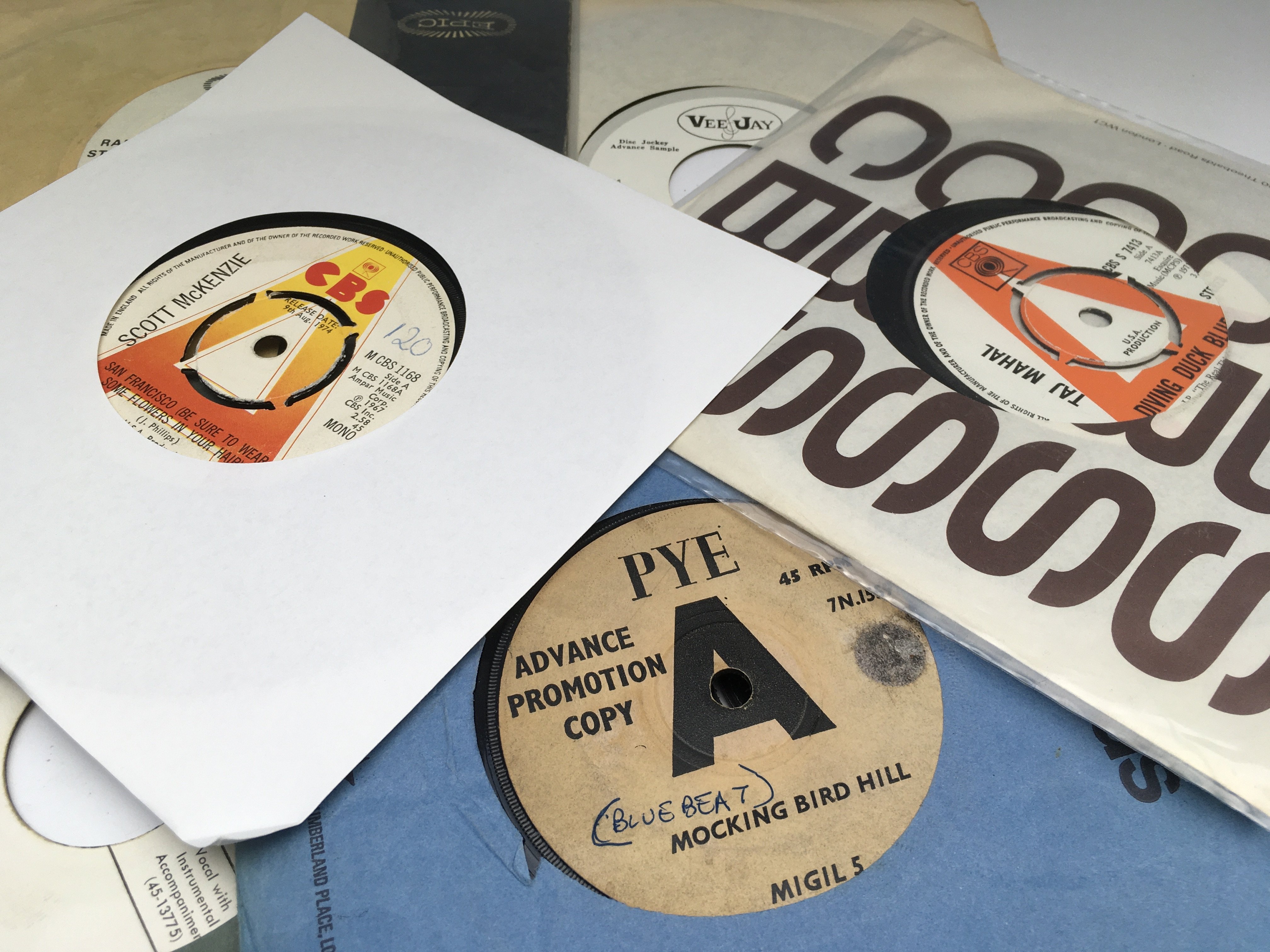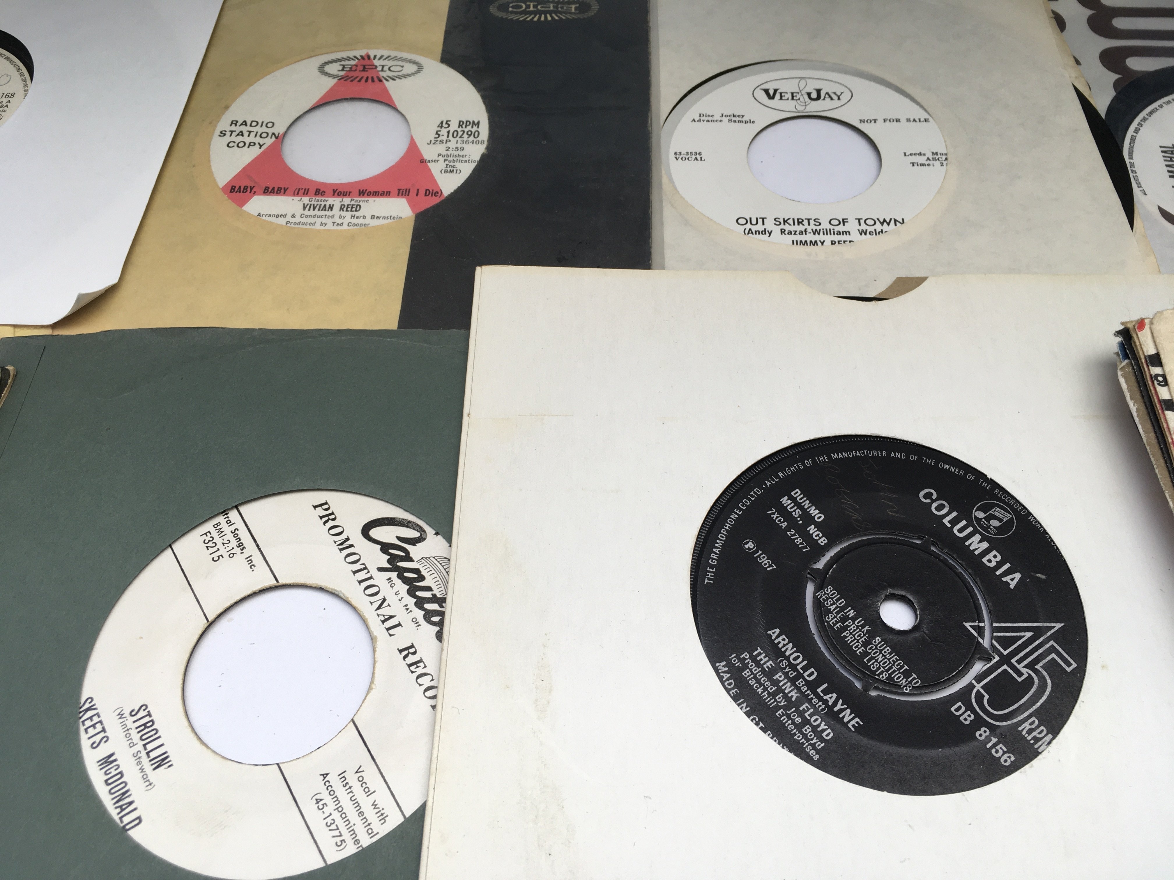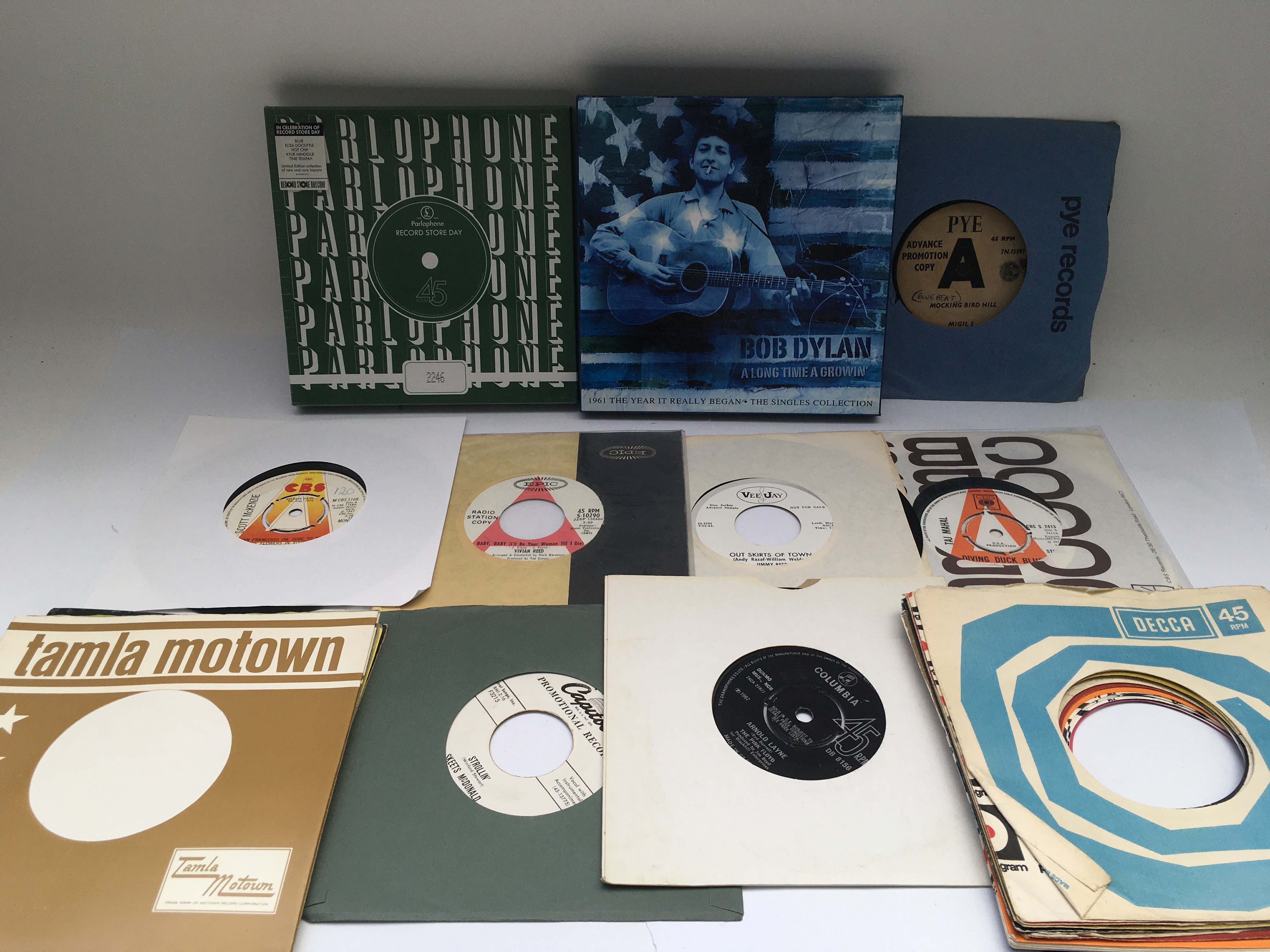 A collection of promo discs, a Pink Floyd 7" single of 'Arnold Layne', a Bob Dylan 7" singles box set, a sealed RSD 7" singles box set and some record company sleeves.
