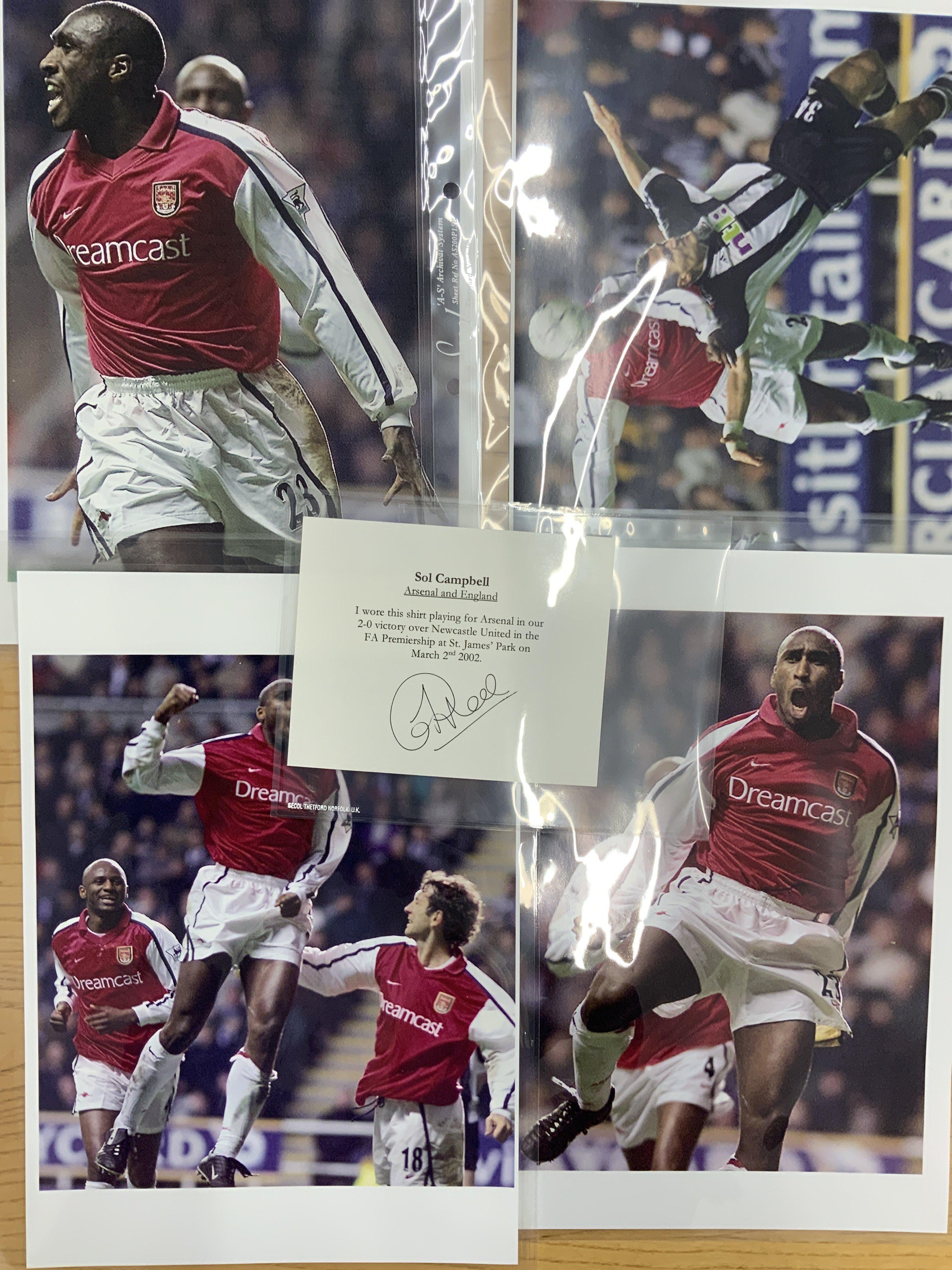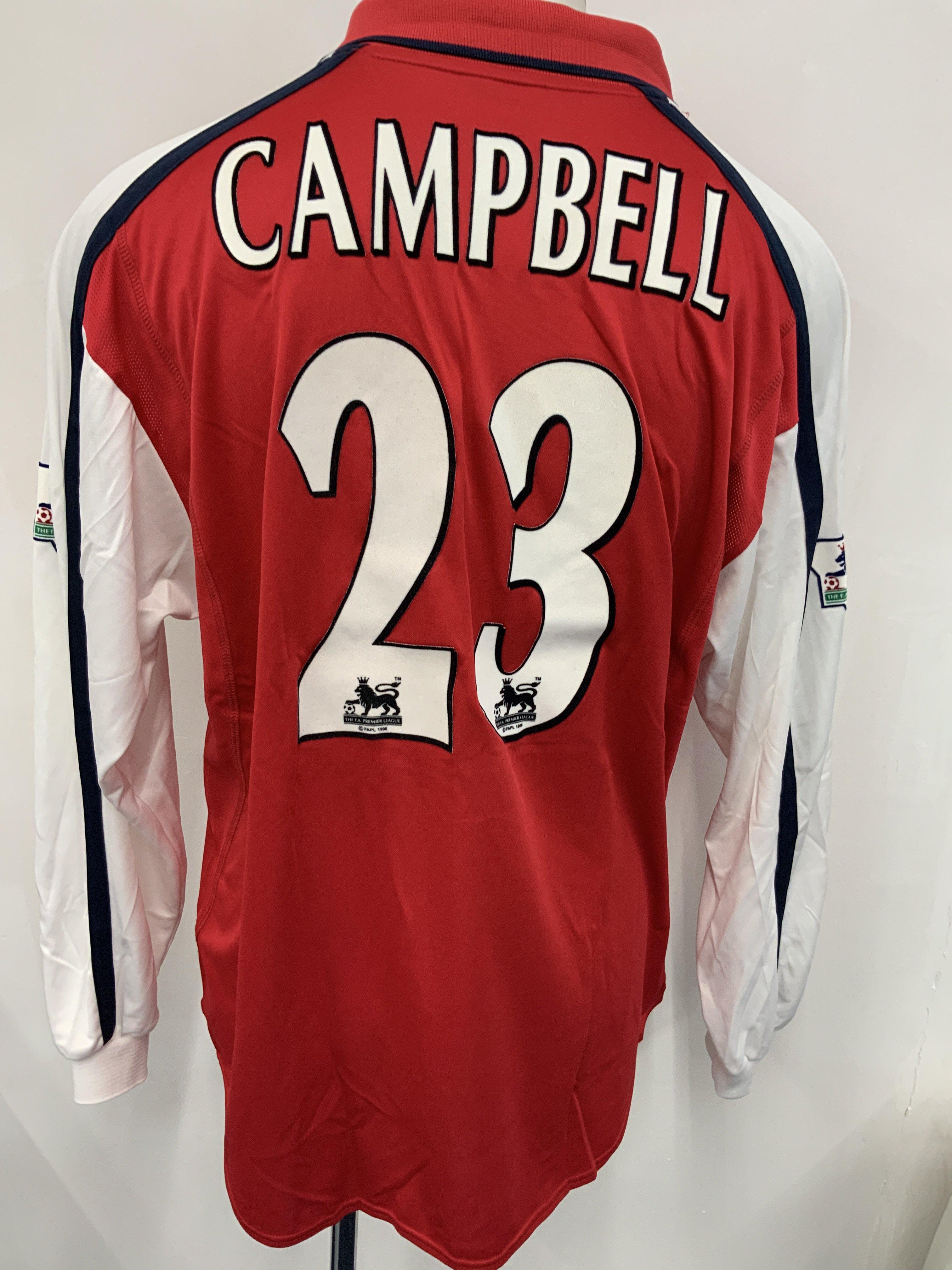 Arsenal 2001 - 2002 Match Worn Football Shirt: Long sleeve red home kit with Premier League badging to sleeves. Goalscorer Campbell with his number 23 to rear. Dreamcast sponsor. Signed COA stating I wore this shirt v Newcastle on March 2nd 2002. 4 press photos of Campbell wearing this shirt in the match where he scored.