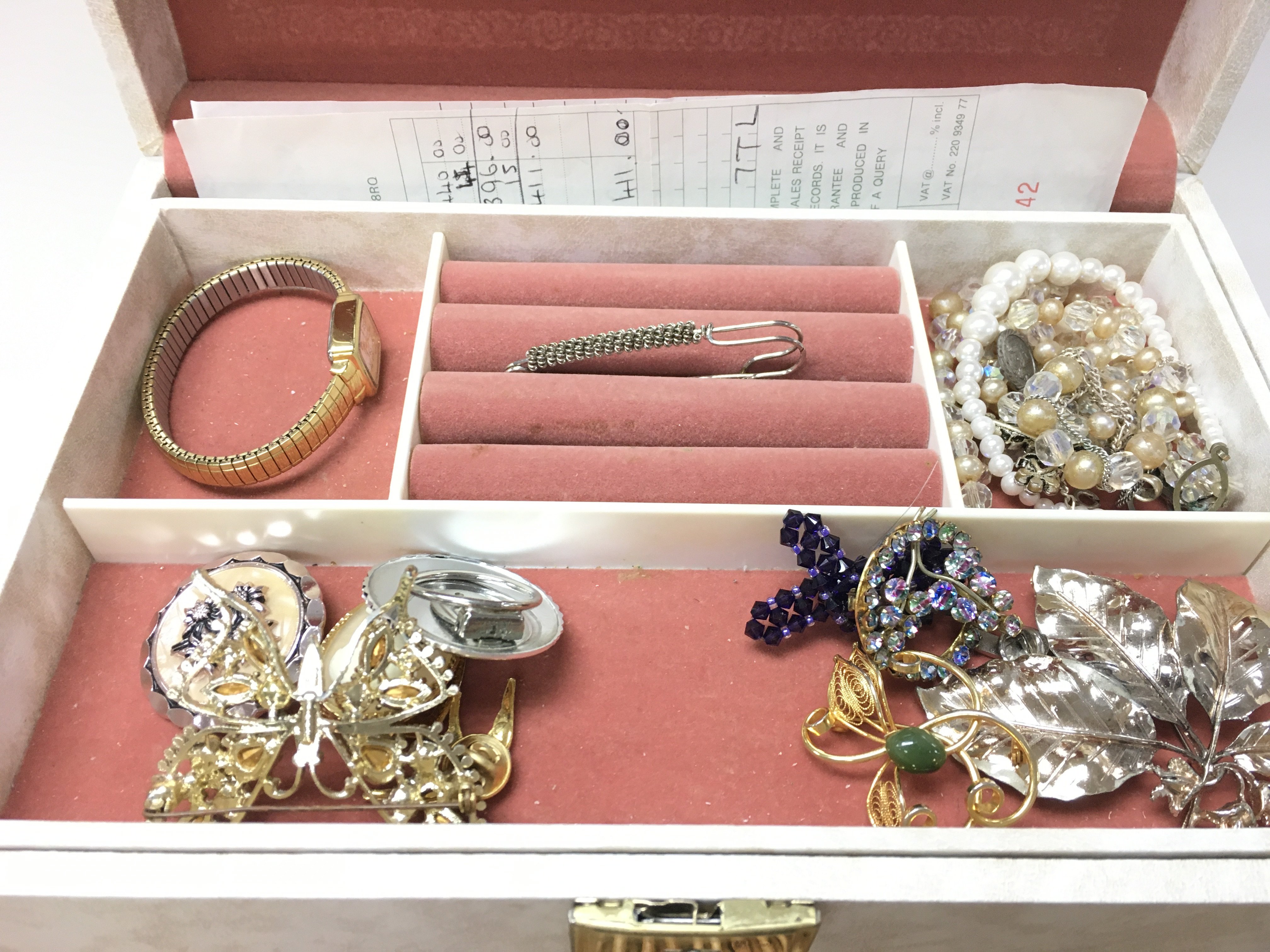 A mixed collection of costume jewellery including a silver necklace and a silver pair of earrings, brooches etc. NO RESERVE