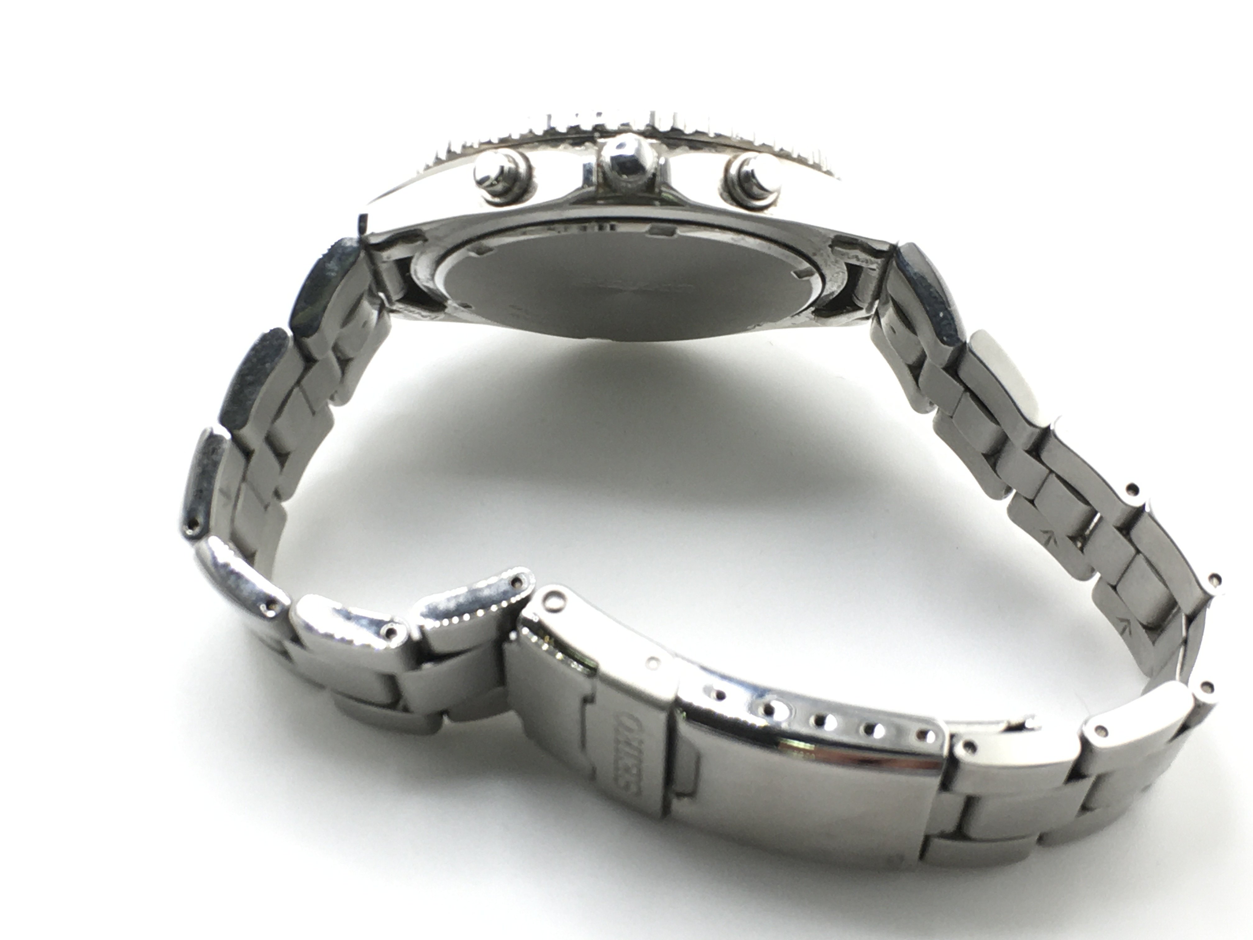 A seiko chronograph wrist watch. Blue dial seen running with 40mm case.