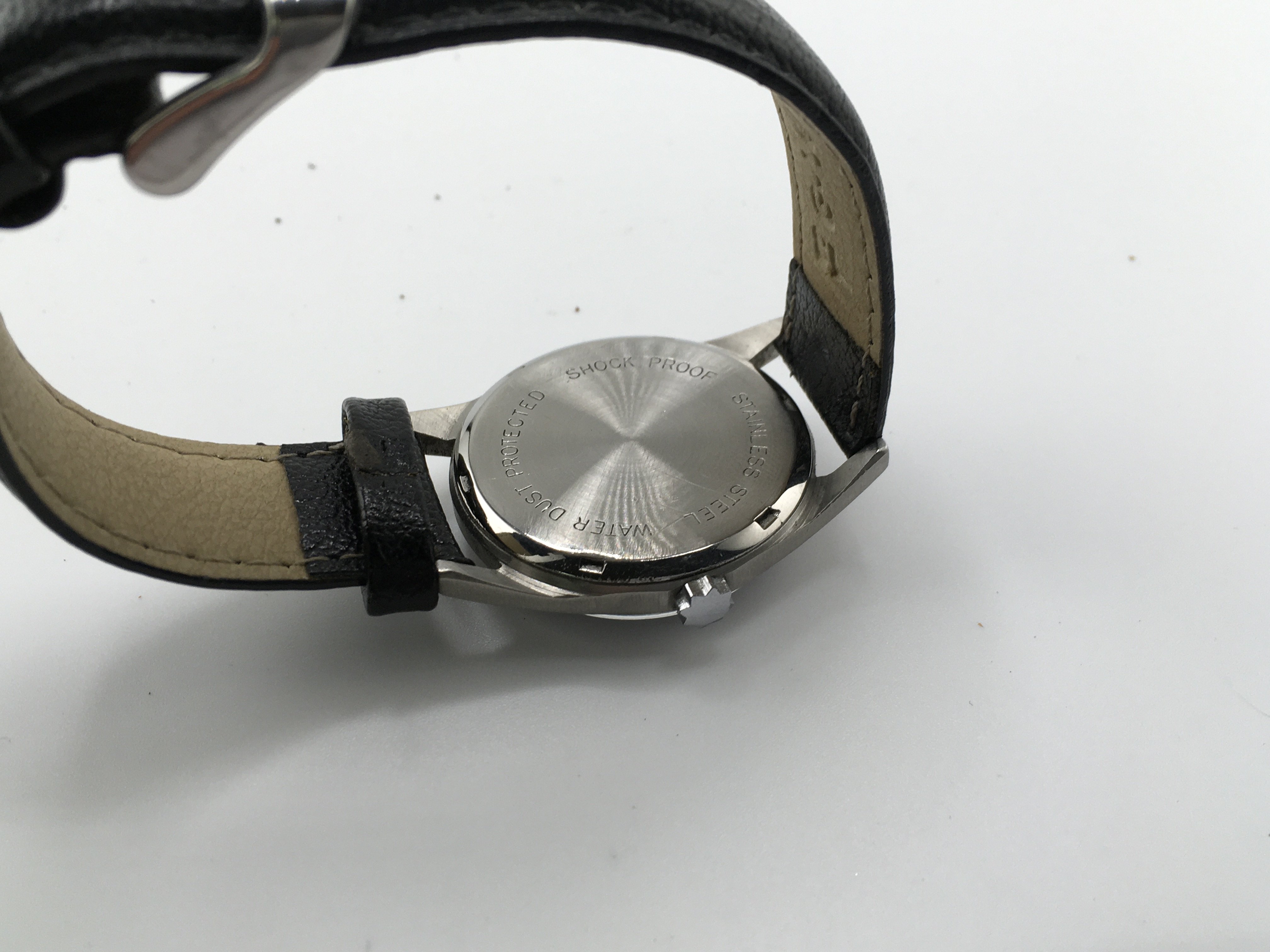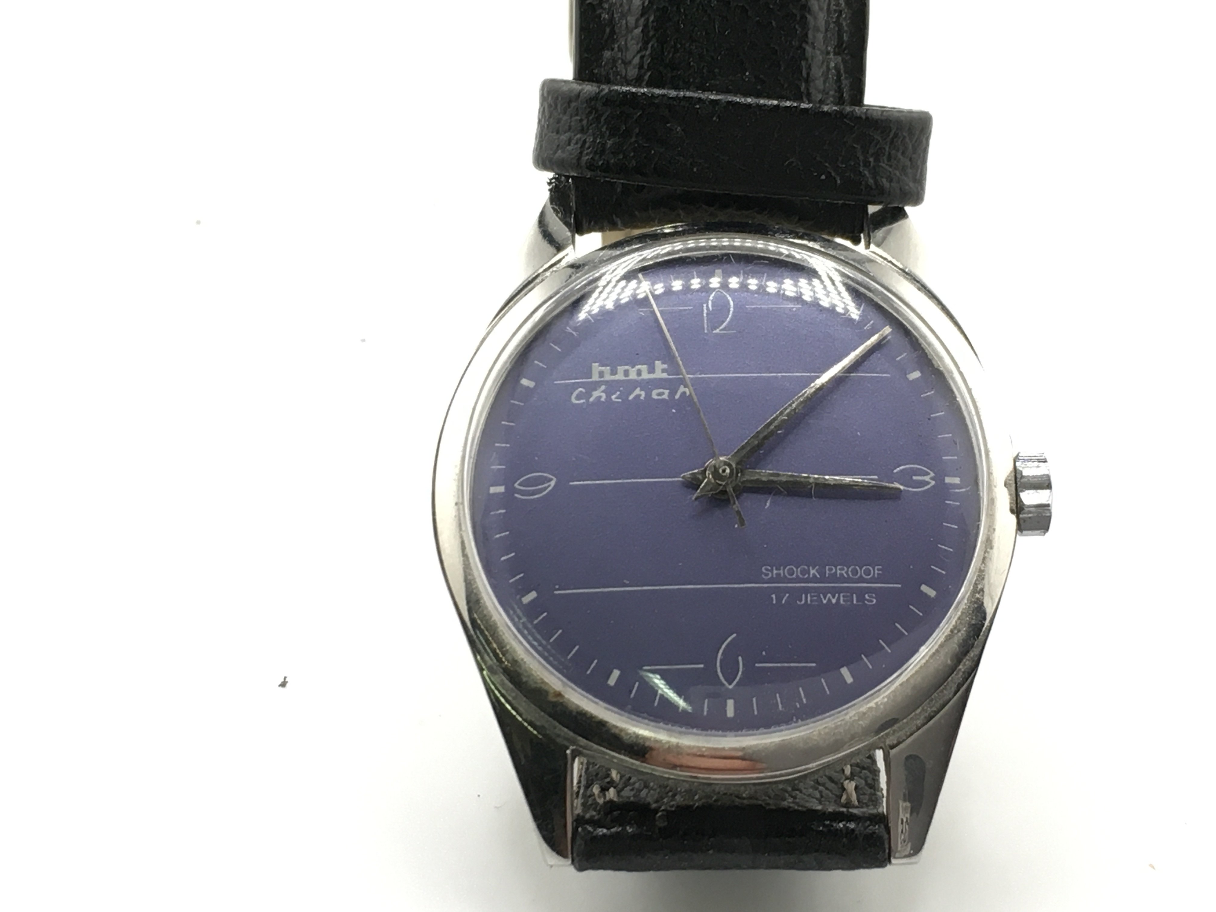 A HMT Chinan watch with an interesting dial and black leather strap. 35mm case. Not seen running. NO RESERVE