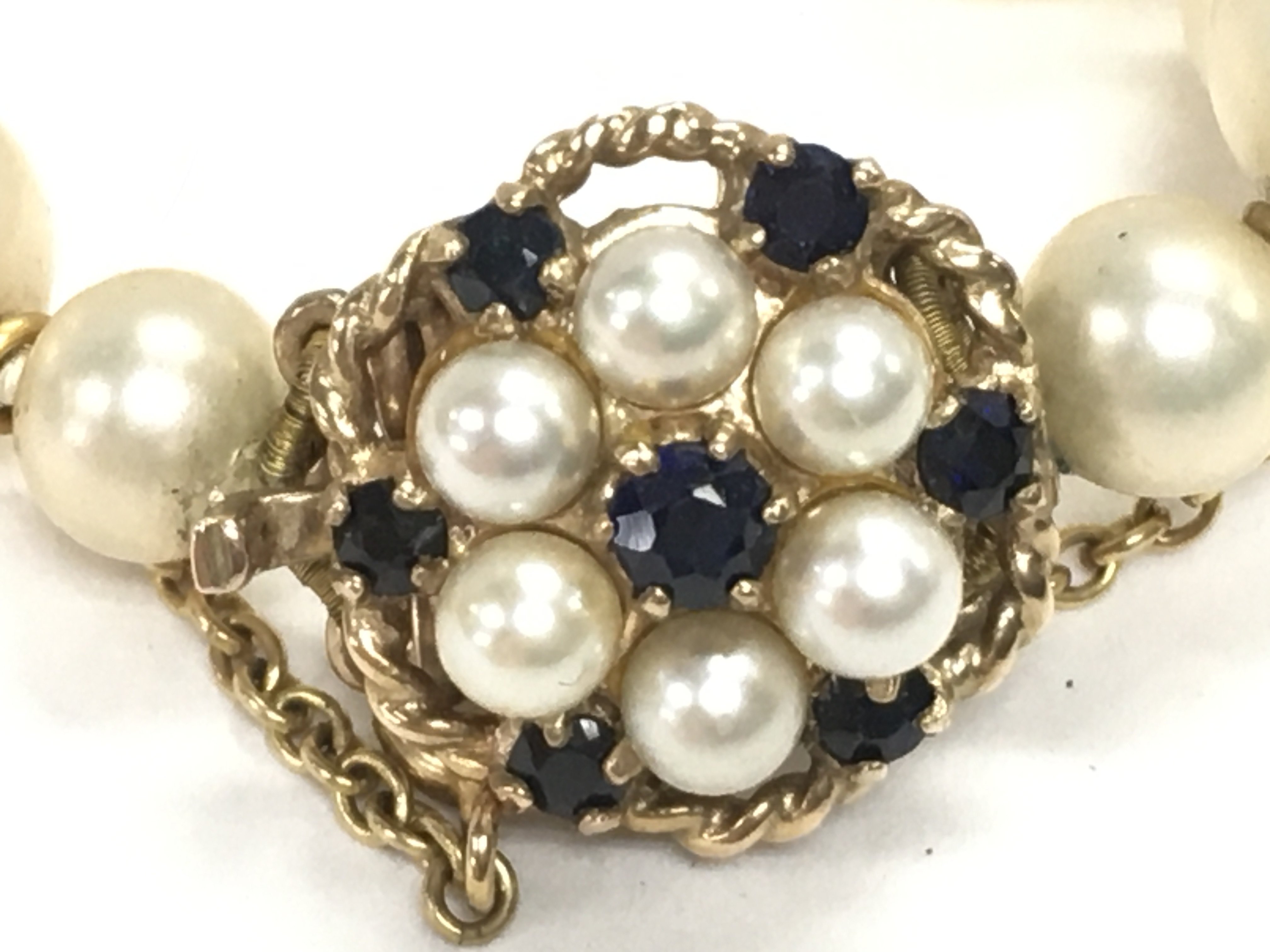 A string of simulated pearls with a 9 carat gold clasp set with blue sapphires and cultured pearls. NO RESERVE