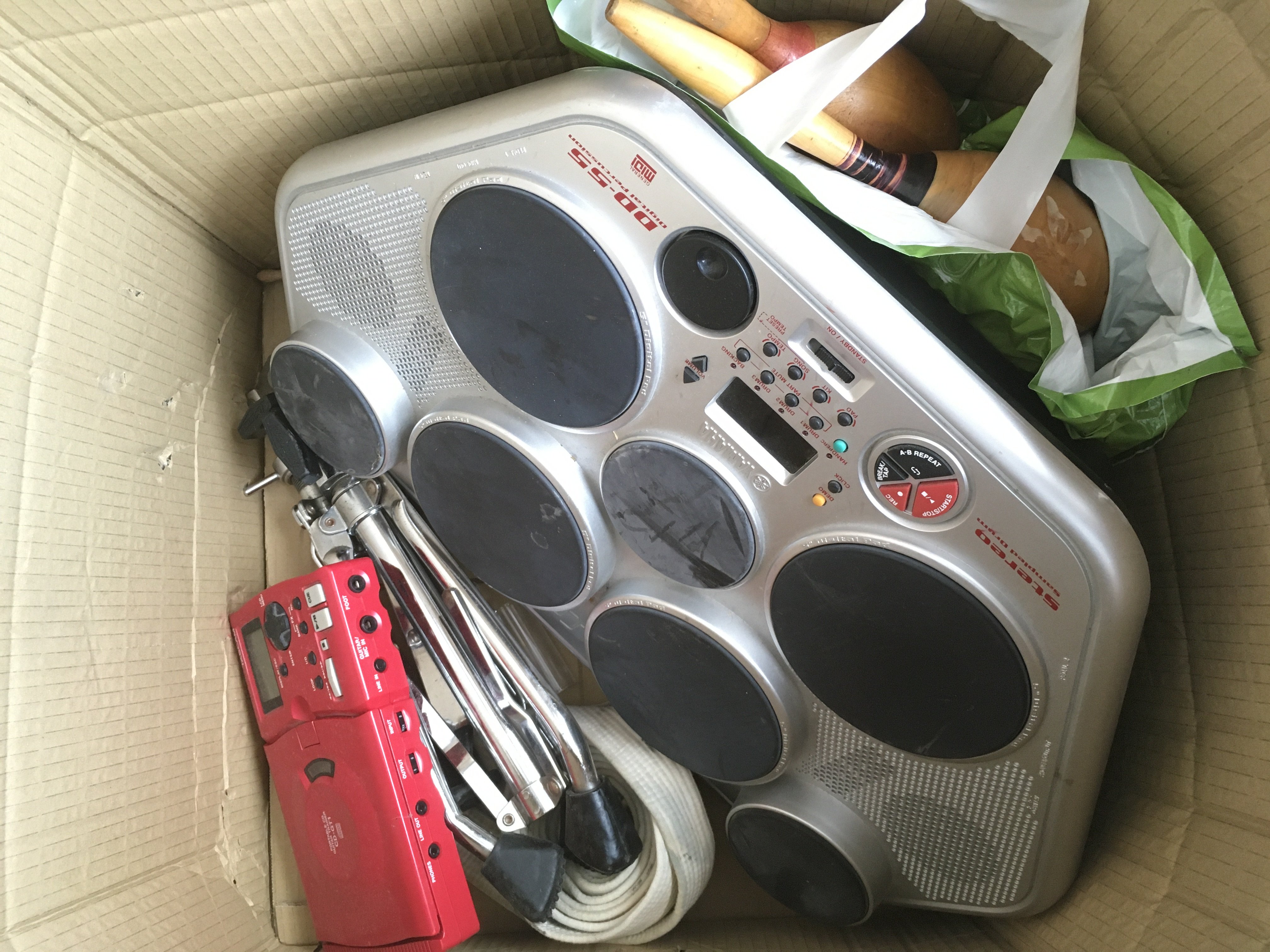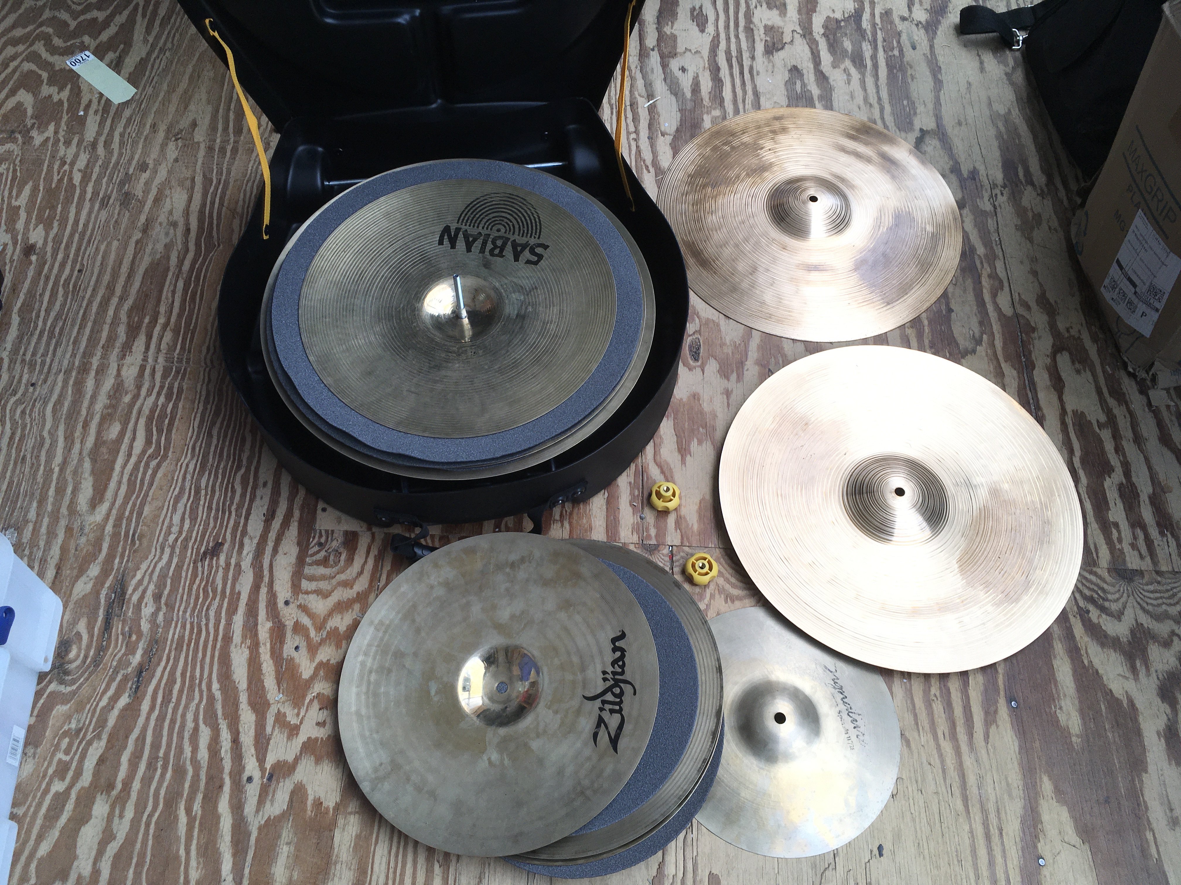 A case of cymbals including some Zildjian and Sabian examples plus a box of percussion instruments and a Yamaha DD-55 drum pad set (2).