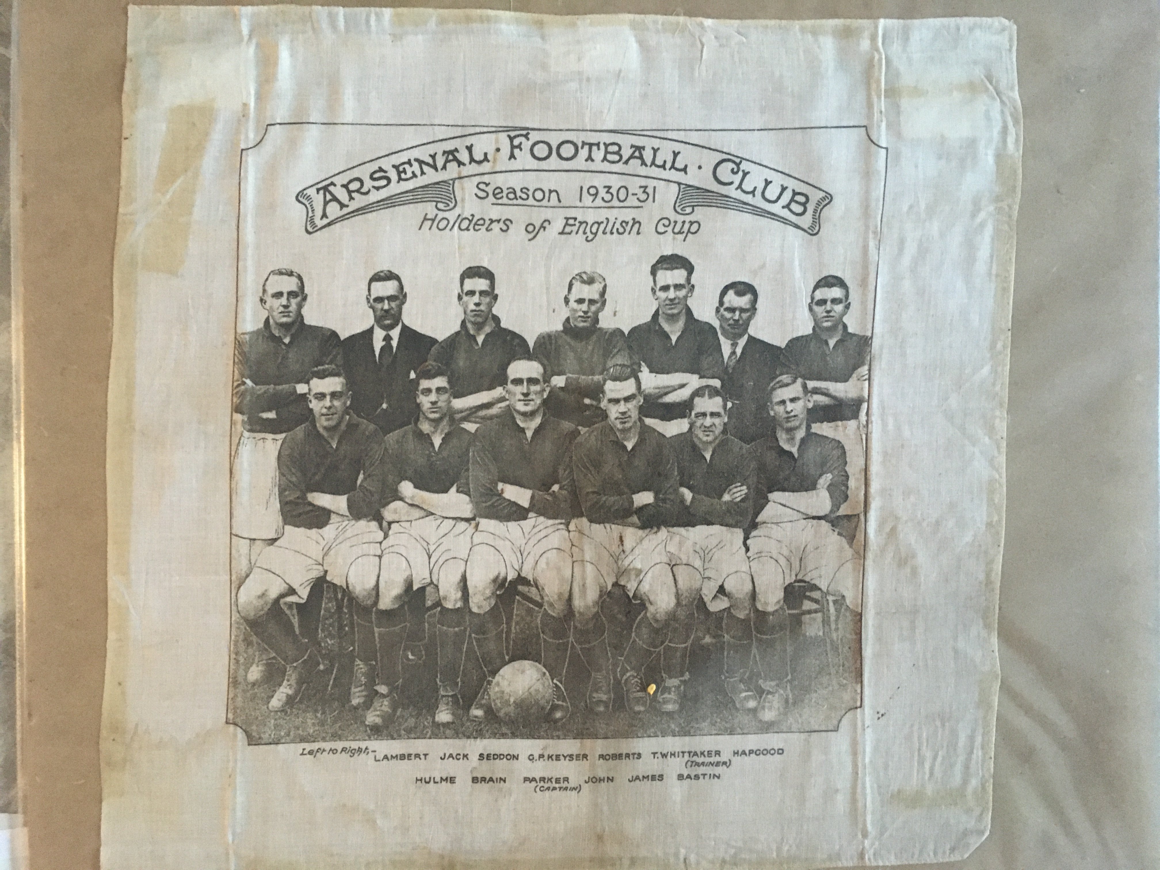 1930 Arsenal FA Cup Winners Football Handkerchief: Large cloth handkerchief with team group of the 30-31 team stating Holders of the English Cup with players listed below. Few stains but quite good for 93 years old.