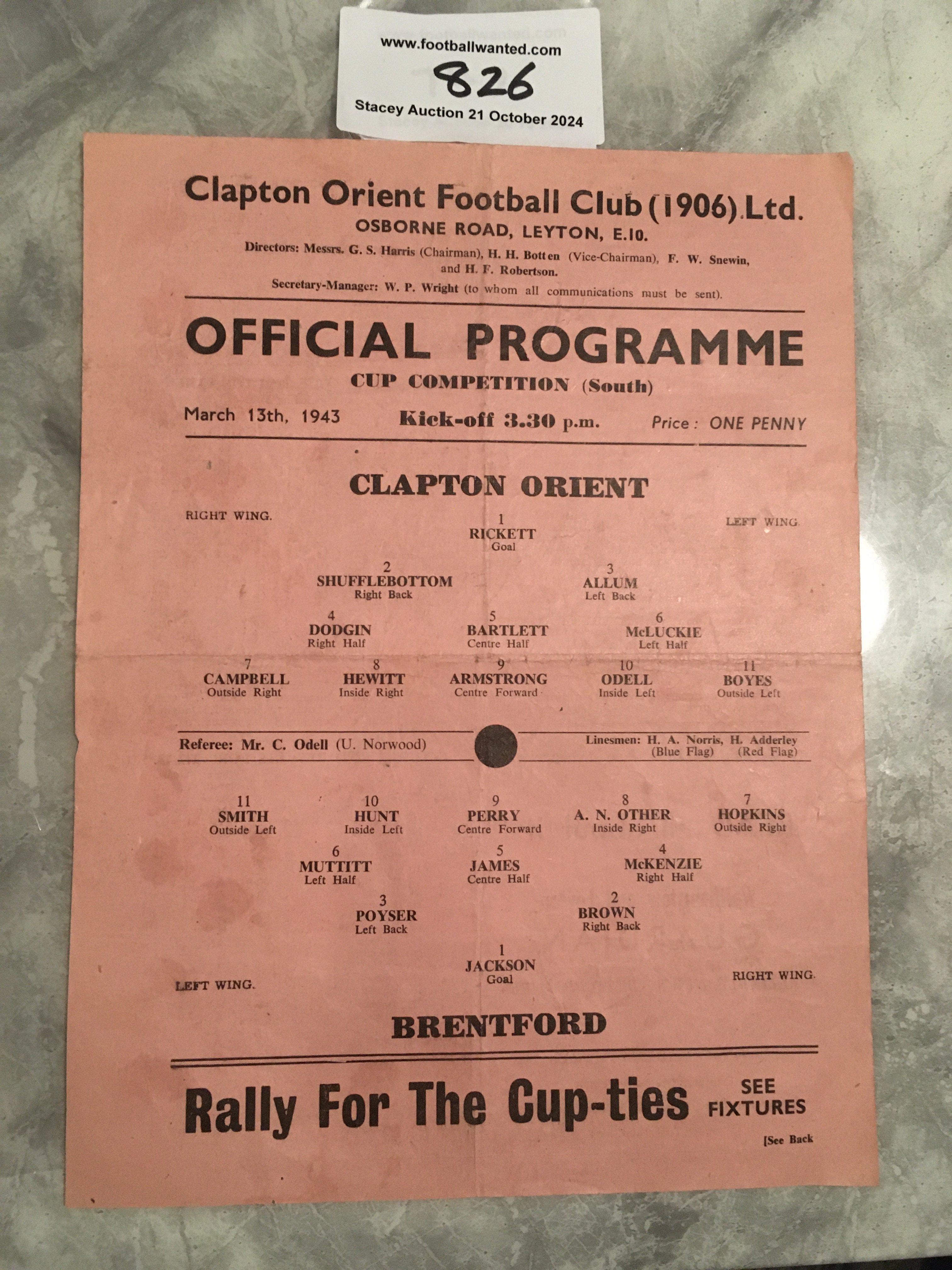 42/43 Clapton Orient v Brentford Football Programme: Excellent condition salmon single sheet cup match with no team changes. Light fold.