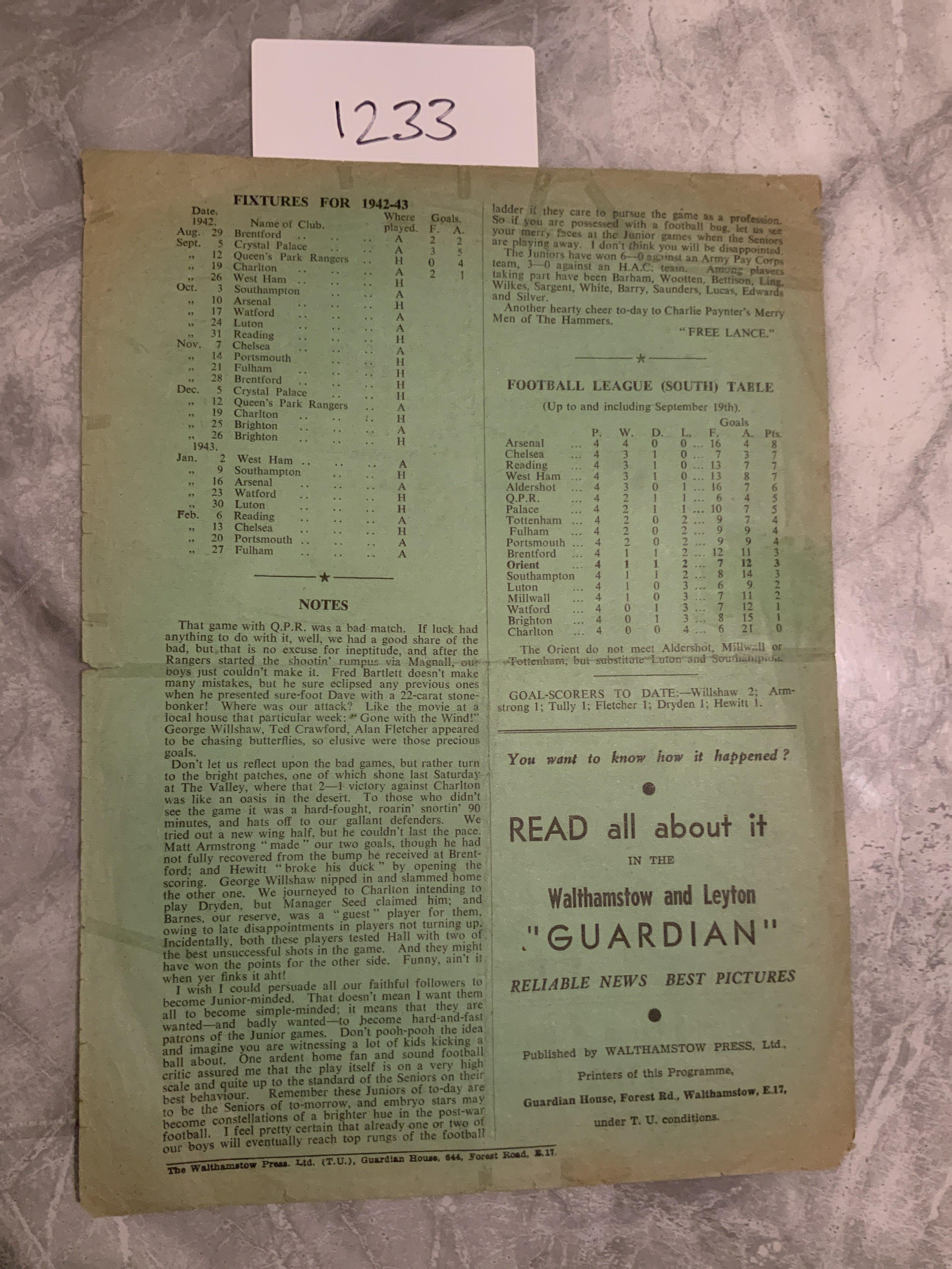 42/43 Clapton Orient v West Ham Football Programme: Good condition single sheet league match with no team changes.