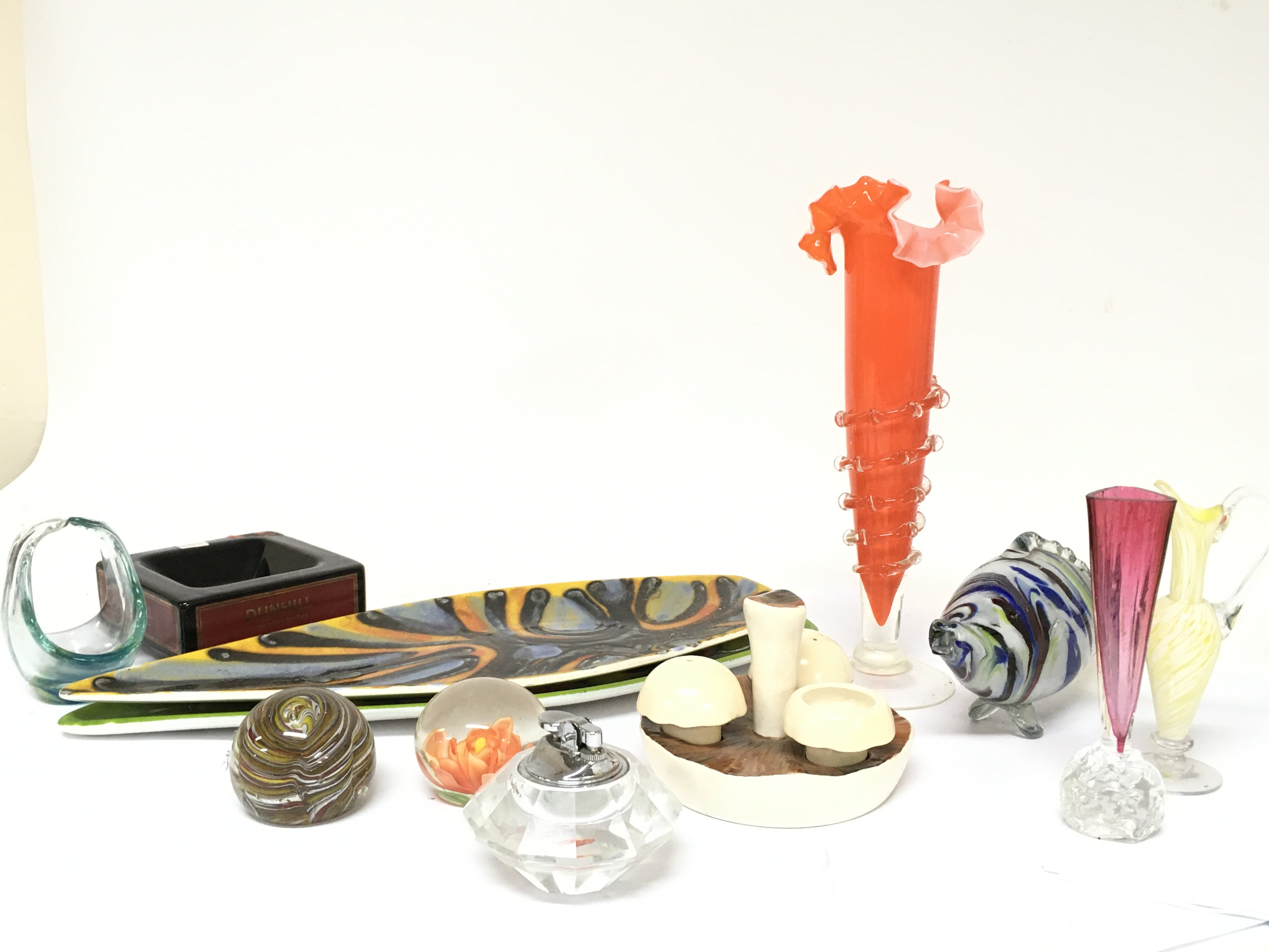 A Collection of ceramics including Poole dishes, coloured art glass, paperweights, a Dunhill ceramic ashtray etc, this lot cannot be posted